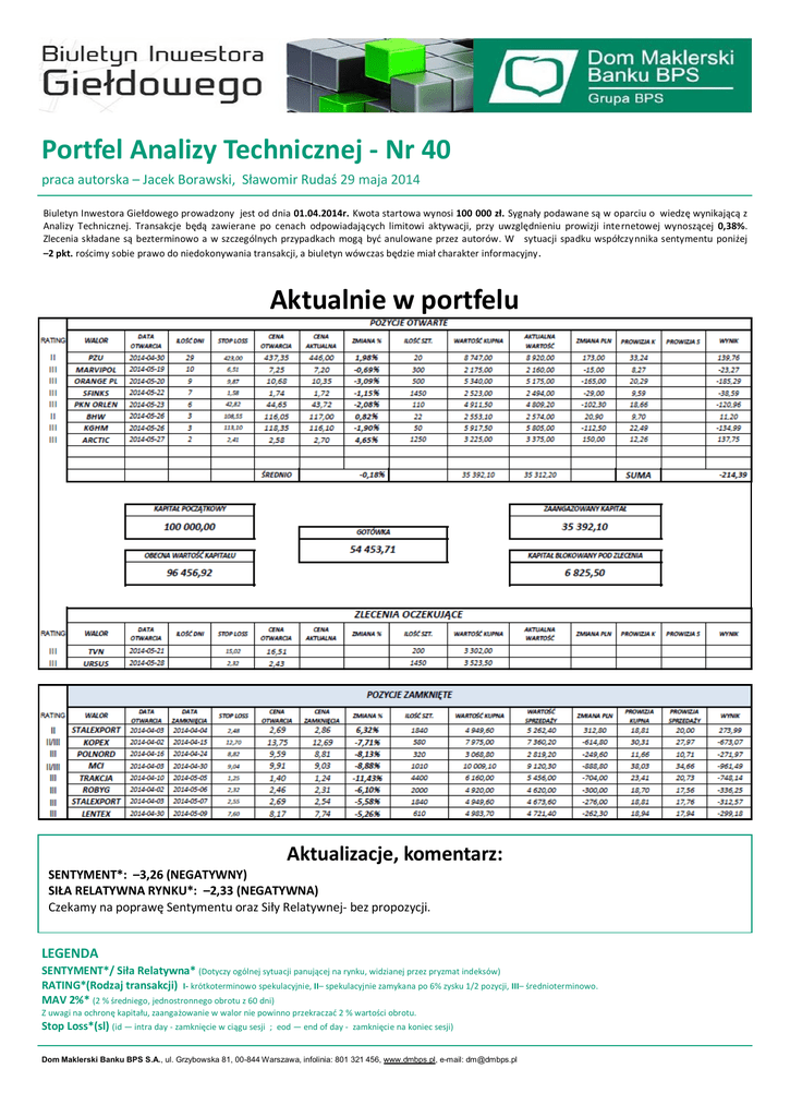 Portfel Analizy Technicznej - Nr 40 praca autorska – Jacek Borawski, Sławomir Rudaś 29 maja 2014 Biuletyn Inwestora Giełdowego prowadzony jest od dnia 01.04.2014r. Kwota startowa wynosi 100 000 zł. Sygnały podawane są w oparciu o wiedzę wynikającą z Analizy Technicznej. Transakcje będą zawierane po cenach odpowiadających limitowi aktywacji, przy uwzględnieniu prowizji internetowej wynoszącej 0,38%. Zlecenia składane są bezterminowo a w szczególnych przypadkach mogą być anulowane przez autorów. W sytuacji spadku współczynnika sentymentu poniżej –2 pkt. rościmy sobie prawo do niedokonywania transakcji, a biuletyn wówczas będzie miał charakter informacyjny . Aktualnie w portfelu Aktualizacje, komentarz: SENTYMENT*: –3,26 (NEGATYWNY) SIŁA RELATYWNA RYNKU*: –2,33 (NEGATYWNA) Czekamy na poprawę Sentymentu oraz Siły Relatywnej- bez propozycji. LEGENDA SENTYMENT*/ Siła Relatywna* (Dotyczy ogólnej sytuacji panującej na rynku, widzianej przez pryzmat indeksów) RATING*(Rodzaj transakcji) I- krótkoterminowo spekulacyjnie, II– spekulacyjnie zamykana po 6% zysku 1/2 pozycji, III– średnioterminowo. MAV 2%* (2 % średniego, jednostronnego obrotu z 60 dni) Z uwagi na ochronę kapitału, zaangażowanie w walor nie powinno przekraczać 2 % wartości obrotu. Stop Loss*(sl) (id — intra day - zamknięcie w ciągu sesji ; eod — end of day - zamknięcie na koniec sesji) Dom Maklerski Banku BPS S.A., ul. Grzybowska 81, 00-844 Warszawa, infolinia: 801 321 456, www.dmbps.pl, e-mail: [email protected] Portfel Analizy Technicznej Dom Maklerski Banku BPS SA ul. Grzybowska 81 00-844 Warszawa, tel.: +48 22 53 95 555, fax.: +48 22 53 95 556 www.dmbps.pl [email protected] Departament Analiz: Marcin Stebakow, MPW – handel, przemysł spożywczy Dyrektor Departamentu Analiz [email protected] tel.: (22) 53 95 548 Departament Sprzedaży Instytucjonalnej: Piotr Majka, MPW Wiceprezes Zarządu [email protected] Tel.: (22) 53 95 520 Kamil Artyszuk – obligacje Krzysztof Solus, MPW [email protected] Zastępca Dyrektora Departamentu Sprzedaży Instytucjonalnej tel.: (22) 53 95 535 [email protected] tel.: (22) 53 95 55 Marta Czajkowska-Bałdyga – banki Bogdan Dzimira, MPW, Doradca Inwestycyjny [email protected] [email protected] tel.: (22) 53 95 527 Tel.: (22) 53 95 523 Tomasz Kania – usługi finansowe, deweloperzy Jan Woźniak, MPW [email protected] [email protected] tel.: (22) 53 95 542 tel.: (22) 53 95 536 Marek Straszak, MPW, DI – budownictwo, materiały budowlane Artur Kobos, MPW [email protected] [email protected] tel.: (22) 53 95 540 Tel.: (22) 53 95 511 Marcin Nowak, MPW Bartosz Szaniawski [email protected] [email protected] tel.: (22) 53 95 527 tel.: (22) 53 95 525 Analitycy techniczni: Jacek Borawski, Sławomir Rudaś Departament Sprzedaży Detalicznej: Beata Zbrzezna, MPW [email protected] tel.: (22) 53 95 544 Lech Kucharski, MPW [email protected] tel.: (22) 53 95 522 Opracowanie wyraża wiedzę oraz poglądy jego autorów według stanu na dzień sporządzenia niniejszego opracowania. Materiał został sporządzony z zachowaniem należytej staranności i rzetelności przy zachowaniu zasad metodologicznej poprawnoś ci na podstawie ogólnodostępnych informacji, w dniu publikacji opracowania, pozyskanych ze źródeł wiarygodnych dla Domu Maklerskiego Banku BPS S.A. Dom Maklerski Banku BPS S.A. nie gwarantuje ich kompletności i dokładności. Organem sprawującym nadzór nad działalnością Domu Maklerskiego Banku BPS S.A. jest Komisja Nadzoru Finansowego z siedzibą w Warszawie, przy Placu Powstańców Warszawy 1. Informacje zawarte w niniejszym biuletynie nie stanowią rekomendacji w rozumieniu Rozporządzenia Ministra Finansów z 19 paźd ziernika 2005 roku w sprawie informacji stanowiących rekomendacje dotyczące instrumentów finansowych, ich emitentów lub wystawców (Dz. U. Nr 206, poz. 1715). DM Banku BPS SA nie ponosi odpowiedzialności za decyzje inwestycyjne podjęte na podstawie niniejszego opracowania ani za szkody poniesione w wyniku tych decyzji inwestycyjnych. Powielanie bądź publikowanie w jakiejkolwiek formie niniejszego opracowania, lub jego części, oraz zawartych w nim zaleceń, oraz wykorzystywanie materiału do własnych opracowań celem publikacji, bez pisemnej zgody DM Banku BPS S.A. jest zabronione. Niniejsze opracowanie jest prawnie chronione zgodnie z Ustawą z 4 lutego 1994 r. o prawie autorskim i prawach pokrewnych (Dz. U. 1994 nr 24 poz. 83 z późn. zm.). Jest prawdopodobne, iż DM Banku BPS S.A. świadczył, świadczy lub będzie świadczył usługi na rzecz przedsiębiorców i innych podmiotów wymienionych w niniejszym opracowaniu. DM Banku BPS S.A., jego akcjonariusze i pracownicy mogą posiadać długie lub krótkie pozycje w akcjach emitentów lub innych instrumentach finansowych powiązanych z akcjami emitentów wymie-nionych w opracowaniu. DM Banku BPS S.A. pełni funkcję animatora emitenta dla następujących spółek: Alterco, B3System, EMC Instytut Medyczny, Gant, Hygenika. DM Banku BPS S.A. pełni funkcję animatora rynku dla następujących spółek: Alterco, B3System, EMC Instytut Medyczny, Gant, KGHM, Pekao, Polnord. Dom Maklerski Banku BPS S.A., ul. Grzybowska 81, 00-844 Warszawa, infolinia: 801 321 456, www.dmbps.pl, e-mail: [email protected]