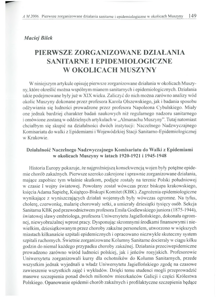 A M 2006. Pierwsze zorganizowane działania sanitarne i epidemiologiczne w okolicach Muszyny 149 M aciej Bi/ek PIERWSZE ZORGANIZOWANE DZIAŁANIA SANITARNE I EPIDEMIOLOGICZNE W OKOLICACH MUSZYNY W niniejszym artykule opisuję pierwsze zorganizowane działania w okolicach Muszyny, które określić można wspólnym mianem sanitarnych i epidemiologicznych. Działania takie podejmowane były już w XIX wieku. Zaliczyć do nich można zarówno analizy wód okolic Muszyny dokonane przez profesora Karola Olszewskiego, jak i badania sposobu odżywiania się ludności prowadzone przez profesora Napoleona Cybulskiego. Miały one jednak bardziej charakter badań naukowych niż regularnego nadzoru sanitarnego i omówione zostanąw oddzielnych artykułach w ״Almanachu Muszyny”. Tutaj natomiast chciałbym się skupić na działalności dwóch instytucji: Naczelnego Nadzwyczajnego Komisariatu do walki z Epidemiami i Wojewódzkiej Stacji Sanitarno-Epidemiologicznej w Krakowie. Działalność Naczelnego Nadzwyczajnego Komisariatu do Walki z Epidemiami w okolicach Muszyny w latach 1920-1921 i 1945-1948 Historia Europy pokazuje, że najgroźniejszą konsekwencją woj en były potężne epidemie chorób zakaźnych. Pierwsze szeroko zakrojone i sprawnie zorganizowane działania, mające zapobiec tym właśnie skutkom, podjęte zostały na terenie Polski południowej w czasie I wojny światowej. Powołany został wówczas przez biskupa krakowskiego, księcia Adama Sapiehę, Książęco-Biskupi Komitet (KBK). Zagrożenia epidemiologiczne wynikające z wyniszczających działań wojennych były wówczas ogromne. Na tyfus, cholerę, czerwonkę, malarię chorowały setki, a umierały dziesiątki tysięcy osób. Sekcja Sanitarna KBK pod przewodnictwem profesora Emila Godlewskiego juniora (1875-1944), światowej sławy embriologa, profesora Uniwersytetu Jagiellońskiego, dokonała ogromnej, niewyobrażalnej wprost pracy. Dysponując skromnymi środkami finansowymi i niewielkim, dziesiątkowanym przez choroby zakaźne personelem, utworzono w większych miastach kilkanaście szpitali epidemicznych i opracowano niezwykle skuteczny system szpitali ruchomych. Świetnie zorganizowane Kolumny Sanitarne docierały w ciągu kilku godzin do niemal każdego przypadku choroby zakaźnej. Działania przeciwepidemiczne prowadzono zarówno wśród ludności polskiej, jak i jeńców rosyjskich. Profesorowie Uniwersytetu zorganizowali kursy dla ochotników do Kolumn Sanitarnych, przede wszystkim jednak wyjednali u władz Uniwersytetu Jagiellońskiego zgodę na czasowe zawieszenie wszystkich zajęć i wykładów. Dzięki temu studenci mogli przeprowadzić masowe szczepienia ponad dwóch milionów mieszkańców Galicji i części Królestwa Polskiego. Opanowanie epidemii chorób zakaźnych i profilaktyczne szczepienia będące 150 Maciej Bilek zasługą profesorów Uniwersytetu, którzy z Emilem Godlewskim na czele potrafili porwać do działania szerokie rzesze społeczeństwa, stanow iąjednąz najpiękniejszych kart w historii polskiej epidemiologii. Warto dodać, że duże zasługi w owym czasie położył w Małopolsce także Austriacki Czerwony Krzyż. Kolejne działania, zorganizowane na znacznie szerszą skalę, zapoczątkowane zostały już po odzyskaniu przez Polskę niepodległości - w sierpniu roku 1919 przy Ministerstwie Zdrowia Publicznego w Warszawie powołany został Centralny Komitet do spraw Walki z Durem Wysypkowym (Plamistym) tzw. Cekadur. Na czele Cekaduru stanął znany i zasłużony z działalności w KBK profesor Emil Godlewski. U staw ąz dnia 14 lipca 1920 roku Cekadur przemianowano na Naczelny Nadzwyczajny Komisariat (NNK) do walki z Epidemiami. Urząd NNK powoływała Rada Ministrów na wniosek Ministra Zdrowia Publicznego, gdy szerzące się choroby zakaźne, obejmując wielkie obszary, groziły państwu powszechną klęską. Szczególnie dotyczyło to chorób spoza granic państwa, takich jak dur plamisty, cholera, dżuma. Urząd NNK posiadał nadzwyczajne pełnomocnictwa na czas trwania tych chorób, jednak nie dłużej niż na rok. Naczelnemu Nadzwyczajnemu Komisariatowi przyznano specjalne uprawnienia m.in. do szeroko zakrojonych akcji zwalczania chorób zakaźnych oraz akcji dezynfekcyjno-kąpielowych. Do największych zasług NNK należy zaliczyć: utworzenie 150 kolumn dezynfekcyjnych oraz 4 kolumn do dezynsekcji cyjanowej, założenie zakładów kąpielowo-dezynfekcyjnych, stałych kąpielisk, posiadających urządzenia dezynfekcyjno-dezynsekcyjne oraz prowadzenie szczepień ochronnych przeciwko ospie, czerwonce, durowi brzusznemu i cholerze. Do podstawowych zadań przeciwepidem icznych Naczelnego Nadzwyczajnego Komisariatu należała izolacja i hospitalizacja osób chorych w istniejącej i sukcesywnie rozbudowywanej sieci szpitali przeciwepidemicznych. Na terenie byłej Kongresówki działały dwa rodzaje takich szpitali: państwowe i komunalne, utrzymywane przez samorządy. Część z tych szpitali została założona już w czasie I wojny światowej przez Książęco-Biskupi Komitet. W roku 1919 wszystkie szpitale przeszły pod zarząd Cekaduru, potem NNK. W gestii Naczelnego Nadzwyczajnego Komisariatu pozostawały także założone bezpośrednio przez Ministerstwo Zdrowia Publicznego szpitale państwowe. W Małopolsce Zachodniej nadzór nad nimi sprawował specjalnie powołany Inspektorat Państwowych Szpitali Epidemicznych w Krakowie z kapitanem lekarzem doktorem Bobakiem na czele. W najbliższym sąsiedztwie Muszyny - początkowo w Krynicy, a następnie w Powroźniku - działał właśnie taki Państwowy Szpital Epidemiczny. W sprawozdaniu Działalność Naczelnego Nadzwyczajnego Komisariatu do spraw walki z epidemjami w roku 1920 i w pierwszem półroczu 1921 r., opublikowanym w roku 1922 w ״Przeglądzie Epidemiologicznym”, profesor Emil Godlewski i doktor Zygmunt Schinzel piszą o placówce, która mieściła się w K rynicy:,, Szpital ten umieszczony był zrazu w budynku szkolnym, o