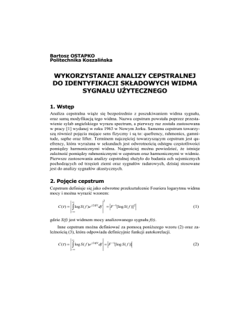 Bartosz OSTAPKO Politechnika KoszaliĔska WYKORZYSTANIE ANALIZY CEPSTRALNEJ DO IDENTYFIKACJI SKàADOWYCH WIDMA SYGNAàU UĩYTECZNEGO 1. WstĊp Analiza cepstralna wiąĪe siĊ bezpoĞrednio z poszukiwaniem widma sygnaáu, oraz samą modyfikacją tego widma. Nazwa cepstrum powstaáa poprzez przestawienie sylab angielskiego wyrazu spectrum, a pierwszy raz zostaáa zastosowana w pracy [1] wydanej w roku 1963 w Nowym Jorku. Samemu cepstrum towarzyszą równieĪ pojĊcia mające sens fizyczny i są to: quefrency, rahmonics, gamnitude, saphe oraz lifter. Terminem najczĊĞciej towarzyszącym cepstrum jest quefrency, która wyraĪana w sekundach jest odwrotnoĞcią odstĊpu czĊstotliwoĞci pomiĊdzy harmonicznymi widma. NajproĞciej moĪna powiedzieü, Īe istnieje zaleĪnoĞü pomiĊdzy rahmonicznymi w cepstrum oraz harmonicznymi w widmie. Pierwsze zastosowania analizy cepstralnej sáuĪyáo do badania ech sejsmicznych pochodzących od trzĊsieĔ ziemi oraz sygnaáów radarowych, dzisiaj stosowane jest do analizy sygnaáów akustycznych. 2. PojĊcie cepstrum Cepstrum definiuje siĊ jako odwrotne przeksztaácenie Fouriera logarytmu widma mocy i moĪna wyraziü wzorem: 2 ∞ C (τ ) = ³ log S ( f )e j 2πfτ df = F −1[log S ( f )]2 (1) −∞ gdzie S(f) jest widmem mocy analizowanego sygnaáu f(t). Inne cepstrum moĪna definiowaü za pomocą poniĪszego wzoru (2) oraz zaleĪnoĞcią (3), która odpowiada definicyjnie funkcji autokorelacji. ∞ C (τ ) = ³ log S ( f )e −∞ j 2πfτ df = F −1[log S ( f )] (2) 60 Bartosz Ostapko ∞ C (τ ) = ³ log S ( f )e j 2πfτ df = F −1[log S ( f )] = R (τ ) (3) −∞ Na podstawie zespolonego przeksztaácenia Fouriera widma amplitudowego otrzymuje siĊ równieĪ cepstrum zespolone lub inaczej poáączone (4). ∞ C (τ ) = ³ F ( jf )e j 2πfτ df = F −1[ F ( jf )] (4) −∞ Cepstrum zespolone jest reprezentacją uĪyteczną w sytuacji, w której sygnaá uwaĪany jest za splot funkcji pobudzenia i odpowiedzi impulsowej (dot. homorficznej teorii dĨwiĊku). We wszystkich wyraĪeniach opisujących cepstrum zmienna niezaleĪna τ jest zmienną rzeczywistą i moĪna ją porównaü ze zmienną τ w funkcji autokorelacji, a jej wartoĞü odpowiada maksimom cepstrum. W przypadku wzorów definicyjnych logarytm dziesiĊtny moĪe zostaü zastąpiony logarytmem naturalnym, a zamiast transformaty Fouriera stosowana równieĪ moĪe byü transformata kosinusowa. 3. Przykáadowe zastosowanie cepstrum Dla lepszego zobrazowania wykorzystania analizy cepstralnej moĪna posáuĪyü siĊ prostym przykáadem do którego obliczenia uĪyto Ğrodowiska MATLAB i dostĊpnych w nim funkcji. Rozpatrzony zostaá sygnaá sinusoidalny o zaáoĪonej z góry czĊstotliwoĞci ωs oraz amplitudzie a. Caáą symulacjĊ przeprowadzono dla skoĔczonego czasu t. Po upáywie czasu te dodano do badanego sygnaáu sinusoidalnego echo o amplitudzie równej poáowy amplitudy sygnaáu badanego (rysunek 1). Otrzymany sygnaá poddano procesowi modulacji dwuwstĊgowej, równieĪ za poĞrednictwem gotowych funkcji z programu, wynik symulacji przedstawiono rysunku 2. Tak wiĊc: a º ª X (t ) = A ⋅ «a ⋅ cos ω s t + cos ω s (t − te )» ⋅ cos ωot 2 ¼ ¬ (5) Wykorzystanie analizy cepstralnej do odentyfikacji skáadowych… Rys. 1. Sygnaá z dodanym echem Rys. 2. Sygnaá zmodulowany 61 62 Bartosz Ostapko Rys. 3. Widmo sygnaáu zmodulowanego z dodanym echem Rys. 4. Cepstrum sygnaáu zmodulowanego z dodanym echem Wykorzystanie analizy cepstralnej do odentyfikacji skáadowych… 63 Sygnaá zmodulowany poddano przeksztaáceniu Fouriera (rysunek 3), a uzyskane widmo poddano analizie cepstralnej. Otrzymany wynik przedstawiono powyĪej (rysunek 4). Na podstawie otrzymanych wyników, moĪna zauwaĪyü Īe rahmoniczna odpowiadająca wartoĞci 0,4 odpowiada równieĪ wartoĞci czasowej miejsca dodanego echa. Reasumując, powyĪej przedstawiono symulacjĊ, w której najpierw obliczono transformatĊ Fouriera splotu dwóch funkcji, a nastĊpnie widmo, które powstaáo, poddano operacji logarytmowania. W ten sposób uwypuklono wáasnoĞci addytywnoĞci echa, które zobrazowano w postaci impulsu przy okreĞlonej wartoĞci rahmonicznej. PowyĪszy przykáad obrazuje w prosty i przejrzysty sposób wykorzystanie cepstrum i jest podstawą do rozpoczĊtych rozwaĪaĔ nad zastosowaniem go do analizy sygnaáów EKG. 5. Podsumowanie Obecnie analiza cepstralna znalazáa szerokie zastosowanie przy badaniu sygnaáów akustycznych. DziĊki moĪliwoĞci eliminacji echa i zakáóceĔ z sygnaáu uĪytecznego nadaje siĊ równieĪ do zastosowania w przypadku zagadnieĔ związanych z transmisją i identyfikacją sygnaáów. Praktyczne zastosowanie cepstrum umoĪliwia lepszą i bardziej dokáadną analizĊ widma dowolnego sygnaáu oraz wykrywanie periodycznoĞci w tym widmie. Operacja logarytmowania zastosowana w cepstrum sprawia, Īe jest ona niewraĪliwa na przykáad na zmiany sygnaáu obwiedni. DziĊki zastosowaniu takiego zabiegu pojawia siĊ moĪliwoĞü dokáadniejszego i bardziej szczegóáowego analizowania przebiegu sygnaáu. Bibliografia: 1. Begerth P., Healy M,. Tukey J.: The quefrency analysis of time series for echoes Cepstrum, Pseudo-Autocovariance, Cros-Cepstrum and Saphe Cracking. Proc. of the Symposium on Time Series Analysis. Wiley N.Y. 1963. 2. Smyczek J.: Systemy transmisji informacji. Tom I. Koszalin 2003. 3. CzyĪewski A.: DĨwiĊk cyfrowy. Akademicka Oficyna Wydawnicza EXIT, Warszawa 2002. 4. Oppenheim A. V., Schafer R. W.: From Frequency to Quefrency: A History of the Cepstrum. IEEE Signal Processing Magazine 2004. 5. Mrozek B., Mrozek Z.: MATLAB i Simulink. HELION, Gliwice 2004. 6. Karu Z. Z.: Signal and Systems, ZiZi Press 2001. 7. Vaseghi S. V.: Advanced Signal Processing and Digital Noise, Wiley 1997. 8. Soliman S. S., Srinath M. D.: Continuous and discrete signals and systems, Prentice-Hall New Jersey 1998.
