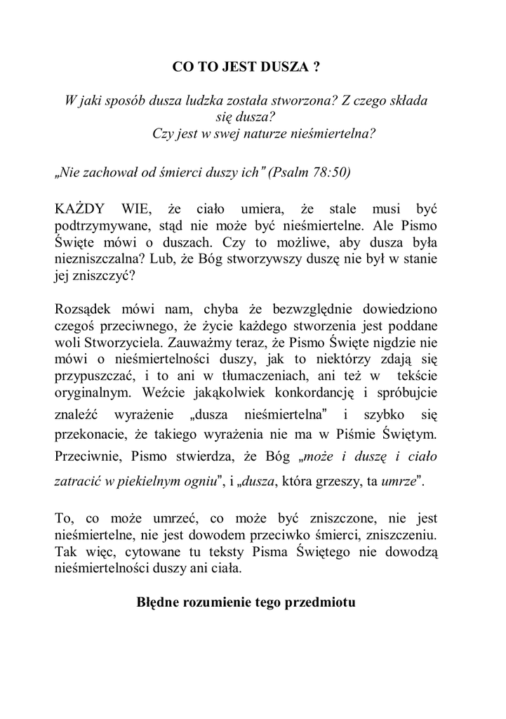 CO TO JEST DUSZA ? W jaki sposób dusza ludzka została stworzona? Z czego składa się dusza? Czy jest w swej naturze nieśmiertelna? „Nie zachował od śmierci duszy ich” (Psalm 78:50) KAŻDY WIE, że ciało umiera, że stale musi być podtrzymywane, stąd nie może być nieśmiertelne. Ale Pismo Święte mówi o duszach. Czy to możliwe, aby dusza była niezniszczalna? Lub, że Bóg stworzywszy duszę nie był w stanie jej zniszczyć? Rozsądek mówi nam, chyba że bezwzględnie dowiedziono czegoś przeciwnego, że życie każdego stworzenia jest poddane woli Stworzyciela. Zauważmy teraz, że Pismo Święte nigdzie nie mówi o nieśmiertelności duszy, jak to niektórzy zdają się przypuszczać, i to ani w tłumaczeniach, ani też w tekście oryginalnym. Weźcie jakąkolwiek konkordancję i spróbujcie znaleźć wyrażenie „dusza nieśmiertelna” i szybko się przekonacie, że takiego wyrażenia nie ma w Piśmie Świętym. Przeciwnie, Pismo stwierdza, że Bóg „może i duszę i ciało zatracić w piekielnym ogniu”, i „dusza, która grzeszy, ta umrze”. To, co może umrzeć, co może być zniszczone, nie jest nieśmiertelne, nie jest dowodem przeciwko śmierci, zniszczeniu. Tak więc, cytowane tu teksty Pisma Świętego nie dowodzą nieśmiertelności duszy ani ciała. Błędne rozumienie tego przedmiotu Czymże więc jest dusza? Ogólne pojęcie o duszy określa ją jako coś nieokreślonego, co jest w nas, ale tylko niewielu próbuje wyjaśnić co to takiego i gdzie jest umiejscowione. Niektórzy twierdzą, że to nieznane coś jest rzeczywistą, inteligentną istotą, podczas gdy ciało jest po prostu jej mieszkaniem lub narzędziem. Pewien biskup metodysta określił kiedyś duszę w następujący sposób: „Nie ma ona ani wnętrza ani zewnętrza, nie posiada ciała, kształtu lub części, i milion dusz można umieścić w łupinie orzecha”. Można by rzec, że jest to bardzo dobra definicja niczego. Ciało nie jest duszą, jak to niektórzy utrzymują. Dowodzi tego Jezus, kiedy stwierdza, że Bóg „może i duszę i ciało, zatracić w piekielnym ogniu”. W świetle tego, jeśli wyzwolimy nasze umysły od uprzedzeń, powinniśmy być w stanie nauczyć się czegoś więcej w tym względzie badając natchniony opis stworzenia człowieka. Jak została stworzona dusza ludzka Udając się do 1 Mojż. 2:7 czytamy: „Stworzył tedy Pan Bóg człowieka z prochu ziemi, i natchnął [hebr. dmuchnął] w oblicze jego dech [hebr. wiatr, moc] żywota [hebr. życia, l. mn., to znaczy, że życie jako takie było wspólne wszystkim żywym stworzeniom]. I stał się człowiek duszą żywiącą [to jest, istotą czującą]”. Opis ten pokazuje, że najpierw zostało stworzone ciało, ale zanim nastąpiło ożywienie, nie był to człowiek, dusza lub istota. To ciało miało oczy, ale nic nie widziało, uszy, ale nic nie słyszało, usta, ale nic nie mówiło, język, ale nie czuło smaku, nozdrza, ale nie znało woni, serce, które nie pulsowało, krew, która była zimna, pozbawiona życia, płuca, które nie pracowały. Nie był to człowiek, ale zwłoki, nieożywione ciało. Drugi krok w procesie stwarzania człowieka stanowiło obdarzenie żywotnością właściwie „uformowanego” i pod każdym względem przygotowanego ciała. To jest opisane w słowach: „i tchnął w oblicze [nozdrza] jego dech żywota”. Gdy zdrowa osoba utonie i jej życie jest całkowicie zawieszone w swych funkcjach, przywrócenie do przytomności następuje przez poruszanie ramionami tak, by płuca pracowały jak miechy i stopniowo ustalało się oddychanie nosem. W przypadku Adama nie wymagało to oczywiście żadnego pracochłonnego wysiłku ze strony Stwórcy powodującego, by doskonały, stworzony przez Niego organizm zaczął oddychać życiodajnym tlenem atmosfery. Gdy ożywcze powietrze dostało się do płuc, nastąpiło ich rozszerzenie, cząsteczki krwi utleniły się i przesunęły się do serca, a ten organ przekazał je z kolei do każdej części ciała, budząc wszystkie przygotowane, ale dotychczas nie reagujące nerwy do energii i odczuwania. W jednej chwili energia dotarła do mózgu rozpoczynając proces myślenia, postrzegania, rozumowania, patrzenia, dotykania, odczuwania smaku, czucia i powonienia. To co było ludzkim organizmem pozbawionym życia, stało się człowiekiem, istotą czującą, osiągnięty został stan „duszy żywiącej” [żyjącej], o którym wspomina tekst. Innymi słowy termin „dusza żywiąca” oznacza ni mniej ni więcej tylko tyle co „istota czująca”, to znaczy istota zdolna do odczuwania, postrzegania i myślenia. Co więcej, chociaż Adam miał doskonały organizm, podtrzymywanie życia, duszy lub istoty czującej przez spożywanie owoców drzew żywota było dla niego niezbędne. A gdy zgrzeszył, Bóg wypędził go z ogrodu „by snać nie ściągnął ręki swej, i nie wziął z drzewa [l. mn., z drzew lub z sadu] żywota i nie jadł, i żyłby na wieki [tzn. stale spożywając z nich]” (1 Mojż. 3:22). O jakże rozprasza się mgła i tajemnica w świetle prawdy, która bije ze Słowa Bożego! Niższe zwierzęta są także duszami Tak więc zobaczymy jak to się dzieje, że Pismo Święte mówi o „duszy” w odniesieniu do niższych zwierząt. Podobnie jak człowiek, są one istotami czującymi lub istotami inteligentnymi, jednakże niższych rodzajów. Podobnie jak człowiek, mogą widzieć, słyszeć, czuć, odczuwać smak i mieć powonienie. I każde też może rozumować odpowiednio do poziomu swego własnego organizmu, chociaż żadne nie umie wnioskować w sposób zawiły, lub na tak wysokim poziomie jak człowiek. Różnica ta nie jest wynikiem posiadania przez człowieka innego rodzaju życia niż to, jakie posiadają niższe zwierzęta, wszyscy bowiem posiadają podobne siły witalne, z tego samego źródła lub fontanny życia, tego samego Stwórcy. Wszyscy podtrzymują życie w ten sam sposób, przez trawienie podobn