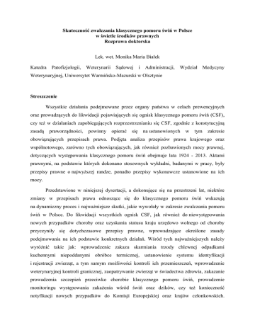 Skuteczność zwalczania klasycznego pomoru świń w Polsce w świetle środków prawnych Rozprawa doktorska Lek. wet. Monika Maria Białek Katedra Patofizjologii, Weterynarii Sądowej i Administracji, Wydział Medycyny Weterynaryjnej, Uniwersytet Warmińsko-Mazurski w Olsztynie Streszczenie Wszystkie działania podejmowane przez organy państwa w celach prewencyjnych oraz prowadzących do likwidacji pojawiających się ognisk klasycznego pomoru świń (CSF), czy też w działaniach zapobiegających rozprzestrzenianiu się CSF, zgodnie z konstytucyjną zasadą praworządności, powinny opierać się na ustanowionych w tym zakresie obowiązujących przepisach prawa. Podjęta analiza przepisów prawa krajowego oraz wspólnotowego, zarówno tych obowiązujących, jak również pozbawionych mocy prawnej, dotyczących występowania klasycznego pomoru świń obejmuje lata 1924 - 2013. Aktami prawnymi, na podstawie których dokonano stosownych wykładni, badanymi w pracy, były przepisy prawne o najwyższej randze, ponadto przepisy wykonawcze ustanowione na ich mocy. Przedstawione w niniejszej dysertacji, a dokonujące się na przestrzeni lat, niektóre zmiany w przepisach prawa odnoszące się do klasycznego pomoru świń wskazują na dynamiczny proces i najważniejsze skutki, jakie wywołały w zakresie zwalczania pomoru świń w Polsce. Do likwidacji wszystkich ognisk CSF, jak również do niewystępowania nowych przypadków choroby oraz uzyskania statusu kraju urzędowo wolnego od choroby przyczyniły się dotychczasowe przepisy prawne, wprowadzające określone zasady podejmowania na ich podstawie konkretnych działań. Wśród tych najważniejszych należy wyróżnić takie jak: wprowadzenie zakazu skarmiania trzody chlewnej odpadkami kuchennymi niepoddanymi obróbce termicznej, ustanowienie systemu identyfikacji i rejestracji zwierząt, a tym samym możliwości kontroli ich przemieszczeń, wprowadzenie weterynaryjnej kontroli granicznej, zaopatrywanie zwierząt w świadectwa zdrowia, zakazanie prowadzenia szczepień przeciwko chorobie klasycznego pomoru świń, prowadzenie monitoringu występowania zakażenia wśród świń oraz dzików, czy też konieczność notyfikacji nowych przypadków do Komisji Europejskiej oraz krajów członkowskich. Takie zestawienie środków pozwala na szybkie podejmowanie działań interwencyjnych przez urzędowe służby weterynaryjne. Wynikiem przeprowadzonego badania przepisów prawnych i ich oddziaływania na sytuację epidemiologiczną klasycznego pomoru świń w Polsce jest wskazanie zależności dotyczącej braku występowania nowych przypadków choroby od września 1994 r. W krajach Unii Europejskiej nowe przypadki choroby są nadal stwierdzane, a obowiązujące uregulowania prawne, w tym prowadzenie programów zwalczania, pozwalają na ich szybką eliminację oraz zapobieganie rozprzestrzenieniu się zakażenia. Według przedstawionych danych w ostatnich latach liczba stwierdzanych ognisk choroby w krajach UE uległa zmniejszeniu. Ważnym elementem nakazanym przez przepisy prawa jest obowiązek ciągłego kontrolowania występowania choroby, prowadzonego we wszystkich krajach UE. Przedmiotowa analiza wskazuje, że bez ustanowienia organów administracji odpowiedzialnych za prowadzenie działań z zakresu zwalczania chorób zakaźnych zwierząt, jak również bez przepisów prawnych w tym zakresie, niemożliwym byłoby kontrolowanie i zwalczanie klasycznego pomoru świń. W przypadku CSF, skutki stosowania przepisów prawa w Polsce przynoszą od 1994 r. określony efekt i zapobiegają występowaniu nowych przypadków choroby, pomimo jej stwierdzania w innych krajach europejskich.