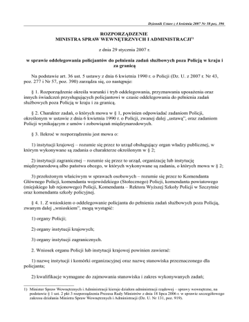 Dziennik Ustaw z 4 kwietnia 2007 Nr 58 poz. 396 ROZPORZĄDZENIE MINISTRA SPRAW WEWNĘTRZNYCH I ADMINISTRACJI1) z dnia 29 stycznia 2007 r. w sprawie oddelegowania policjantów do pełnienia zadań służbowych poza Policją w kraju i za granicą Na podstawie art. 36 ust. 5 ustawy z dnia 6 kwietnia 1990 r. o Policji (Dz. U. z 2007 r. Nr 43, poz. 277 i Nr 57, poz. 390) zarządza się, co następuje: § 1. Rozporządzenie określa warunki i tryb oddelegowania, przyznawania uposażenia oraz innych świadczeń przysługujących policjantowi w czasie oddelegowania do pełnienia zadań służbowych poza Policją w kraju i za granicą. § 2. Charakter zadań, o których mowa w § 1, powinien odpowiadać zadaniom Policji, określonym w ustawie z dnia 6 kwietnia 1990 r. o Policji, zwanej dalej „ustawą”, oraz zadaniom Policji wynikającym z umów i zobowiązań międzynarodowych. § 3. Ilekroć w rozporządzeniu jest mowa o: 1) instytucji krajowej – rozumie się przez to urząd obsługujący organ władzy publicznej, w którym wykonywane są zadania o charakterze określonym w § 2; 2) instytucji zagranicznej – rozumie się przez to urząd, organizację lub instytucję międzynarodową albo państwa obcego, w których wykonywane są zadania, o których mowa w § 2; 3) przełożonym właściwym w sprawach osobowych – rozumie się przez to Komendanta Głównego Policji, komendanta wojewódzkiego (Stołecznego) Policji, komendanta powiatowego (miejskiego lub rejonowego) Policji, Komendanta – Rektora Wyższej Szkoły Policji w Szczytnie oraz komendanta szkoły policyjnej. § 4. 1. Z wnioskiem o oddelegowanie policjanta do pełnienia zadań służbowych poza Policją, zwanym dalej „wnioskiem”, mogą wystąpić: 1) organy Policji; 2) organy instytucji krajowych; 3) organy instytucji zagranicznych. 2. Wniosek organu Policji lub instytucji krajowej powinien zawierać: 1) nazwę instytucji i komórki organizacyjnej oraz nazwę stanowiska przeznaczonego dla policjanta; 2) kwalifikacje wymagane do zajmowania stanowiska i zakres wykonywanych zadań; 1) Minister Spraw Wewnętrznych i Administracji kieruje działem administracji rządowej – sprawy wewnętrzne, na podstawie § 1 ust. 2 pkt 3 rozporządzenia Prezesa Rady Ministrów z dnia 18 lipca 2006 r. w sprawie szczegółowego zakresu działania Ministra Spraw Wewnętrznych i Administracji (Dz. U. Nr 131, poz. 919). Dziennik Ustaw z 4 kwietnia 2007 Nr 58 poz. 396 3) przewidywany okres oddelegowania. 3. Wniosek instytucji zagranicznej powinien zawierać: 1) dane, o których mowa w ust. 2; 2) określenie uprawnień i należności przysługujących oddelegowanemu policjantowi w instytucji zagranicznej. 4. W przypadku gdy oddelegowanie policjanta do instytucji zagranicznej poprzedza postępowanie kwalifikacyjne, wynikające z umowy międzynarodowej, policjant powiadamia pisemnie Komendanta Głównego Policji o zamiarze uczestniczenia w tym postępowaniu. § 5. Oddelegowanie do pełnienia zadań służbowych poza Policją następuje po zapoznaniu się policjanta z treścią wniosku, o którym mowa w § 4 ust. 2 i 3, oraz wyrażeniu zgody w formie pisemnego oświadczenia, wskazującego nazwę instytucji krajowej lub zagranicznej, stanowisko służbowe, na którym policjant godzi się wykonywać zadania służbowe, a także czas pełnienia zadań służbowych poza Policją, na jaki wyraża zgodę. § 6. 1. Komendant Główny Policji, w razie uwzględnienia wniosku: 1) uzgadnia z organem instytucji krajowej lub zagranicznej obsadę personalną stanowiska służbowego określonego we wniosku, po uprzednim uzyskaniu od policjanta pisemnego oświadczenia, o którym mowa w § 5; 2) zwalnia policjanta z zajmowanego stanowiska służbowego z jednoczesnym przeniesieniem go do dyspozycji przełożonego właściwego w sprawach osobowych; 3) zalicza – do celów obliczania uposażenia i innych należności pieniężnych przysługujących policjantowi w okresie oddelegowania – stanowisko służbowe w instytucji krajowej określone we wniosku do odpowiedniej grupy zaszeregowania oraz ustala policyjny stopień etatowy, stosownie do zaszeregowania stanowisk służbowych policjantów; 4) wydaje rozkaz personalny o oddelegowaniu policjanta do pełnienia zadań służbowych poza Policją. 2. Rozkaz personalny o oddelegowaniu powinien zawierać: 1) datę zwolnienia policjanta ze stanowiska służbowego i przeniesienia go do dyspozycji przełożonego właściwego w sprawach osobowych oraz określenie ostatnio zajmowanego stanowiska służbowego w Policji wraz ze składnikami uposażenia; 2) datę oddelegowania policjanta do instytucji krajowej lub zagranicznej; 3) nazwę instytucji krajowej lub zagranicznej, do której następuje oddelegowanie; 4) określenie stanowiska przeznaczonego dla policjanta w instytucji oddelegowania; 5) określenie składników i wysokości uposażenia należnego w czasie oddelegowania do instytucji krajowej, ustalonego z uwzględnieniem ust. 1 pkt 3; Dziennik Ustaw z 4 kwietnia 2007 Nr 58 poz. 396 6) inne warunki oddelegowania. § 7. Organ instytucji krajowej lub zagranicznej wyznacza oddelegowanego policjanta na stanowisko służbowe, zgodnie z wnioskiem. § 8. 1. Organ instytucji krajowej lub zagranicznej może przenieść oddelegowanego policjanta na inne stanowisko służbowe niż określone we wniosku o oddelegowanie, jeżeli na stanowisku tym są realizowane zadania określone w § 2. 2. W razie reorganizacji instytucji krajowej lub zagranicznej powodującej zmianę stanowiska służbowego, na którym oddelegowany policjant wykonuje zadania służbowe, organ instytucji może wystąpić do Komendanta Głównego Policji z wnioskiem o skierowanie policjanta na inne stanowisko służbowe lub o jego odwołanie z oddelegowania. 3. W przypadkach, o których mowa w ust. 1 i 2, przepisy § 4–6 i 9 stosuje się odpowiednio. § 9. 1. Komendant Główny Policji odwołuje policjanta z oddelegowania w przypadku konieczności zwolnienia go ze s