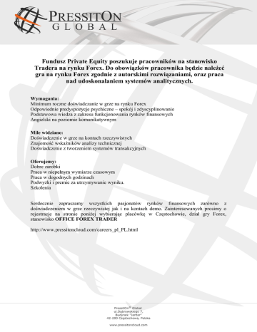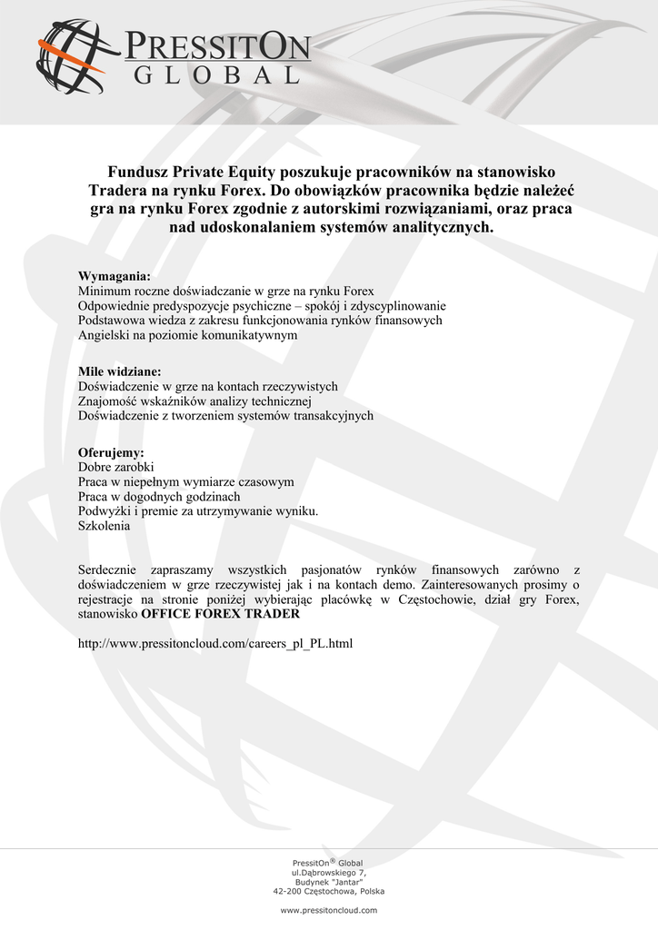 Fundusz Private Equity poszukuje pracowników na stanowisko Tradera na rynku Forex. Do obowiązków pracownika będzie należeć gra na rynku Forex zgodnie z autorskimi rozwiązaniami, oraz praca nad udoskonalaniem systemów analitycznych. Wymagania: Minimum roczne doświadczanie w grze na rynku Forex Odpowiednie predyspozycje psychiczne – spokój i zdyscyplinowanie Podstawowa wiedza z zakresu funkcjonowania rynków finansowych Angielski na poziomie komunikatywnym Mile widziane: Doświadczenie w grze na kontach rzeczywistych Znajomość wskaźników analizy technicznej Doświadczenie z tworzeniem systemów transakcyjnych Oferujemy: Dobre zarobki Praca w niepełnym wymiarze czasowym Praca w dogodnych godzinach Podwyżki i premie za utrzymywanie wyniku. Szkolenia Serdecznie zapraszamy wszystkich pasjonatów rynków finansowych zarówno z doświadczeniem w grze rzeczywistej jak i na kontach demo. Zainteresowanych prosimy o rejestracje na stronie poniżej wybierając placówkę w Częstochowie, dział gry Forex, stanowisko OFFICE FOREX TRADER http://www.pressitoncloud.com/careers_pl_PL.html PressitOn® Global ul.Dąbrowskiego 7, Budynek "Jantar" 42-200 Częstochowa, Polska www.pressitoncloud.com