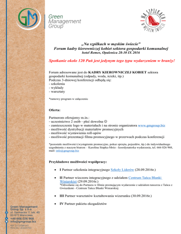 „Na szpilkach w męskim świecie” Forum kadry kierowniczej kobiet sektora gospodarki komunalnej hotel Remes, Opalenica 28-30 IX 2016 Spotkanie około 120 Pań jest jedynym tego typu wydarzeniem w branży! Forum adresowane jest do KADRY KIEROWNICZEJ KOBIET sektora gospodarki komunalnej (odpady, woda, ścieki, itp.) Podczas 3-dniowej konferencji odbędą się: - szkolenia - wykłady - warsztaty *ramowy program w załączeniu Oferta: Partnerom oferujemy m.in.: - uczestnictwo 2 osób - płeć dowolna - zamieszczenie logo w materiałach i na stronie organizatora www.gmgroup.biz - możliwość dystrybucji materiałów promocyjnych - możliwość wystawienia roll-upów - możliwość prezentacji filmu promocyjnego w przerwach podczas konferencji *pozostałe możliwości (wystąpienie promocyjne, pokaz sprzętu, pojazdów, itp.) do indywidualnego uzgodnienia z naszym biurem – Karolina Siupka-Mróz - koordynatorka wydarzenia, tel. 666 026 968, mail: [email protected] Przykładowe możliwości współpracy: I Partner szkolenia integracyjnego Szkoły Liderów (28.09.2016r.) II Partner wieczoru integracyjnego z udziałem Centrum Tańca Blanki Winiarskiej (29.09.2016r.) *Odwołanie się do Partnera w filmie promującym wydarzenie z udziałem tancerza z Tańca z Gwiazdami - Centrum Tańca Blanki Winiarskiej III Partner warsztatów kształtowania wizerunku (30.09.2016r.) IV Partner pakietu ekogadżetów