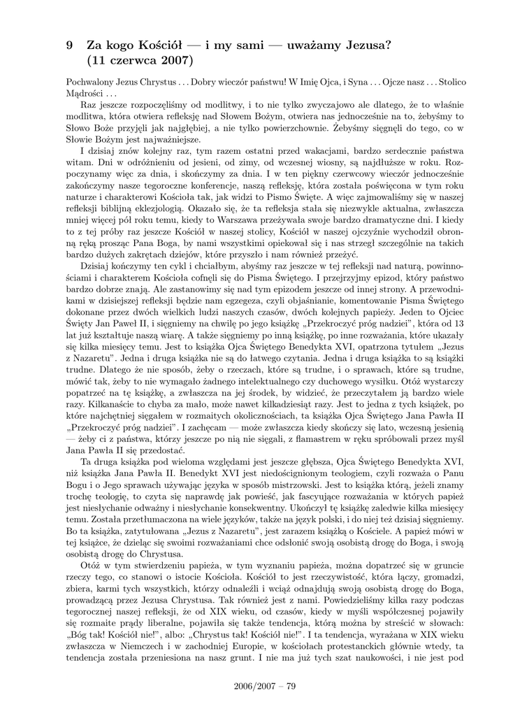 9 Za kogo Kościół — i my sami — uważamy Jezusa? (11 czerwca 2007) Pochwalony Jezus Chrystus . . . Dobry wieczór państwu! W Imię Ojca, i Syna . . . Ojcze nasz . . . Stolico Mądrości . . . Raz jeszcze rozpoczęliśmy od modlitwy, i to nie tylko zwyczajowo ale dlatego, że to właśnie modlitwa, która otwiera refleksję nad Słowem Bożym, otwiera nas jednocześnie na to, żebyśmy to Słowo Boże przyjęli jak najgłębiej, a nie tylko powierzchownie. Żebyśmy sięgnęli do tego, co w Słowie Bożym jest najważniejsze. I dzisiaj znów kolejny raz, tym razem ostatni przed wakacjami, bardzo serdecznie państwa witam. Dni w odróżnieniu od jesieni, od zimy, od wczesnej wiosny, są najdłuższe w roku. Rozpoczynamy więc za dnia, i skończymy za dnia. I w ten piękny czerwcowy wieczór jednocześnie zakończymy nasze tegoroczne konferencje, naszą refleksję, która została poświęcona w tym roku naturze i charakterowi Kościoła tak, jak widzi to Pismo Święte. A więc zajmowaliśmy się w naszej refleksji biblijną eklezjologią. Okazało się, że ta refleksja stała się niezwykle aktualna, zwłaszcza mniej więcej pół roku temu, kiedy to Warszawa przeżywała swoje bardzo dramatyczne dni. I kiedy to z tej próby raz jeszcze Kościół w naszej stolicy, Kościół w naszej ojczyźnie wychodził obronną ręką prosząc Pana Boga, by nami wszystkimi opiekował się i nas strzegł szczególnie na takich bardzo dużych zakrętach dziejów, które przyszło i nam również przeżyć. Dzisiaj kończymy ten cykl i chciałbym, abyśmy raz jeszcze w tej refleksji nad naturą, powinnościami i charakterem Kościoła cofnęli się do Pisma Świętego. I przejrzyjmy epizod, który państwo bardzo dobrze znają. Ale zastanowimy się nad tym epizodem jeszcze od innej strony. A przewodnikami w dzisiejszej refleksji będzie nam egzegeza, czyli objaśnianie, komentowanie Pisma Świętego dokonane przez dwóch wielkich ludzi naszych czasów, dwóch kolejnych papieży. Jeden to Ojciec Święty Jan Paweł II, i sięgniemy na chwilę po jego książkę „Przekroczyć próg nadziei”, która od 13 lat już kształtuje naszą wiarę. A także sięgniemy po inną książkę, po inne rozważania, które ukazały się kilka miesięcy temu. Jest to książka Ojca Świętego Benedykta XVI, opatrzona tytułem „Jezus z Nazaretu”. Jedna i druga książka nie są do łatwego czytania. Jedna i druga książka to są książki trudne. Dlatego że nie sposób, żeby o rzeczach, które są trudne, i o sprawach, które są trudne, mówić tak, żeby to nie wymagało żadnego intelektualnego czy duchowego wysiłku. Otóż wystarczy popatrzeć na tę książkę, a zwłaszcza na jej środek, by widzieć, że przeczytałem ją bardzo wiele razy. Kilkanaście to chyba za mało, może nawet kilkadziesiąt razy. Jest to jedna z tych książek, po które najchętniej sięgałem w rozmaitych okolicznościach, ta książka Ojca Świętego Jana Pawła II „Przekroczyć próg nadziei”. I zachęcam — może zwłaszcza kiedy skończy się lato, wczesną jesienią — żeby ci z państwa, którzy jeszcze po nią nie sięgali, z flamastrem w ręku spróbowali przez myśl Jana Pawła II się przedostać. Ta druga książka pod wieloma względami jest jeszcze głębsza, Ojca Świętego Benedykta XVI, niż książka Jana Pawła II. Benedykt XVI jest niedoścignionym teologiem, czyli rozważa o Panu Bogu i o Jego sprawach używając języka w sposób mistrzowski. Jest to książka którą, jeżeli znamy trochę teologię, to czyta się naprawdę jak powieść, jak fascyujące rozważania w których papież jest niesłychanie odważny i niesłychanie konsekwentny. Ukończył tę książkę zaledwie kilka miesięcy temu. Została przetłumaczona na wiele języków, także na język polski, i do niej też dzisiaj sięgniemy. Bo ta książka, zatytułowana „Jezus z Nazaretu”, jest zarazem książką o Kościele. A papież mówi w tej książce, że dzieląc się swoimi rozważaniami chce odsłonić swoją osobistą drogę do Boga, i swoją osobistą drogę do Chrystusa. Otóż w tym stwierdzeniu papieża, w tym wyznaniu papieża, można dopatrzeć się w gruncie rzeczy tego, co stanowi o istocie Kościoła. Kościół to jest rzeczywistość, która łączy, gromadzi, zbiera, karmi tych wszystkich, którzy odnaleźli i wciąż odnajdują swoją osobistą drogę do Boga, prowadzącą przez Jezusa Chrystusa. Tak również jest z nami. Powiedzieliśmy kilka razy podczas tegorocznej naszej refleksji, że od XIX wieku, od czasów, kiedy w myśli współczesnej pojawiły się rozmaite prądy liberalne, pojawiła się także tendencja, którą można by streścić w słowach: „Bóg tak! Kościół nie!”, albo: „Chrystus tak! Kościół nie!”. I ta tendencja, wyrażana w XIX wieku zwłaszcza w Niemczech i w zachodniej Europie, w kościołach protestanckich głównie wtedy, ta tendencja została przeniesiona na nasz grunt. I nie ma już tych szat naukowości, i nie jest pod 2006/2007 – 79 maską liberalnej teologii, nie ma szat akademickości. Stała się zwyczajna, można by powiedzieć – szara. I bardzo wielu ludzi przekuło ją na życie codzienne mówiąc: „W Boga wierzę, ale Kościoła nie potrzebuję. Chrystusa uznaję, ale Kościół omijam. Układam sobie życie z Bogiem i z Chrystusem bez pomocy, i przynależności do Kościoła”. I dzisiaj, raz jeszcze, kiedy zbliżają się wakacje i kiedy tak czy inaczej na pewno z takimi postawami się zetkniemy, to raz jeszcze musimy sobie postawić pytanie: „Dlaczego Kościół?” W XIX wieku był nawet niemiecki myśliciel, który powiedział mniej więcej tak: „Jezus głosił królestwo Boże, czyli panowanie i rządy Boga, ale zamiast tego, zamiast królestwa Bożego, powstał Kościół”. I w ten sposób przeprowadzono taką antytezę, takie napięcie, taki brak jednoznaczności pomiędzy Chrystusem i tym, czego On dokonał, a Kościołem, do kt