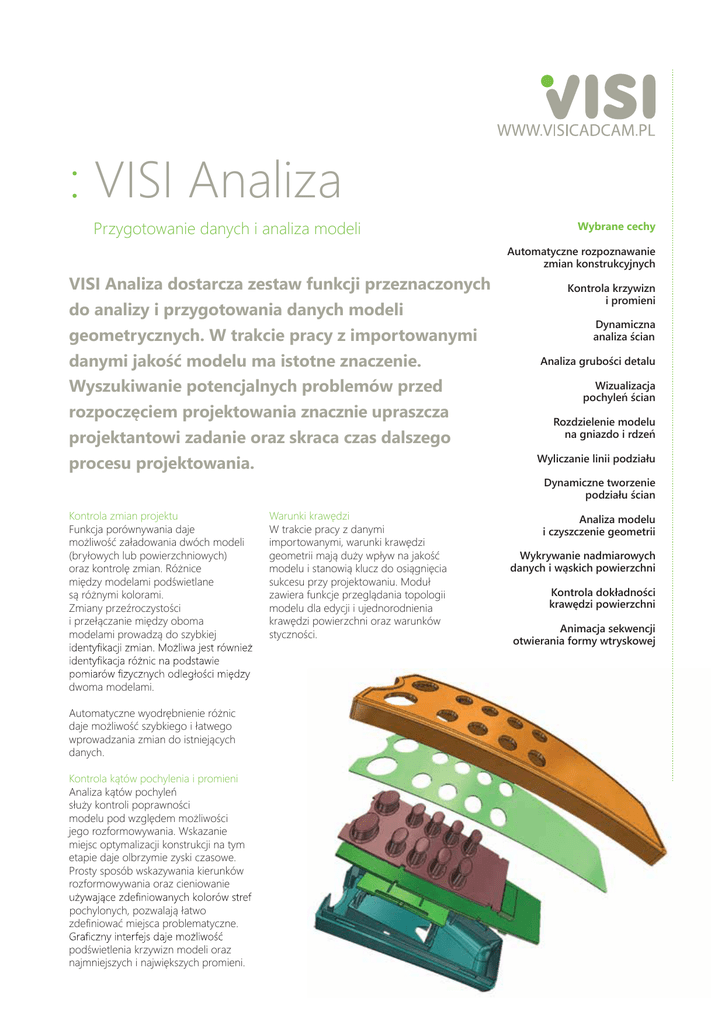: VISI Analiza Przygotowanie danych i analiza modeli VISI Analiza dostarcza zestaw funkcji przeznaczonych do analizy i przygotowania danych modeli geometrycznych. W trakcie pracy z importowanymi danymi jakość modelu ma istotne znaczenie. Wyszukiwanie potencjalnych problemów przed rozpoczęciem projektowania znacznie upraszcza projektantowi zadanie oraz skraca czas dalszego procesu projektowania. Kontrola zmian projektu Funkcja porównywania daje możliwość załadowania dwóch modeli (bryłowych lub powierzchniowych) oraz kontrolę zmian. Różnice między modelami podświetlane są różnymi kolorami. Zmiany przeźroczystości i przełączanie między oboma modelami prowadzą do szybkiej dwoma modelami. Automatyczne wyodrębnienie różnic daje możliwość szybkiego i łatwego wprowadzania zmian do istniejących danych. Kontrola kątów pochylenia i promieni Analiza kątów pochyleń służy kontroli poprawności modelu pod względem możliwości jego rozformowywania. Wskazanie miejsc optymalizacji konstrukcji na tym etapie daje olbrzymie zyski czasowe. Prosty sposób wskazywania kierunków rozformowywania oraz cieniowanie pochylonych, pozwalają łatwo zdefiniować miejsca problematyczne. podświetlenia krzywizn modeli oraz najmniejszych i największych promieni. Warunki krawędzi W trakcie pracy z danymi importowanymi, warunki krawędzi geometrii mają duży wpływ na jakość modelu i stanowią klucz do osiągnięcia sukcesu przy projektowaniu. Moduł zawiera funkcje przeglądania topologii modelu dla edycji i ujednorodnienia krawędzi powierzchni oraz warunków styczności. Wybrane cechy Automatyczne rozpoznawanie zmian konstrukcyjnych Kontrola krzywizn i promieni Dynamiczna analiza ścian Analiza grubości detalu Wizualizacja pochyleń ścian Rozdzielenie modelu na gniazdo i rdzeń Wyliczanie linii podziału Dynamiczne tworzenie podziału ścian Analiza modelu i czyszczenie geometrii Wykrywanie nadmiarowych danych i wąskich powierzchni Kontrola dokładności krawędzi powierzchni Animacja sekwencji otwierania formy wtryskowej Wsparcie w najbardziej skomplikowanych i czasochłonnych zadaniach daje projektantowi możliwość pełnego wykorzystania jego doświadczenia i maksymalizuje efektywność pracy. kierunków, odpowiadających sekwencji otwierania formy. Animację objaśniającą pracę formy można zapisać w zewnętrznym pliku i odtworzyć z dowolnego miejsca. Funkcja wyszukiwania linii podziału daje 3 różne metody optymalnego jej wyszukania. Graficzny interfejs użytkownika VISI pozwala na interaktywne uzyskanie wyniku i na wprowadzenie ewentualnych modyfikacji. Możliwe jest także wyodrębnienie linii podziału jako krzywej lub automatyczne podzielenie modeli na stosowne strefy gniazd, rdzeni czy suwaków. Dzielenie i powierzchnie zamykające Tworzenie podziału i powierzchni zamykających stanowi jedno z najbardziej czasochłonnych i trudnych zadań. Obszerny zestaw funkcji tworzenia powierzchni oraz zarządzania liniami podziału stanowi kombinację narzędzi przeznaczonych do tworzenia najbardziej skomplikowanych ścian. Również powierzchnie utworzone na zewnątrz, uznane jako zamykające, mogą być dołączone do managera linii podziału i w połączeniu z powierzchniami wytłaczanymi, odsuniętymi, prostokreślnymi i płachtami - użyte jako dzielące. Funkcje liniii podziału pozwalają automatycznie tworzyć gniazda i rdzenie przy użyciu podstawowej geometrii. Pomoc w najbardziej skomplikowanych i czasochłonnych zadaniach daje projektantowi pełne wykorzystanie jego doświadczenia i maksymalizuje efektywność pracy. Kontrola poprawności i czyszczenie VISI udostępnia bardzo efektywne narzędzia do sprawdzenia nadmiarowości geometrii. Podwojona geometria zostanie podświetlona, wyodrębniona i przeniesiona na inną warstwę. Rozpoznawanie wąskich ścian przeanalizuje model i wykrywa ściany o zadanej wartości powierzchni. Automatyczne usuwanie, zabliźnianie i zszywanie zachowuje topologię powierzchni i gwarantuje jednorodność się brył oraz kontrola błędów geometrii i warunków przycinania zapewnia osiągnięcie najlepszych możliwych wyników. Powierzchnie posobne Funkcja daje możliwość wskazania jednej lub wielu powierzchni początkowych i automatyczne wykrycie obszarów stykających się z wybraną powierzchnią pod określonym kątem. Funkcja ta jest szczególnie użyteczna przy wyodrębnianiu płaszczy wodnych czy rozdzielaniu powierzchni na dwa zestawy. Dane o początkach układu współrzędnych W pracy z geometrią “samochodówki” lub przy przemieszczaniu modelu Zadzwoń: + 48 666 081 083 Posiadamy biura techniczne na terenie całej Polski między wieloma układami współrzędnych, dane o ich początku upraszczają zadania transmisji informacji z modelu 3D do roboczych układów współrzędnych. Wszystkie przemieszczenia między układami współrzędnych mogą być wyodrębnione i zapisane w pliku raportu do późniejszego wykorzystania oraz do wykonania dokumentacji. Analizator powierzchni Funkcja informacyjna, wyświetlająca różne dane o powierzchni, podczas przesuwania kursorem myszy po modelu. Najprostsza droga do sprawdzenia pochylenia, pętli przycinających, czy promieni zaokrąglenia. Analiza grubości modelu Bardzo przydatna funkcja dla wytwórców. Pozwala ona graficznie przedstawić grubość modelu, wyliczoną przy pomocy wielu algorytmów Daje ilościową informację o potencjalnych miejscach zalegania tworzywa oraz nieprawidłowej konstrukcji żeber, co pomaga w najlepszym umieszczeniu punktów wtrysku i kanałów chłodzących. Diagnostyka pamięci Ta bardzo pomocna aplikacja służy do zarządzania pamięcią. Można ją stosować zarówno dla pojedynczych powierzchni, jak i brył. Jeśli danych modelu jest za dużo, najprawdopodobniej zawierają one nadmiarowe informacje. Zestaw funkcji daje możliwość oczyszczenia geometrii i usunięcia zbędnych śmieci. www.visicadcam.pl www.visicadcam.pl [email pro