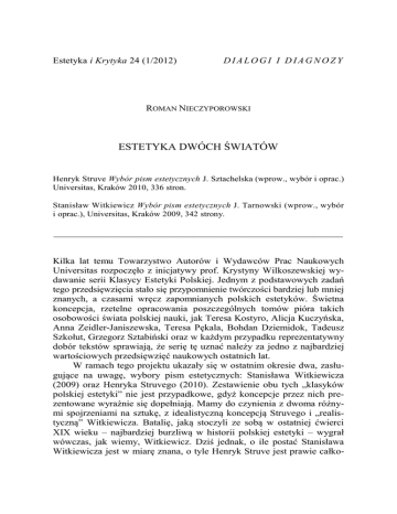 Estetyka i Krytyka 24 (1/2012) DIALOGI I DIAGNOZY ROMAN NIECZYPOROWSKI ESTETYKA DWÓCH ŚWIATÓW Henryk Struve Wybór pism estetycznych J. Sztachelska (wprow., wybór i oprac.) Universitas, Kraków 2010, 336 stron. Stanisław Witkiewicz Wybór pism estetycznych J. Tarnowski (wprow., wybór i oprac.), Universitas, Kraków 2009, 342 strony. __________________________________________________________ Kilka lat temu Towarzystwo Autorów i Wydawców Prac Naukowych Universitas rozpoczęło z inicjatywy prof. Krystyny Wilkoszewskiej wydawanie serii Klasycy Estetyki Polskiej. Jednym z podstawowych zadań tego przedsięwzięcia stało się przypomnienie twórczości bardziej lub mniej znanych, a czasami wręcz zapomnianych polskich estetyków. Świetna koncepcja, rzetelne opracowania poszczególnych tomów pióra takich osobowości świata polskiej nauki, jak Teresa Kostyro, Alicja Kuczyńska, Anna Zeidler-Janiszewska, Teresa Pękala, Bohdan Dziemidok, Tadeusz Szkołut, Grzegorz Sztabiński oraz w każdym przypadku reprezentatywny dobór tekstów sprawiają, że serię tę uznać należy za jedno z najbardziej wartościowych przedsięwzięć naukowych ostatnich lat. W ramach tego projektu ukazały się w ostatnim okresie dwa, zasługujące na uwagę, wybory pism estetycznych: Stanisława Witkiewicza (2009) oraz Henryka Struvego (2010). Zestawienie obu tych „klasyków polskiej estetyki” nie jest przypadkowe, gdyż koncepcje przez nich prezentowane wyraźnie się dopełniają. Mamy do czynienia z dwoma różnymi spojrzeniami na sztukę, z idealistyczną koncepcją Struvego i „realistyczną” Witkiewicza. Batalię, jaką stoczyli ze sobą w ostatniej ćwierci XIX wieku – najbardziej burzliwą w historii polskiej estetyki – wygrał wówczas, jak wiemy, Witkiewicz. Dziś jednak, o ile postać Stanisława Witkiewicza jest w miarę znana, o tyle Henryk Struve jest prawie całko- 256 Roman Nieczyporowski _______________________________________________________________________________________________________________________________________________________________________________________________________________ wicie zapomniany, stąd też idea przypomnienia jego pism estetycznych jest ze wszech miar godna zauważenia. Można by bowiem pójść w tym miejscu tropem prof. Zbigniewa Wójcika i zadać pytanie: co by było, gdyby Struve „pojawił się” jako krytyk sztuki nie na ziemiach polskich, lecz w Stanach Zjednoczonych, i nie w drugiej połowie XIX w., lecz sto lat później? Może cieszyłby się dziś międzynarodowym uznaniem? Bo przecież jego myśli nie tak daleko do ikonologicznej teorii Erwina Panofsky’ego. Może nie jest więc dziełem przypadku, że jakiś czas temu, w listopadzie 2009 roku, miała miejsce w Toruniu konferencja naukowa (w której piszący te słowa brał udział), odwołująca się w swoim przesłaniu do teorii Struvego1? Podstawową wartością omawianych tu wyborów jest przypomnienie i popularyzacja myśli estetycznej tych klasycznych dziś już polskich estetyków. Struvego w XX wieku prawie nie wydawano, a chociaż pisma Witkiewicza miały w tym względzie trochę więcej szczęścia, to obecnie są one już trudno osiągalne. Cieszy więc idea wydawnictwa, które podjęło się trudu „odkurzenia” osiągnięć dziewiętnastowiecznej estetyki polskiej (mimo wszystko zarówno Witkiewicz, jak i Struve to badacze jednak mocno osadzeni w myśli XIX wieku). Wielką wartością omawianych edycji są w obu przypadkach świetnie napisane, rzetelnie udokumentowane, wnoszące nowe spojrzenie na problematykę wprowadzenia. Teksty autorstwa Józefa Tarnowskiego (Witkiewicz) i Jolanty Sztachelskiej (Struve) przynoszą, prócz niezbędnych wiadomości biograficznych, doskonale zarysowane tło historyczne, intelektualne podłoże naukowego sporu (Witkiewicz – Struve) oraz zgrabne rekapitulacje poglądów estetycznych obu „bohaterów”, a wszystko to okraszone krytycznym aparatem naukowym. Reasumując, możemy stwierdzić, iż wydane przez Universitas w serii „Klasycy Estetyki Polskiej” krytycznie opracowane teksty Witkiewicza i Struvego w pełni zasługują na nasze uznanie. Roman Nieczyporowski – e-mail: [email protected] 1 Mowa tu o III Konferencji Naukowej Sztuki Nowoczesnej zatytułowanej Szpetne w sztukach pięknych. Brzydota, deformacja i ekspresja w sztuce nowoczesnej, która miała miejsce w CSW Znaki Czasu w Toruniu.