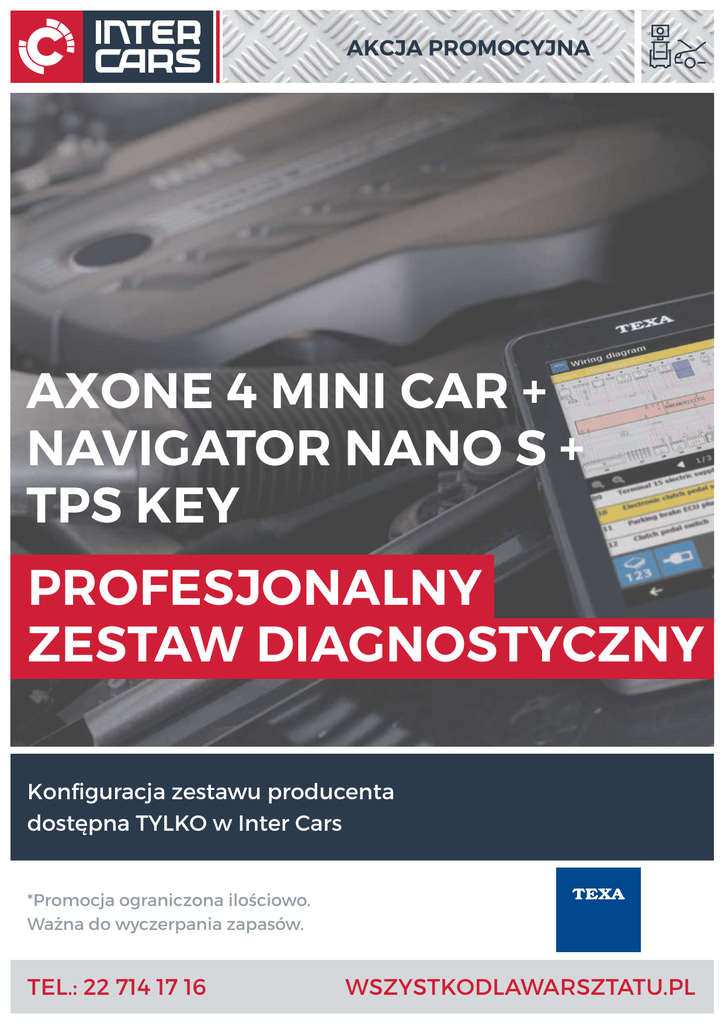 AKCJA PROMOCYJNA AXONE 4 MINI CAR + NAVIGATOR NANO S + TPS KEY PROFESJONALNY ZESTAW DIAGNOSTYCZNY Konfiguracja zestawu producenta dostępna TYLKO w Inter Cars *Promocja ograniczona ilościowo. Ważna do wyczerpania zapasów. TEL.: 22 714 17 16 WSZYSTKODLAWARSZTATU.PL AKCJA PROMOCYJNA AXONE 4 MINI CAR + NAVIGATOR nano S + TPS KEY AXONE 4 MINI CAR to wielofunkcyjne narzędzie, które dzięki modułowi Navigator nano S i kluczowi TPS KEY pozwala na pełną diagnozę samochodów: - samochodów osobowych - samochodó dostawczych - systemów kontroli ciśnienia kół – TPMS AXONE 4 MINI Przejmuje w zakresie diagnostyki większość wyjątkowych cech, dzięki którym tablet AXONE 4 odniósł sukces na całym świecie. Wyrafinowaną estetykę zawdzięcza rezystancyjnemu ekranowi 7 calowemu o rozdzielczości 800x1280, a procesor Cortex A8 zapewnia mu wyjątkową szybkość. AXONE 4 Mini jest praktyczny i bardzo solidny (Standard IP 42), stanowi idealne rozwiązanie dla wymagającego środowiska warsztatowego. Navigator nano S Stanowi podstawowe rozwiązanie wśród interfejsów diagnostycznych TEXA. Jest mały, lekki i ergonomiczny. Został zaprojektowany zgodnie z oczekiwaniami nowoczesnego warsztatu, dając mechanikom możliwość przeprowadzenia wszystkich testów diagnostycznych w szybki i wygodny sposób. TPS KEY Przekształca AXONE 4 MINI w pełni funkcjonalne rozwiązania sprzętowe do pełnej obsługi czujników TPMS. Instalacja TPS KEY odbywa się poprzez umieszczenie go w porcie USB urządzenia, w prosty i bezpośredni sposób, a aplikacja APP TPMS Repair prowadzi użytkownika krok po kroku przez wszystkie etapy pracy. Navigator nano S *Promocja ograniczona ilościowo. Ważna do wyczerpania zapasów. TEL.: 22 714 17 16 WSZYSTKODLAWARSZTATU.PL AKCJA PROMOCYJNA AXONE 4 MINI CAR + NAVIGATOR nano S + TPS KEY Cechy zestawu: WYJĄTKOWO ŁATWA OBSŁUGA: dzięki menu wykorzystującym ikony graficzne, użytkownik nieustannie widzi zakres dostępnych możliwości i funkcji, które może uruchomić prostym “dotknięciem ekranu”. ZINTEGROWANE DANE TECHNICZNE: schematy elektryczne i dane mechaniczne są doskonale zintegrowane z danymi diagnostycznymi. TGS3s: TEXA Global Scan 3s to automatyczne skanowanie wszystkich elektronicznych jednostek sterujących dostępnych dla diagnostyki i zainstalowanych w pojeździe. NIEZRÓWNANE POKRYCIE DIAGNOSTYCZNE: najszersza baza ponad 350 tyś. opcji diagnostycznych CAR i ponad 100 tyś. opcji TPMS WOJSKOWA SOLIDNOŚĆ: Zaprojektowany zgodnie z normami wojskowymi MIL STD 810 jest w stanie wytrzymać najbardziej wrogie i trudne warunki pracy, które często występują w środowisku warsztatowym Skład zestawu promocyjnego: - jednostka AXONE 4 MINI - moduł diagnostyczny Navigator nano S - moduł TPS KEY - karta pamięci SD z oprogramowaniem IDC4 PM CAR - zasilacz sieciowy - walizka ochronna Opcjonalnie AXONE 4 MINI CAR można rozbudować o diagnozę: - samochody sportowe (SUPERCAR) - motocykle (BIKE) Konfiguracja zestawu producenta dostępna TYLKO w Inter Cars Promocyjna cena zestawu: 7 490 PLN netto* Cena katalogowa: 12 390 PLN netto Indeks: TEXD10111/SET *Promocja ograniczona ilościowo. Ważna do wyczerpania zapasów. TEL.: 22 714 17 16 WSZYSTKODLAWARSZTATU.PL