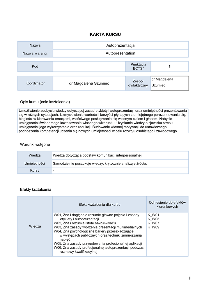 KARTA KURSU Nazwa Autoprezentacja Nazwa w j. ang. Autopresentation Punktacja ECTS* Kod dr Magdalena Szumiec Koordynator 1 Zespół dydaktyczny dr Magdalena Szumiec Opis kursu (cele kształcenia) Umożliwienie zdobycia wiedzy dotyczącej zasad etykiety i autoprezentacji oraz umiejętności prezentowania się w różnych sytuacjach. Uzmysłowienie wartości i korzyści płynących z umiejętnego porozumiewania się, biegłości w kierowaniu emocjami, właściwego posługiwania się własnym ciałem i głosem. Nabycie umiejętności świadomego kształtowania własnego wizerunku. Uzyskanie wiedzy o zjawisku stresu i umiejętności jego wykorzystania oraz redukcji. Budowanie własnej motywacji do ustawicznego podnoszenia kompetencji uczenia się nowych umiejętności w celu rozwoju osobistego i zawodowego. Warunki wstępne Wiedza Umiejętności Kursy Wiedza dotycząca podstaw komunikacji interpersonalnej Samodzielnie poszukuje wiedzy, krytycznie analizuje źródła. - Efekty kształcenia Efekt kształcenia dla kursu Wiedza W01, Zna i dogłębnie rozumie główne pojęcia i zasady etykiety i autoprezentacji W02, Zna i rozumie istotę savoir-vivre’u W03, Zna zasady tworzenia prezentacji multimedialnych W04, Zna psychologiczne bariery przeszkadzające w występach publicznych oraz techniki zmniejszania napięć W05, Zna zasady przygotowania profesjonalnej aplikacji W06, Zna zasady profesjonalnej autoprezentacji podczas rozmowy kwalifikacyjnej Odniesienie do efektów kierunkowych K_W01 K_W05 K_W07 K_W09 1 Odniesienie do efektów kierunkowych Efekt kształcenia dla kursu Umiejętności U01, Posiada umiejętność wykorzystania zasad autoprezentacji w różnych kontekstach sytuacyjnych U02, Posiada umiejętność tworzenia prezentacji multimedialnych zgodnych z przyjętymi zasadami U03, Potrafi przygotować profesjonalną aplikację (CV i list motywacyjny) K_U06 K_U07 K_U09 K_U10 K_U15 Odniesienie do efektów kierunkowych Efekt kształcenia dla kursu Kompetencje społeczne K01, Rozumie potrzebę rozwoju własnych kompetencji w zakresie autoprezentacji. K02, Reprezentuje postawę i zachowania zgodne z zasadami savoir-vivre’u K03, Jest przekonany co do istoty kultury wyglądu zewnętrznego jako techniki wywierania wpływu K_K01 K_K02 K_K04 K_K06 K_K07 Organizacja Forma zajęć Liczba godzin Ćwiczenia w grupach Wykład w formie zdalnej A K L S P E 15 Opis metod prowadzenia zajęć Metody nauczania na odległość (dyskusja na forum i wymiana doświadczeń, prezentacje multimedialne, filmy, pliki Word, zadania do wykonania przez studentów, interaktywne ćwiczenia) W01 W02 W03 W04 W05 W06 U01 X X X X X X X X X X X X X X Inne (zadania) Egzamin pisemny (test zaliczeniowy) Egzamin ustny Praca pisemna (esej) Referat Udział w dyskusji Projekt grupowy Projekt indywidualny Praca laboratoryjna Zajęcia terenowe Ćwiczenia w szkole Gry dydaktyczne E – learning Formy sprawdzania efektów kształcenia X X X X X X X 2 U02 U03 K01 K02 K03 X X X X X Kryteria oceny X X X X X X X X X X Na ocenę końcową składają się: aktywny udział w dyskusji na forum, wykonywanie zadań po zakończeniu danej partii materiału, zaliczenie testu umieszczonego na platformie e-learningowej Moodle. Uwagi Treści merytoryczne (wykaz tematów) 1. Pojęcie autoprezentacji. Funkcje autoprezentacji. 2. Pięć strategii autoprezentacyjnych (ingracjacja, onieśmielanie, egzemplifikacji, suplikacji, autopromocji). 3. Elementy savoir-vivre’u. 4. Kultura wyglądu zewnętrznego; styl i sposób noszenia się jako jeszcze jedna technika wywierania wpływu. 5. Przestrzeń w kontaktach międzyludzkich. 6. Ładne prezentacje. 7. Struktura wystąpień publicznych. 8. Elementy werbalne i niewerbalne w wystąpieniach publicznych. 9. Rola pierwszego wrażenia. Czynniki decydujące o kontroli wrażenia. 10. Panowanie nad językiem ciała. 11. Psychologiczne bariery przeszkadzające w występach publicznych. Strach i trema, techniki zmniejszania napięć; 12. Przygotowanie profesjonalnej aplikacji (zasady przygotowania CV, zasady przygotowania listu motywacyjnego) 13. Rozmowa kwalifikacyjna – jak należy się do niej. Zasady profesjonalnej autoprezentacji podczas rozmowy kwalifikacyjnej Wykaz literatury podstawowej 1. Blein B., Sztuka prezentacji i wystąpień publicznych, Wydawnictwo RM, Warszawa 2010 r. 2. Bralczyk J., Kłosińska M., Ogórek M., Gruszczyński W. Wiem, Co Mówię, Czyli O Dobrej Komunikacji, Oficyna Wydawnicza Branta, Bydgoszcz-Warszawa 2011 r. 3. Cialdini R.B., Wywieranie wpływu na ludzi. Teoria i praktyka, Gdańskie Wydawnictwo Psychologiczne, Gdańsk 2004 r. 4. Eggert M., Doskonałe CV, Dom Wydawniczy Rebis, Poznań 2001 r. 5. Fischer R., Ury W., Patton B. Dochodząc do TAK. Negocjacje bez poddawania się, Polskie Wydawnictwa Ekonomiczne, Warszawa 2004 r. 6. Królik G., Autoprezentacja, Wydawnictwo Akademii Ekonomicznej, Katowice 2004 r. 3 Wykaz literatury uzupełniającej 1. Kulczycka L. Jak napisać najlepsze CV i list motywacyjny?, Wolters Kluwer, Warszawa 2007 r. 2. Leary M., Wywieranie wrażenia na innych, Gdańskie Wydawnictwo Psychologiczne, Gdańsk 1999 r. 3. Malczak M., Psychologia w kontaktach zawodowych, Consultor, Lublin 2000 r. 4. Nęcka E., Trening twórczości, PTP, Olsztyn 1992 r. 5. Pease A., Język ciała: jak odczytywać myśli ludzi z ich gestów, Gemini, Kraków 1998 r. 6. Stewart J, Mosty zamiast murów, Wydawnictwo Naukowe PWN, Warszawa 2003 r. 7. Zbiegień-Maciąg L., Taktyka i techniki negocjacyjne, Wydawnictwo AGH, Kraków 2001 r. 8. Leary M., Wywieranie wrażenia na innych. O sztuce autoprezentacji, Gdańskie Wydawnictwo Psychologiczne, Gdańsk 2012 r. 9. Oczkoś M., Paszczodźwięki. Mały poradnik wielkich mówców, Wydawnictwo RM, Warszawa 2010 r. 10. Rusinek M., Załazińska A., Retoryka podręczna, czyli jak wnikliwie słuchać i przekonująco mówić, Wydawnictwo Znak, Kraków 2007 r. 11. Tierney E., Doskonalenie komunikacji międzyludzkiej na 101 sposobów, IFC PRESS, Kraków 2000 r. 1