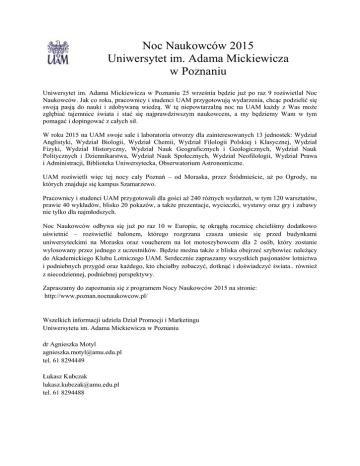 Noc Naukowców 2015 Uniwersytet im. Adama Mickiewicza w Poznaniu Uniwersytet im. Adama Mickiewicza w Poznaniu 25 września będzie już po raz 9 rozświetlał Noc Naukowców. Jak co roku, pracownicy i studenci UAM przygotowują wydarzenia, chcąc podzielić się swoją pasją do nauki i zdobywaną wiedzą. W tę niepowtarzalną noc na UAM każdy z Was może zgłębiać tajemnice świata i stać się najprawdziwszym naukowcem, a my będziemy Wam w tym pomagać i dopingować z całych sił. W roku 2015 na UAM swoje sale i laboratoria otworzy dla zainteresowanych 13 jednostek: Wydział Anglistyki, Wydział Biologii, Wydział Chemii, Wydział Filologii Polskiej i Klasycznej, Wydział Fizyki, Wydział Historyczny, Wydział Nauk Geograficznych i Geologicznych, Wydział Nauk Politycznych i Dziennikarstwa, Wydział Nauk Społecznych, Wydział Neofilologii, Wydział Prawa i Administracji, Biblioteka Uniwersytecka, Obserwatorium Astronomiczne. UAM rozświetli więc tej nocy cały Poznań – od Moraska, przez Śródmieście, aż po Ogrody, na których znajduje się kampus Szamarzewo. Pracownicy i studenci UAM przygotowali dla gości aż 240 różnych wydarzeń, w tym 120 warsztatów, prawie 40 wykładów, blisko 20 pokazów, a także prezentacje, wycieczki, wystawy oraz gry i zabawy nie tylko dla najmłodszych. Noc Naukowców odbywa się już po raz 10 w Europie, tę okrągłą rocznicę chcieliśmy dodatkowo uświetnić – rozświetlić balonem, którego rozgrzana czasza uniesie się przed budynkami uniwersyteckimi na Morasku oraz voucherem na lot motoszybowcem dla 2 osób, który zostanie wylosowany przez jednego z uczestników. Będzie można także z bliska obejrzeć szybowiec należący do Akademickiego Klubu Lotniczego UAM. Serdecznie zapraszamy wszystkich pasjonatów lotnictwa i podniebnych przygód oraz każdego, kto chciałby zobaczyć, dotknąć i doświadczyć świata.. również z niecodziennej, podniebnej perspektywy. Zapraszamy do zapoznania się z programem Nocy Naukowców 2015 na stronie: http://www.poznan.nocnaukowcow.pl/ Wszelkich informacji udziela Dział Promocji i Marketingu Uniwersytetu im. Adama Mickiewicza w Poznaniu dr Agnieszka Motyl [email protected] tel. 61 8294449 Łukasz Kubczak [email protected] tel. 61 8294488 Uniwersytet im. Adama Mickiewicza w Poznaniu rozświetla Noc Naukowców Przykładowe wydarzenia: Wydział Anglistyki Wydział Biologii DŁUGONOSY FRANEK I WĄSATY FELEK, CZYLI KRÓTKA HISTORIA O TYM, JAK ŚREDNIOWIECZNI WALIJCZYCY WYMYŚLALI SOBIE PRZEZWISKA I PSEUDONIMY Wykład odpowie na pytania: po co Walijczykom przezwiska? Czy pseudonim to to samo, co nazwisko? Czy Królowa Brytyjska ma przezwisko? MEDYCYNA REGENERACYJNA – SCIENCE-FICTION CZY NAJBLIŻSZA PRZYSZŁOŚĆ? Drukowanie tkanek, odtwarzanie uszkodzonych mięśni, budowanie nowych narządów – brzmi jak science fiction, daleka przyszłość? A może jednak wszystko to stanie się rzeczywistością szybciej niż nam się wydaje? (wykład) WARSZTATY Z PODSTAW PERFUMIARSTWA Wydział Chemii Wydział Filologii Polskiej i Klasycznej Zapraszamy na wspólne odkrywanie świata zapachów na warsztatach! Tematem przewodnim warsztatów będą zapachy kwiatowe stosowane w perfumiarstwie. Jakie składniki perfum składają się na zapach kwiatowy; w czym tkwi sekret róży, że zachwyca jak żaden inny kwiat; z czego wynika tak intensywny zapach jaśminu? SZTUKA JAKO NAUKA, NAUKA JAKO SZTUKA Prezentacja omawiać będzie projekty z pogranicza sztuki i nauki, prowadzone przez Interdyscyplinarne Centrum Badawcze Humanistyka/Sztuka/Technologia. FASCYNUJĄCA FIZYKA Wydział Fizyki Interaktywne pokazy doświadczeń ukazujące naturę otaczającego świata i piękno wybranych zjawisk z wielu działów fizyki: elektryczności i magnetyzmu, optyki, fizyki niskich temperatur, fizyki plazmy... TAJEMNICE COLLEGIUM HISTORICUM NOVUM Wydział Historii Wycieczka. Zwiedzając z przewodnikiem nową siedzibę Wydziału Historycznego, można poznać najnowszy i najnowocześniejszy budynek UAM, jeszcze zanim rozpoczną się w nim zajęcia dla studentów! To okazja, aby zajrzeć także w te zakamarki nowego gmachu, które na co dzień są niedostępne dla osób z zewnątrz. ODA DI NEURO Wydział Nauk Społecznych Instalacja przeniesie odbiorcę do symbolicznej reprezentacji mózgu. Odbiorca wkracza w przestrzeń instalacji z nałożonym na głowę urządzeniem EEG, które mapuje częstotliwości jego fal mózgowych. Informacje te, uzależnione od aktywności umysłowej osoby wpiętej w instalację reprezentowane są poprzez migające diody oraz sekwencje dźwiękowe. ROPA I GAZ, CZYLI JAK ZOSTAĆ SZEJKIEM NAFTOWYM Wydział Nauk Geograficznych i Geologicznych Uczestnicy warsztatów poznają podstawowe informacje dotyczące złóż węglowodorów: historię przemysłu naftowego, metody poszukiwawcze i wydobywcze. Wspólnie z uczestnikami zamienimy się w prawdziwy zespół naftowców – poszukamy złóż ropy naftowej i gazu ziemnego oraz zajmiemy się ich wydobyciem. Wydział Nauk Politycznych i Dziennikarstwa NOC ŻYWYCH MEDIÓW Warsztaty dziennikarskie z zakresu obsługi sprzętu telewizyjnego, radiowego, nagrywanie, montowanie, realizacja a wszystko utrzymane w ciekawej konwencji niepowtarzalnego medialnego wydarzenia. Wydział Neofilologii Wydział Prawa i Administracji POCIĄG DO JĘZYKÓW Podczas Nocy Naukowców podróżni wsiądą w pociąg, który zabierze ich w zachwycającą podróż po świecie języków i kultur. Warsztaty i pokazy. ZOBACZ ROZPRAWĘ Warsztaty. Krótka prelekcja na temat podstawowych zagadnień prawa cywilnego procesowego ze szczególnym uwzględnieniem rozprawy oraz symulacja rozprawy z podziałem na role. MALOWANIE PO WODZIE, CZYLI SZTUKA EBRU Biblioteka Uniwersytecka Warsztaty z techniki zdobienia papieru polegającej na nanoszeniu farb na powierzchnię wody, a następnie przenoszeniu gotowego wzoru na papier. POLOWANIE NA SUPERNOWE Obserwatorium Astronomiczne Obserwacje na żywo wybuchu gwiazdy z