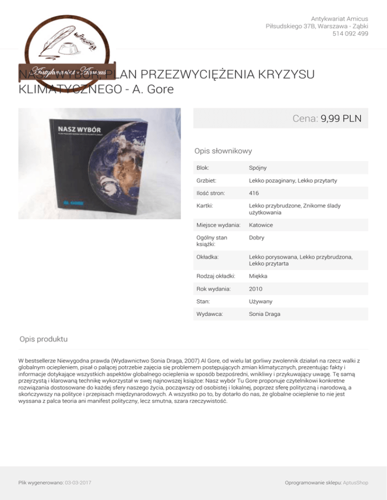 Antykwariat Amicus Piłsudskiego 37B, Warszawa - Ząbki 514 092 499 NASZ WYBÓR, PLAN PRZEZWYCIĘŻENIA KRYZYSU KLIMATYCZNEGO - A. Gore Cena: 9,99 PLN Opis słownikowy Blok: Spójny Grzbiet: Lekko pozaginany, Lekko przytarty Ilość stron: 416 Kartki: Lekko przybrudzone, Znikome ślady użytkowania Miejsce wydania: Katowice Ogólny stan książki: Dobry Okładka: Lekko porysowana, Lekko przybrudzona, Lekko przytarta Rodzaj okładki: Miękka Rok wydania: 2010 Stan: Używany Wydawca: Sonia Draga Opis produktu W bestsellerze Niewygodna prawda (Wydawnictwo Sonia Draga, 2007) Al Gore, od wielu lat gorliwy zwolennik działań na rzecz walki z globalnym ociepleniem, pisał o palącej potrzebie zajęcia się problemem postępujących zmian klimatycznych, prezentując fakty i informacje dotykające wszystkich aspektów globalnego ocieplenia w sposób bezpośredni, wnikliwy i przykuwający uwagę. Tę samą przejrzystą i klarowaną technikę wykorzystał w swej najnowszej książce: Nasz wybór Tu Gore proponuje czytelnikowi konkretne rozwiązania dostosowane do każdej sfery naszego życia, począwszy od osobistej i lokalnej, poprzez sferę polityczną i narodową, a skończywszy na polityce i przepisach międzynarodowych. A wszystko po to, by dotarło do nas, że globalne ocieplenie to nie jest wyssana z palca teoria ani manifest polityczny, lecz smutna, szara rzeczywistość. Plik wygenerowano: 03-03-2017 Oprogramowanie sklepu: AptusShop Antykwariat Amicus Piłsudskiego 37B, Warszawa - Ząbki 514 092 499 Galeria Plik wygenerowano: 03-03-2017 Powered by TCPDF (www.tcpdf.org) Oprogramowanie sklepu: AptusShop