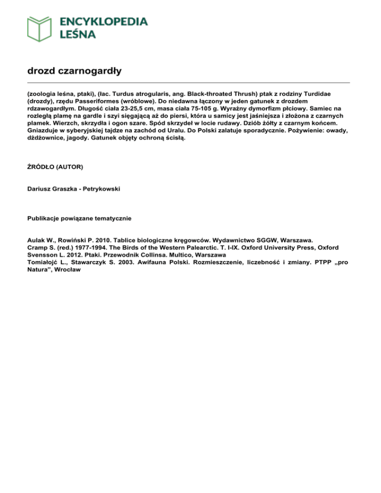 drozd czarnogardły (zoologia leśna, ptaki), (łac. Turdus atrogularis, ang. Black-throated Thrush) ptak z rodziny Turdidae (drozdy), rzędu Passeriformes (wróblowe). Do niedawna łączony w jeden gatunek z drozdem rdzawogardłym. Długość ciała 23-25,5 cm, masa ciała 75-105 g. Wyraźny dymorfizm płciowy. Samiec na rozległą plamę na gardle i szyi sięgającą aż do piersi, która u samicy jest jaśniejsza i złożona z czarnych plamek. Wierzch, skrzydła i ogon szare. Spód skrzydeł w locie rudawy. Dziób żółty z czarnym końcem. Gniazduje w syberyjskiej tajdze na zachód od Uralu. Do Polski zalatuje sporadycznie. Pożywienie: owady, dżdżownice, jagody. Gatunek objęty ochroną ścisłą. ŹRÓDŁO (AUTOR) Dariusz Graszka - Petrykowski Publikacje powiązane tematycznie Aulak W., Rowiński P. 2010. Tablice biologiczne kręgowców. Wydawnictwo SGGW, Warszawa. Cramp S. (red.) 1977-1994. The Birds of the Western Palearctic. T. I-IX. Oxford University Press, Oxford Svensson L. 2012. Ptaki. Przewodnik Collinsa. Multico, Warszawa Tomiałojć L., Stawarczyk S. 2003. Awifauna Polski. Rozmieszczenie, liczebność i zmiany. PTPP „pro Natura”, Wrocław