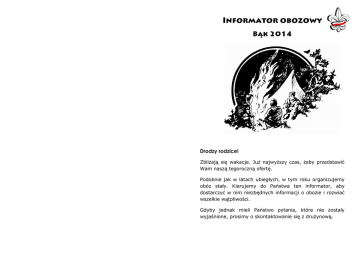 Drodzy rodzice! Zbliżają się wakacje. Już najwyższy czas, żeby przedstawić Wam naszą tegoroczną ofertę. Podobnie jak w latach ubiegłych, w tym roku organizujemy obóz stały. Kierujemy do Państwa ten informator, aby dostarczyć w nim niezbędnych informacji o obozie i rozwiać wszelkie wątpliwości. Gdyby jednak mieli Państwo pytania, które nie zostały wyjaśnione, prosimy o skontaktowanie się z drużynową. Notka od autorki informatora Czas trwania obozu: 8 – 29 lipca 2014r. Miejsce obozu: Bąk nad kanałem Wdy, gmina Karsin. Uczestnicy: 5 GDHy „Knieja”, 7 ODHek „Szkwał”, 17 GDHek „Cardiaca” Cena: 700zł Imię i nazwisko komendanta, kontakt: phm. Piotr Dudojć, tel. 728 415 419 Imię i nazwisko drużynowej, kontakt: p.o. sam. Angelika Gnatkowska, tel. 693 623 003 Organizator obozu: Okręg Pomorski ZHR ul. Zator Przytockiego 4 80-245 Gdańsk NIP: 957-090-39-62 Tel/fax 58 241-27-87 Warunkiem uczestnictwa jest oddanie wypełnionej karty uczestnika do 11 maja 2014 oraz wpłata pieniędzy za obóz wg harmonogramu. Karta kwalifikacyjna musi mieć wypełnione wszystkie strony. Szczególnie istotne jest dla nas jak najrzetelniejsze wypełnienie części dot. stanu zdrowia dziecka oraz podanie numeru PESEL. Bardzo prosimy o odnotowanie na kartach wszelkich informacji dotyczących zażywanych leków oraz ich dawkowania. Są to dane niezbędne do zapewnienia odpowiedniej opieki medycznej podczas obozu. Zwracamy również uwagę na podanie kontaktu z Państwem podczas trwania obozu. Mimo, że jeszcze będzie zebranie z rodzicami, gdzie prawdopodobnie zostaną rozwiane wszystkie wątpliwości i niepewności, chciałabym podzielić się z Państwem moim doświadczeniem związanym z obozem. Pierwsza sprawa: lepiej, aby dzieci nie brały komórek. Piszę to w pełnej trosce o ich telefony, ponieważ czasami jest tak, że harcerki je po prostu gubią. Kontakt ze swoim dzieckiem możecie mieć państwo przez zadzwonienie do drużynowej. Mimo, że w liście przydatnych przedmiotów prześcieradło może wydawać się trochę dziwne, jest bardzo potrzebne, ponieważ jest to wymóg Sanepidu. Proszę też zabrać koc. To na co chciałabym jeszcze zwrócić uwagę to to, ile dziecko bierze rzeczy. Proszę się kierować tą zasadą przy pakowaniu: plecak jest na tyle lekki, że dziecko może samodzielnie go nieść i z nim iść. W stronę od samochodu do pociągu/autokaru pewnie Państwo pomogą swojemu dziecku, ale potem trzeba będzie jeszcze trochę przejść samemu. Niektóre rzeczy lepiej zamienić na alternatywy. Np. zamiast oddzielnie noża, widelca i łyżki lepiej wziąć plastikowy niezbędnik, a zamiast dużej tubki z pastą do zębów lepiej jest zaopatrzyć się w mniejszą „wersję”. Proszę nie brać zbyt dużo ubrań. Harcerki są samodzielne i same sobie piorą ubrania. Właśnie - niech w plecaku znajdzie się trochę proszku do prania. I dużo chusteczek nawilżonych. Co do linki na prycz – może się nadać linka na bieliznę, aczkolwiek nie polecam. Bardzo się rozciąga i co chwilę trzeba ją poprawiać. Bardziej się nada linka pryczówka lub podobna (można ją kupić na skladnicaharcerska.pl, tak samo jak inne przydatne artykuły obozowe/biwakowe/harcerskie). Mam nadzieję, że tą notką chociaż trochę pomogłam Państwu i Waszym dzieciom w pakowaniu się na obóz. :) Czuwaj! trop. Marta Jachimczyk - do 14 maja - 300 zł Osobą odpowiedzialną za obóz jest komendant, phm. Piotr Dudojć, a także osoby pełniące funkcje wychowawcze w drużynie (drużynowi i drużynowe). Wszyscy opiekunowie legitymują się odpowiednimi kwalifikacjami i uprawnieniami. Aby zapewnić uczestnikom dogodne warunki i ułatwić organizację, kadrę obozu tworzą też osoby takie jak kwatermistrz, kucharz. Za opiekę medyczną na obozie odpowiedzialna jest opiekunka drużyny Paulina Patalon. - do 10 czerwca – pozostała kwota (400 zł) Wpłat prosimy dokonywać na konto obozowe Nr konta: 17 1240 1255 1111 0010 5739 0845 W tytule przelewu proszę wpisać: Składka programowa – obóz harcerski; imię i nazwisko uczestnika; drużyna; miejscowość; termin Np. składka programowa – obóz harcerski; Jachimczyk; Szkwał; Bąk; termin 8-29.07.2014 Telefony komórkowe: uczestnicy, którzy wezmą ze sobą telefony komórkowe, będą zobowiązani do złożenia ich w depozycie u wychowawcy. Telefony będą wydawane do użytku tylko na czas ciszy poobiedniej. W sprawach pilnych prosimy o kontakt z wychowawcą. Dzień odwiedzin: w trakcie obozu planujemy specjalny dzień, w którym będą mogli Państwo odwiedzić swoje dzieci i sami zobaczyć jak wygląda nasz obóz. Będzie to 20.07.14r. www.szkwal.wordpress.com Marta Pieniądze można wpłacać tylko i wyłącznie na konto! Potwierdzenie przelewu proszę przesyłać na e-mail: [email protected] Rzeczy obowiązkowe: Legitymacja szkolna Portfel + kieszonkowe Czysty zeszyt Bzdurnik (igła, nitki, zapałki itp.) Przybory do pisania Linka na prycz, pryczówka (z naturalnych włókien, ok. 35-50m) Notatnik, śpiewnik Latarka, zapasowe baterie Prześcieradło BIAŁE (!) Sprzęt: Plecak duży Plecak mały Śpiwór (ciepły!) Karimata Jasiek Menażka lub miska metalowa Kubek Sztućce lub niezbędnik Koc Ubrania: Ubrania na pionierkę (takie, które można zniszczyć, pobrudzić żywicą itp.) Bielizna Podkoszulki Skarpetki Bluzki na krótki rękaw Bluzki na długi rękaw Coś ciepłego (bluza, sweter) Spodnie długie i krótkie Rzeczy do spania Czapka/letnie nakrycie głowy Przeciwdeszczówka Folia przeciwdeszczowa Obuwie sportowe, wygodne obuwie do chodzenia Klapki Obuwie mundurowe Mundur: - bluza - spódnica - getry - chusta - pierścień (tzw. skuwka) - pasek - wywijki Strój fabularny – strój elfa Kosmetyki: Ręcznik duży Ręcznik mały Mydło Pasta do zębów Szczoteczka do zębów Patyczki do uszu Żel pod prysznic Szampon do włosów Gąbka Dezodorant Chusteczki higieniczne Chusteczki nawilżone Lusterko i inne Rzeczy 
