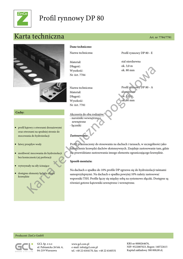 Profil rynnowy DP 80 Karta techniczna Art. nr 7784/7781 Dane techniczne: Profil rynnowy DP 80 - E Materiał: Długość: Wysokość: Nr Art. 7784 stal nierdzewna ok. 3,0 m ok. 80 mm gl ą Profil rynnowy DP 80 - A aluminium ok. 3,0 m ok. 80 mm po Nazwa techniczna: Materiał: Długość: Wysokość: Nr Art. 7781 do w a Nazwa techniczna: • łatwy przepływ wody • możliwość mocowania do hydroizolacji te bez konieczności jej perforacji Zastosowanie: Profil przeznaczony do stosowania na dachach i tarasach, w szczególności jako zakończenie krawędzi dachów ekstensywnych. Znajduje zastosowanie tam, gdzie nie przewidziano zastosowania innego elementu ograniczającego krawędzie. ch n oraz otworami na spodniej stronie do mocowania do hydroizolacji na • profil kątowy z otworami drenażowymi Akcesoria do obu rodzajów: - narożniki wewnętrzne i zewnętrzne - łączniki icz Cechy: Sposób montażu: • wytrzymały na siły ścinające Ka r krawędzie ta • dostępne elementy łączące długie Na dachach o spadku do 10% profile DP zgrzewa się do hydroizolacji taśmami samoprzylepnymi. Na dachach o spadku powyżej 10% należy zastosować wsporniki TSH. Profile łączy się między sobą na systemowe złączki. Dostępne są również gotowe kątowniki zewnętrzne i wewnętrzne. Producent: ZinCo GmbH GCL Sp. z o.o ul. Pabianicka 26 lok. 6, 04-219 Warszawa www.gcl.com.pl e-mail: [email protected] tel. +48 22 6164170, fax: +48 22 6160531 KRS nr 0000264676, NIP: 9522007023, Regon: 140722615 Kapitał zakładowy 300 000,00 zł,