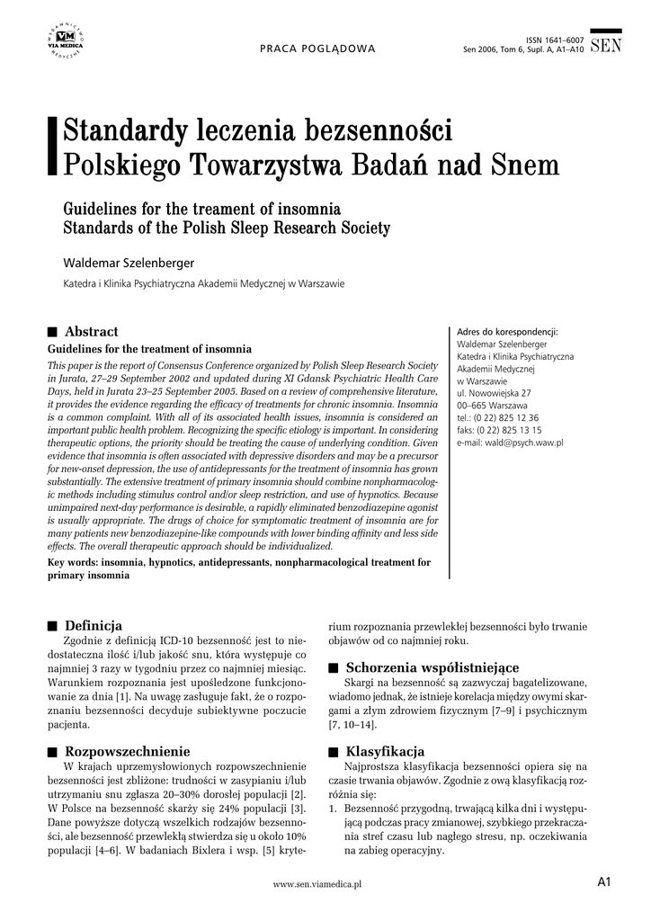 PRACA POGLĄDOWA ISSN 1641–6007 Sen 2006, Tom 6, Supl. A, A1–A10 SEN Standardy leczenia bezsenności Polskiego Towarzystwa Badań nad Snem Guidelines for the treament of insomnia Standards of the Polish Sleep Research Society Waldemar Szelenberger Katedra i Klinika Psychiatryczna Akademii Medycznej w Warszawie t Abstract Guidelines for the treatment of insomnia This paper is the report of Consensus Conference organized by Polish Sleep Research Society in Jurata, 27–29 September 2002 and updated during XI Gdansk Psychiatric Health Care Days, held in Jurata 23–25 September 2005. Based on a review of comprehensive literature, it provides the evidence regarding the efficacy of treatments for chronic insomnia. Insomnia is a common complaint. With all of its associated health issues, insomnia is considered an important public health problem. Recognizing the specific etiology is important. In considering therapeutic options, the priority should be treating the cause of underlying condition. Given evidence that insomnia is often associated with depressive disorders and may be a precursor for new-onset depression, the use of antidepressants for the treatment of insomnia has grown substantially. The extensive treatment of primary insomnia should combine nonpharmacologic methods including stimulus control and/or sleep restriction, and use of hypnotics. Because unimpaired next-day performance is desirable, a rapidly eliminated benzodiazepine agonist is usually appropriate. The drugs of choice for symptomatic treatment of insomnia are for many patients new benzodiazepine-like compounds with lower binding affinity and less side effects. The overall therapeutic approach should be individualized. Adres do korespondencji: Waldemar Szelenberger Katedra i Klinika Psychiatryczna Akademii Medycznej w Warszawie ul. Nowowiejska 27 00–665 Warszawa tel.: (0 22) 825 12 36 faks: (0 22) 825 13 15 e-mail: [email protected] Key words: insomnia, hypnotics, antidepressants, nonpharmacological treatment for primary insomnia t Definicja Zgodnie z definicją ICD-10 bezsenność jest to niedostateczna ilość i/lub jakość snu, która występuje co najmniej 3 razy w tygodniu przez co najmniej miesiąc. Warunkiem rozpoznania jest upośledzone funkcjonowanie za dnia [1]. Na uwagę zasługuje fakt, że o rozpoznaniu bezsenności decyduje subiektywne poczucie pacjenta. rium rozpoznania przewlekłej bezsenności było trwanie objawów od co najmniej roku. t Schorzenia współistniejące Skargi na bezsenność są zazwyczaj bagatelizowane, wiadomo jednak, że istnieje korelacja między owymi skargami a złym zdrowiem fizycznym [7–9] i psychicznym [7, 10–14]. t Rozpowszechnienie t Klasyfikacja W krajach uprzemysłowionych rozpowszechnienie bezsenności jest zbliżone: trudności w zasypianiu i/lub utrzymaniu snu zgłasza 20–30% dorosłej populacji [2]. W Polsce na bezsenność skarży się 24% populacji [3]. Dane powyższe dotyczą wszelkich rodzajów bezsenności, ale bezsenność przewlekłą stwierdza się u około 10% populacji [4–6]. W badaniach Bixlera i wsp. [5] kryte- Najprostsza klasyfikacja bezsenności opiera się na czasie trwania objawów. Zgodnie z ową klasyfikacją rozróżnia się: 1. Bezsenność przygodną, trwającą kilka dni i występującą podczas pracy zmianowej, szybkiego przekraczania stref czasu lub nagłego stresu, np. oczekiwania na zabieg operacyjny. www.sen.viamedica.pl A1 SEN 2006, Tom 6, Supl. A 2. Bezsenność krótkotrwałą, do 3 tygodni, towarzyszącą nagłej chorobie somatycznej lub przewlekłemu stresowi, np. w żałobie. 3. Bezsenność przewlekłą, trwającą powyżej 1 miesiąca [15]. Obraz kliniczny jest zróżnicowany w zależności od czasu trwania objawów: u jednych chorych stwierdza się całodobowe wzmożone czuwanie, np. w bezsenności pierwotnej, ale u innych — z bezsennością przygodną i krótkotrwałą lub bezsennością przewlekłą wtórną do schorzeń internistycznych — może występować za dnia wzmożona senność. t Patogeneza Bezsenność ma różne przyczyny: bezsenność przygodna i krótkotrwała nie jest stanem chorobowym, lecz fizjologiczną reakcją ludzi zdrowych, natomiast bezsenność przewlekła wynika z pierwotnych zaburzeń snu lub jest wtórna do zaburzeń psychicznych, schorzeń somatycznych, działania lub odstawienia substancji psychoaktywnych. Badania epidemiologiczne wykazują, że 14–20% osób w populacji generalnej zgłaszających skargi na bezsenność choruje na dużą depresję [6, 16]. Epizody nawracającej depresji często są poprzedzone na kilka tygodni zaburzeniami snu [17]. U pacjentów zgłaszających się do ośrodków medycyny snu najczęstszym rozpoznaniem są zaburzenia afektywne: przyczyną bezsenności u 35% chorych są zaburzenia psychiczne, połowa z tych przypadków są to zaburzenia afektywne [18]. Jak wynika z badań Buyssego i wsp. [19], najczęstszą kategorią diagnostyczną, rozpoznawaną w pięciu amerykańskich ośrodkach medycyny snu, jest bezsenność wtórna do zaburzeń psychicznych. Podobne są też doświadczenia naszej Poradni Zaburzeń Snu [20]. W materiale zespołu Kalesa wszyscy chorzy z bezsennością przewlekłą mieli co najmniej jedno rozpoznanie w osi I lub II DSM-III, zaburzenia afektywne rozpoznano u 2/3 badanych, spośród zaburzeń afektywnych najczęstsze było rozpoznanie dystymii [7]. Są to wyniki porównywalne do danych Nowella i wsp. [21], a także do danych naszej Poradni [22]. Chorzy z zaburzeniami afektywnymi mogą się zgłaszać do lekarza pierwszego kontaktu lub do ośrodków medycyny snu ze skargami wyłącznie na bezsenność [12, 23], zaprzeczając istnieniu zaburzeń emocjonalnych i przypisując wszystkie inne dolegliwości zaburzeniom snu. W patogenezie bezsenności pierwotnej kluczowym pojęciem jest obecnie nadmierne wzbudzenie. Zidentyfikowano liczne parametry wzbudzenia, z których najważniejszym jest całodobowa aktywacja układu stresu, tj. osi podwzg