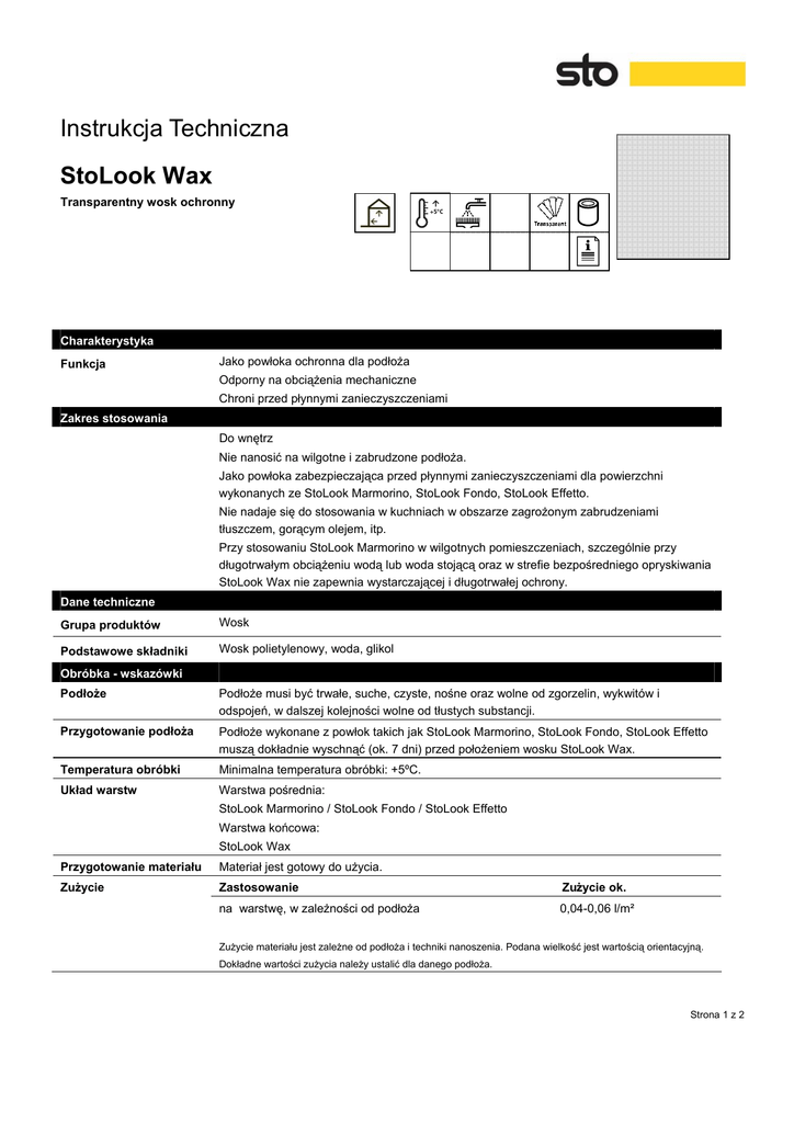 Instrukcja Techniczna StoLook Wax Transparentny wosk ochronny +5°C Charakterystyka Funkcja Jako powłoka ochronna dla podłoża Odporny na obciążenia mechaniczne Chroni przed płynnymi zanieczyszczeniami Zakres stosowania Do wnętrz Nie nanosić na wilgotne i zabrudzone podłoża. Jako powłoka zabezpieczająca przed płynnymi zanieczyszczeniami dla powierzchni wykonanych ze StoLook Marmorino, StoLook Fondo, StoLook Effetto. Nie nadaje się do stosowania w kuchniach w obszarze zagrożonym zabrudzeniami tłuszczem, gorącym olejem, itp. Przy stosowaniu StoLook Marmorino w wilgotnych pomieszczeniach, szczególnie przy długotrwałym obciążeniu wodą lub woda stojącą oraz w strefie bezpośredniego opryskiwania StoLook Wax nie zapewnia wystarczającej i długotrwałej ochrony. Dane techniczne Grupa produktów Wosk Podstawowe składniki Wosk polietylenowy, woda, glikol Obróbka - wskazówki Podłoże Podłoże musi być trwałe, suche, czyste, nośne oraz wolne od zgorzelin, wykwitów i odspojeń, w dalszej kolejności wolne od tłustych substancji. Przygotowanie podłoża Podłoże wykonane z powłok takich jak StoLook Marmorino, StoLook Fondo, StoLook Effetto muszą dokładnie wyschnąć (ok. 7 dni) przed położeniem wosku StoLook Wax. Temperatura obróbki Minimalna temperatura obróbki: +5ºC. Układ warstw Warstwa pośrednia: StoLook Marmorino / StoLook Fondo / StoLook Effetto Warstwa końcowa: StoLook Wax Przygotowanie materiału Materiał jest gotowy do użycia. Zużycie Zastosowanie Zużycie ok. na warstwę, w zależności od podłoża 0,04-0,06 l/m² Zużycie materiału jest zależne od podłoża i techniki nanoszenia. Podana wielkość jest wartością orientacyjną. Dokładne wartości zużycia należy ustalić dla danego podłoża. Strona 1 z 2 Instrukcja Techniczna StoLook Wax Obróbka StoLook Wax nanieść cienkowarstwowo w zależności od wymagań jedno- lub dwukrotnie przy użyciu suchej szmatki lub packi StoLook Marmorino-Glättekelle i wypolerować. Schnięcie Schnięcie-wskazówki: Szpachlowe masy gipsowe firm produkujących płyty kartonowo-gipsowe mogą wykazywać specjalną wrażliwość na działanie wilgoci. Ta wrażliwość może doprowadzić do tworzenia się pęcherzy na masach szpachlowych, a w końcowym efekcie do odprysków. Dlatego też zaleca się w instrukcjach technicznych ”szpachlowanie płyt gipsowych” i zapewnienie odpowiedniej wentylacji i temperatury. Czyszczenie narzędzi Wodą natychmiast po użyciu Formy dostawy Barwa Transparentny Składowanie Warunki składowania Chronić przed mrozem. Opakowania muszą być szczelnie zamknięte. Czas składowania Najlepsza jakość w oryginalnym opakowaniu do … (patrz opakowanie). Dodatkowe informacje Bezpieczeństwo Dodatkowe informacje dotyczące obchodzenia się z produktem, składowania i usuwania odpadów znajdują się w Karcie Charakterystyki Produktu Niebezpiecznego. Numer rewizyjny StoLook Wax/PL/016 Zastosowania nie wymienione w niniejszej Instrukcji Technicznej należy wcześniej skonsultować z przedstawicielem Sto. Zamieszczone informacje lub dane odnoszą się do standardowych zastosowań i nie mogą stanowić podstawy roszczeń odszkodowawczych. Sto-ispo Sp. z o.o. ul. Zabraniecka 15 03-872 Warszawa tel. +48 22 511 61 00 fax +48 22 511 61 01 [email protected] Nr rewizyjny Obowiązuje od StoLook Wax/PL/016 14.09.2009 www.sto.pl Strona 2 z 2