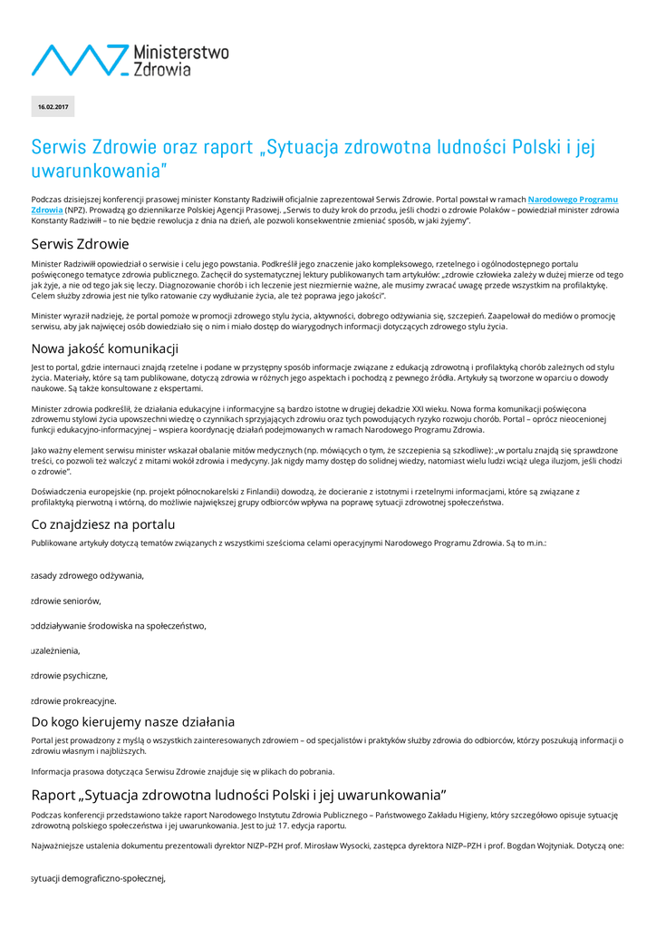 16.02.2017 Serwis Zdrowie oraz raport „Sytuacja zdrowotna ludności Polski i jej uwarunkowania” Podczas dzisiejszej konferencji prasowej minister Konstanty Radziwiłł oficjalnie zaprezentował Serwis Zdrowie. Portal powstał w ramach Narodowego Programu Zdrowia (NPZ). Prowadzą go dziennikarze Polskiej Agencji Prasowej. „Serwis to duży krok do przodu, jeśli chodzi o zdrowie Polaków – powiedział minister zdrowia Konstanty Radziwiłł – to nie będzie rewolucja z dnia na dzień, ale pozwoli konsekwentnie zmieniać sposób, w jaki żyjemy”. Serwis Zdrowie Minister Radziwiłł opowiedział o serwisie i celu jego powstania. Podkreślił jego znaczenie jako kompleksowego, rzetelnego i ogólnodostępnego portalu poświęconego tematyce zdrowia publicznego. Zachęcił do systematycznej lektury publikowanych tam artykułów: „zdrowie człowieka zależy w dużej mierze od tego jak żyje, a nie od tego jak się leczy. Diagnozowanie chorób i ich leczenie jest niezmiernie ważne, ale musimy zwracać uwagę przede wszystkim na profilaktykę. Celem służby zdrowia jest nie tylko ratowanie czy wydłużanie życia, ale też poprawa jego jakości”. Minister wyraził nadzieję, że portal pomoże w promocji zdrowego stylu życia, aktywności, dobrego odżywiania się, szczepień. Zaapelował do mediów o promocję serwisu, aby jak najwięcej osób dowiedziało się o nim i miało dostęp do wiarygodnych informacji dotyczących zdrowego stylu życia. Nowa jakość komunikacji Jest to portal, gdzie internauci znajdą rzetelne i podane w przystępny sposób informacje związane z edukacją zdrowotną i profilaktyką chorób zależnych od stylu życia. Materiały, które są tam publikowane, dotyczą zdrowia w różnych jego aspektach i pochodzą z pewnego źródła. Artykuły są tworzone w oparciu o dowody naukowe. Są także konsultowane z ekspertami. Minister zdrowia podkreślił, że działania edukacyjne i informacyjne są bardzo istotne w drugiej dekadzie XXI wieku. Nowa forma komunikacji poświęcona zdrowemu stylowi życia upowszechni wiedzę o czynnikach sprzyjających zdrowiu oraz tych powodujących ryzyko rozwoju chorób. Portal – oprócz nieocenionej funkcji edukacyjno-informacyjnej – wspiera koordynację działań podejmowanych w ramach Narodowego Programu Zdrowia. Jako ważny element serwisu minister wskazał obalanie mitów medycznych (np. mówiących o tym, że szczepienia są szkodliwe): „w portalu znajdą się sprawdzone treści, co pozwoli też walczyć z mitami wokół zdrowia i medycyny. Jak nigdy mamy dostęp do solidnej wiedzy, natomiast wielu ludzi wciąż ulega iluzjom, jeśli chodzi o zdrowie”. Doświadczenia europejskie (np. projekt północnokarelski z Finlandii) dowodzą, że docieranie z istotnymi i rzetelnymi informacjami, które są związane z profilaktyką pierwotną i wtórną, do możliwie największej grupy odbiorców wpływa na poprawę sytuacji zdrowotnej społeczeństwa. Co znajdziesz na portalu Publikowane artykuły dotyczą tematów związanych z wszystkimi sześcioma celami operacyjnymi Narodowego Programu Zdrowia. Są to m.in.: zasady zdrowego odżywania, zdrowie seniorów, oddziaływanie środowiska na społeczeństwo, uzależnienia, zdrowie psychiczne, zdrowie prokreacyjne. Do kogo kierujemy nasze działania Portal jest prowadzony z myślą o wszystkich zainteresowanych zdrowiem – od specjalistów i praktyków służby zdrowia do odbiorców, którzy poszukują informacji o zdrowiu własnym i najbliższych. Informacja prasowa dotycząca Serwisu Zdrowie znajduje się w plikach do pobrania. Raport „Sytuacja zdrowotna ludności Polski i jej uwarunkowania” Podczas konferencji przedstawiono także raport Narodowego Instytutu Zdrowia Publicznego – Państwowego Zakładu Higieny, który szczegółowo opisuje sytuację zdrowotną polskiego społeczeństwa i jej uwarunkowania. Jest to już 17. edycja raportu. Najważniejsze ustalenia dokumentu prezentowali dyrektor NIZP–PZH prof. Mirosław Wysocki, zastępca dyrektora NIZP–PZH i prof. Bogdan Wojtyniak. Dotyczą one: sytuacji demograficzno-społecznej, onkologicznych nierówności w Polsce, umieralności niemowląt, zaburzeń psychicznych, samobójstw, chorób zakaźnych (kiła), zanieczyszczenia powietrza, nadwagi i otyłości. W konferencji wzięli udział także prof. Wiesław Jędrzejczak krajowy konsultant w dziedzinie hematologii, dr Paulina Karwowska dyrektor Biura WHO w Polsce i Artur Dmochowski prezes PAP. Informacja prasowa dotycząca raportu znajduje się w plikach do pobrania. Raport „Sytuacja zdrowotna ludności Polski i jej uwarunkowania” Czytaj więcej o raporcie w Serwisie Zdrowie Pliki do pobrania: Informacja prasowa o portalu Serwis Informacja prasowa - Raport PZH o Zdrowie sytuacji zdrowotnej ludności Polski: 19,7 KB DOCX File żyjemy dłużej i skuteczniej leczymy niemowlęta 22,8 KB DOCX File Ministerstwo Zdrowia dokłada wszelkich starań, aby zawarte w tym miejscu dane były rzetelne, wyczerpujące i aktualne. Jednak mają one charakter wyłącznie informacyjny i nie mogą stanowić podstawy do jakichkolwiek roszczeń. Jeżeli opublikowany artykuł nie może zostać prawidłowo odczytany przez czytnik ekranu, prosimy o zgłoszenie tego poprzez przycisk „Zgłoś uwagę do artykułu”. Postaramy się jak najszybciej udostępnić bardziej czytelny plik dla osób korzystających z czytników ekranu.