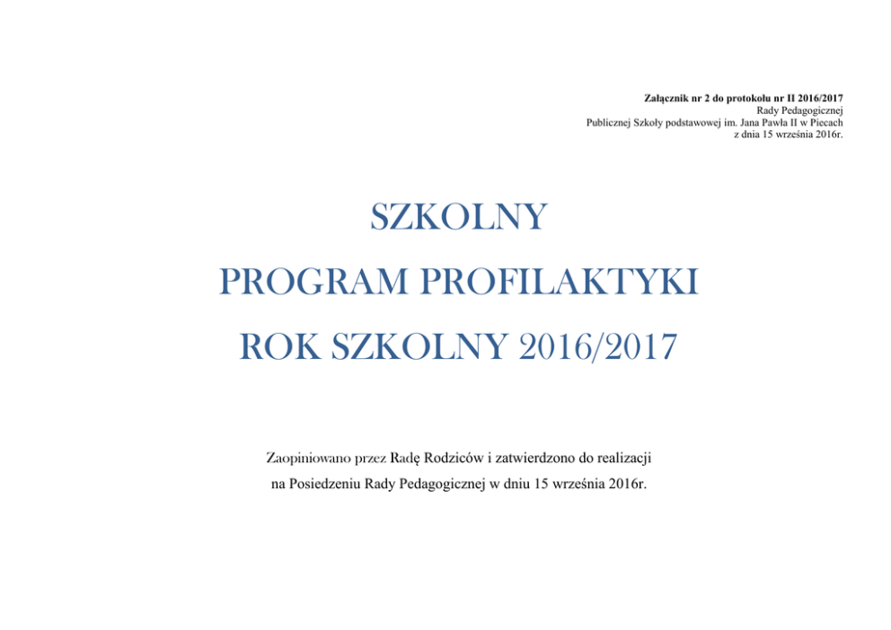 Załącznik nr 2 do protokołu nr II 2016/2017 Rady Pedagogicznej Publicznej Szkoły podstawowej im. Jana Pawła II w Piecach z dnia 15 września 2016r. SZKOLNY PROGRAM PROFILAKTYKI ROK SZKOLNY 2016/2017 Zaopiniowano przez Radę Rodziców i zatwierdzono do realizacji na Posiedzeniu Rady Pedagogicznej w dniu 15 września 2016r. O PROGRAMIE: Szkolny program profilaktyki jest programem profilaktyki środowiskowej, w którym obiektem działań jest całe środowisko szkolne. Profilaktyka to proces wspierający zdrowie psychiczne i fizyczne poprzez pomoc potrzebną uczniowi do konfrontacji ze złożonymi, stresującymi warunkami życia oraz towarzyszenie mu w zdobywaniu wiedzy o zagrożeniach dla zdrowia oraz nabywaniu umiejętności przeciwdziałania tym zagrożeniom, a także umożliwienie mu osiągania satysfakcjonującego, społecznie akceptowanego życia ZAŁOŻENIA PROGRAMU: Promocja zdrowego trybu życia poprzez rozwijanie zainteresowań uczniów, Rozpowszechnianie informacji dotyczących szkodliwości nałogów, Propagowanie zachowań zmierzających do eliminowania uzależnień, Wskazywanie na pozytywne strony życia bez uzależnień, Wskazanie różnych sposobów radzenia sobie z problemami, Wskazanie możliwości unikania zagrożeń, Wskazanie na zagrożenie cywilizacyjne- telewizja, Internet, Wspieranie rodziców i nauczycieli w ich roli wychowawczej. Kształtowanie postaw odpowiedzialności za własne zdrowie i życie, Zmiana niekorzystnych zachowań uczniów, Kształtowanie odpowiednich postaw społecznych, Wskazywanie na konieczność wyboru zachowań asertywnych umożliwiających wycofanie się z zachowań ryzykownych, Edukacji nauczycieli i rodziców w zakresie: - poznawanie potrzeb dziecka, - rozwiązywanie problemów przez wzajemna komunikację , - podnoszenie wiedzy na temat wszelkiego rodzaju uzależnień, - organizowanie zajęć pozaszkolnych i pozalekcyjnych jako alternatywa atrakcyjnego spędzania czasu, - eliminacja czynników ryzyka, - zapobieganie uzależnieniom. Cele szczegółowe szkolnego programu profilaktycznego Szkolny Program Profilaktyczny będzie skupiał się na realizacji trzech rodzajów celów: 1. Cele informacyjne: Wyposażenie uczniów we wiedzę w zakresie profilaktyki uzależnień, Doskonalenie nauczycieli w tematyce profilaktycznej, Informowanie rodziców o skutkach zachowań ryzykownych oraz możliwościach przeciwdziałania niepokojącym zjawiskom, Wspieranie profilaktycznej pracy szkoły przez różne instytucje i placówki, 2. Cele edukacyjne: Uczenie dzieci i młodzieży podejmowania roztropnych i odpowiedzialnych decyzji, Nabycie przez uczniów ważnych umiejętności psychologicznych oraz społecznych, np. radzenie sobie ze stresem, rozwiązywanie konfliktów. 3. Cele alternatyw: Organizowanie zajęć pomocnych w zaspakajaniu ważnych potrzeb psychicznych, np. koła zainteresowań METODY REALIZACJI PROGRAMU: Burza mózgów Warsztaty poznawczo- udoskonalające Gry i zabawy Dyskusja Drama Wizualizacja Projektowanie Symulacja Konkursy Pogadanki Referaty OCZEKIWANE EFEKTY WDRAŻANIA PROGRAMU: Wzmocnienie wychowawczej roli rodziców i nauczycieli Zwiększanie skuteczności pozytywnych oddziaływań rodziców Wzrost świadomości rodziców na temat skuteczności oddziaływań wychowawczych i zagrożeń Nabywanie przez uczniów wiedzy na temat bezpiecznego zachowania się w domu i szkole Ochrona dzieci przed zagrożeniami Minimalizacja zachowań agresywnych Zdrowy i aktywny tryb życia wśród uczniów Udział w zajęciach sportowych i kołach zainteresowań Dbałość o czystość i kulturę osobistą Rozwijanie różnorodnych zainteresowań uczniów Wzrost świadomości na temat ochrony środowiska naturalnego Uzyskanie informacji i porad o możliwości pomocy Uzyskanie wsparcia, pomocy i wymiany doświadczeń Udział nauczycieli w różnych formach doskonalenia zawodowego związanych z wiedzą i umiejętnościami dotyczącymi środków uzależniających Wzrost umiejętności nauczycieli w zakresie diagnozowania problemów i zagrożeń oraz związanej z tym profilaktyki Wzrost umiejętności nauczycieli w zakresie diagnozowania problemów i zagrożeń oraz związanej z tym profilaktyki Szkoła jest miejscem przyjaznym i bezpiecznym, a uczniowie są jest współgospodarzami. PROCEDURY POSTĘPOWANIA W TRUDNYCH SYTUACJACH ZWIĄZANYCH Z NEGATYWNYMI ZACHOWANIAMI UCZNIÓW: Interwencja osób dorosłych (dotyczy wszystkich pracowników szkoły) w przypadku stwierdzenia niewłaściwych postaw i zachowań Poinformowanie o zaistniałej sytuacji dyrektora szkoły, wychowawcę, pedagoga Przeprowadzenie rozmów wychowawczych z uczniami poprzez wychowawcę klasy, dyrektora oraz pedagoga W przypadku powtarzania się problemu przeprowadzenie rozmowy z rodzicami dziecka - poinformowanie o problemie, ustalenie wspólnych działań mających na celu zmianę zachowania ucznia Przeprowadzenie prelekcji dla rodziców - pedagogizacja Zastosowanie wobec ucznia sankcji regulaminu WSO Zastosowanie wobec ucznia procedur szkolnych w określonej sytuacji Współpraca z Poradnią Psychologiczno- Pedagogiczną w Starogardzie Gdańskim w celu przeprowadzenia specjalistycznych badań (pedagogicznych, psychologicznych) Organizowanie specjalistycznych zajęć: korekcyjno- kompensacyjnych, terapeutycznych, rewalidacyjnych, wyrównawczych W przypadku zachowań patologicznych poinformowanie o konieczności założenia „Niebieskiej Karty” INSTYTUCJE WSPIERAJACE REALIZACJĘ PROGRAMU: Gminny Ośrodek Pomocy Społecznej w Kaliskach Pełnomocnik Wójta ds. Profilaktyki i Rozwiązywania Problemów Alkoholowych w Kaliskach Poradnia Psychologiczno - Pedagogiczna w Starogardzie Gdańskim Policja w Kaliskach Sąd Rejonowy w Starogardzie Gdańskim Ośrodek Zdrowia w Kaliskach Gminna Komisja Interdyscyplinarna. PLAN REALIZACJI DZIAŁAŃ PROFILAKTYCZNYCH W ROKU SZKOLNYM 2016/2017 Dział Cele - uświadomienie uczniom Zagadnienia/ Forma realizacji Termin Zapoznanie uczniów z obowiązującymi reg