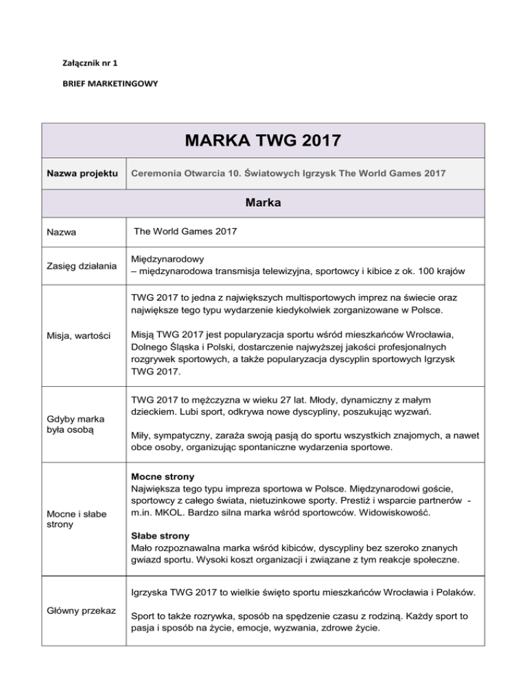 Załącznik nr 1 BRIEF MARKETINGOWY MARKA TWG 2017 Nazwa projektu Ceremonia Otwarcia 10. Światowych Igrzysk The World Games 2017 Marka Nazwa The World Games 2017 Zasięg działania Międzynarodowy – międzynarodowa transmisja telewizyjna, sportowcy i kibice z ok. 100 krajów TWG 2017 to jedna z największych multisportowych imprez na świecie oraz największe tego typu wydarzenie kiedykolwiek zorganizowane w Polsce. Misja, wartości Gdyby marka była osobą Mocne i słabe strony Misją TWG 2017 jest popularyzacja sportu wśród mieszkańców Wrocławia, Dolnego Śląska i Polski, dostarczenie najwyższej jakości profesjonalnych rozgrywek sportowych, a także popularyzacja dyscyplin sportowych Igrzysk TWG 2017. TWG 2017 to mężczyzna w wieku 27 lat. Młody, dynamiczny z małym dzieckiem. Lubi sport, odkrywa nowe dyscypliny, poszukując wyzwań. Miły, sympatyczny, zaraża swoją pasją do sportu wszystkich znajomych, a nawet obce osoby, organizując spontaniczne wydarzenia sportowe. Mocne strony Największa tego typu impreza sportowa w Polsce. Międzynarodowi goście, sportowcy z całego świata, nietuzinkowe sporty. Prestiż i wsparcie partnerów m.in. MKOL. Bardzo silna marka wśród sportowców. Widowiskowość. Słabe strony Mało rozpoznawalna marka wśród kibiców, dyscypliny bez szeroko znanych gwiazd sportu. Wysoki koszt organizacji i związane z tym reakcje społeczne. Igrzyska TWG 2017 to wielkie święto sportu mieszkańców Wrocławia i Polaków. Główny przekaz Sport to także rozrywka, sposób na spędzenie czasu z rodziną. Każdy sport to pasja i sposób na życie, emocje, wyzwania, zdrowe życie. RTB Międzynarodowy charakter imprezy, przekaz telewizyjny do ponad 100 krajów, transmisja live w Polsacie, 4 500 sportowców (więcej niż na zimowej Olimpiadzie), 300 tys. kibiców. Benefity racjonalne Remont istniejących obiektów, budowa nowych (np. tor wrotkarski), dostarczenie sprzętu do uprawnia sportu dla mieszkańców, promocja miasta, działania edukacyjne i społeczne m.in. flagowy projekt „Mali Wspaniali”. Key Benefit dla pojedynczego odbiorcy: Zobaczysz Ceremonię Otwarcia taką jak na Igrzyskach Olimpijskich – tylko, że w Polsce, realizowaną przez Polaków, na Polskim stadionie. Benefity emocjonalne Rodzinna rozrywka, rywalizacja, sportowe emocje, sukcesy i porażki reprezentacji kraju. Możliwość udziału w międzynarodowym święcie sportu. Grupa celu Ceremonia Otwarcia Rodziny z dziećmi, wiek: 25-37 lat, prowadzący aktywny tryb życia, uprawiający amatorsko sporty Mieszkańcy Wrocławia zainteresowani sportem Fani sportów Jak mają się poczuć odbiorcy To największe wydarzenie sportowe w Polsce – jestem dumny że odbywa się ono we Wrocławiu (wrocławianie). Warto tu przyjść i poczuć się jak na Olimpiadzie. Chciałbym, żeby odbywały się w moim mieście (mieszkańcy innych miast) Cele projektu Partycypacja mieszkańców Promocja sportu i zdrowego trybu życia Promocja Wrocławia Zwiększenie zainteresowania TWG 2017 (na poprzednich edycjach największy przyrost sprzedaży biletów odbywał się po Ceremonii Otwarcia) - Oczekiwana liczba sprzedanych biletów: _____ Sprzedaż biletów TWG w dwóch ostatnich edycjach: - Link do zdjęć (dyscypliny, sporty), które obok KV mogą być ewent. użyte w komunikacji tegorocznego TWG 2017. Dodatkowe informacje / materiały: Dodatkowa informacja: Jako dobry benchmark i pozytywną referencję uznajemy Ceremonię Otwarcia igrzysk Olimpijskich w Super Bowl. Nie chcemy natomiast nawiązywać do poprzednich TWG.