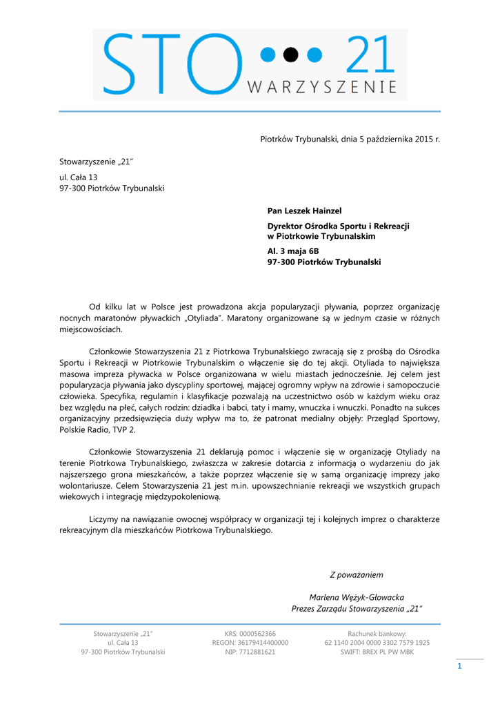 Piotrków Trybunalski, dnia 5 października 2015 r. Stowarzyszenie „21” ul. Cała 13 97-300 Piotrków Trybunalski Pan Leszek Hainzel Dyrektor Ośrodka Sportu i Rekreacji w Piotrkowie Trybunalskim Al. 3 maja 6B 97-300 Piotrków Trybunalski Od kilku lat w Polsce jest prowadzona akcja popularyzacji pływania, poprzez organizację nocnych maratonów pływackich „Otyliada”. Maratony organizowane są w jednym czasie w różnych miejscowościach. Członkowie Stowarzyszenia 21 z Piotrkowa Trybunalskiego zwracają się z prośbą do Ośrodka Sportu i Rekreacji w Piotrkowie Trybunalskim o włączenie się do tej akcji. Otyliada to największa masowa impreza pływacka w Polsce organizowana w wielu miastach jednocześnie. Jej celem jest popularyzacja pływania jako dyscypliny sportowej, mającej ogromny wpływ na zdrowie i samopoczucie człowieka. Specyfika, regulamin i klasyfikacje pozwalają na uczestnictwo osób w każdym wieku oraz bez względu na płeć, całych rodzin: dziadka i babci, taty i mamy, wnuczka i wnuczki. Ponadto na sukces organizacyjny przedsięwzięcia duży wpływ ma to, że patronat medialny objęły: Przegląd Sportowy, Polskie Radio, TVP 2. Członkowie Stowarzyszenia 21 deklarują pomoc i włączenie się w organizację Otyliady na terenie Piotrkowa Trybunalskiego, zwłaszcza w zakresie dotarcia z informacją o wydarzeniu do jak najszerszego grona mieszkańców, a także poprzez włączenie się w samą organizację imprezy jako wolontariusze. Celem Stowarzyszenia 21 jest m.in. upowszechnianie rekreacji we wszystkich grupach wiekowych i integrację międzypokoleniową. Liczymy na nawiązanie owocnej współpracy w organizacji tej i kolejnych imprez o charakterze rekreacyjnym dla mieszkańców Piotrkowa Trybunalskiego. Z poważaniem Marlena Wężyk-Głowacka Prezes Zarządu Stowarzyszenia „21” Stowarzyszenie „21” ul. Cała 13 97-300 Piotrków Trybunalski KRS: 0000562366 REGON: 36179414400000 NIP: 7712881621 Rachunek bankowy: 62 1140 2004 0000 3302 7579 1925 SWIFT: BREX PL PW MBK 1