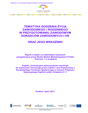 Załącznik nr 1 do „Strategii wdrażania projektu innowacyjnego testującego” TEMATYKA GODZENIA ŻYCIA ZAWODOWEGO I RODZINNEGO W PRZYGOTOWANIU ZAWODOWYM DORADCÓW ZAWODOWYCH I HR ORAZ JEGO WSKAŹNIKI Raport z badań na materiałach zastanych przygotowany przez Studio Badań Marketingowych Profile - Partnera 1 w projekcie Projekt „Innowacyjne wykorzystanie coachingu do wspierania równowagi praca-rodzina” jest finansowany z Europejskiego Funduszu Społecznego w ramach Programu Operacyjnego Kapitał Ludzki, Działanie 6.1.1 Kraków, lipiec 2011 strona 3 1. Opis badań 2. Wspomaganie idei GZŻR w edukacji specjalistów i na rynku pracy 4 3. Percepcja GŻZR wśród uczestników rynku pracy 14 4. Realizacja GŻZR w polskich warunkach 18 5. Wskaźniki GŻZR – elastyczna praca, elastyczny pracownik 25 6. Aneks 6.1. Przykładowe programy studiów doradców zawodowych i HR/ZZL 6.2. Literatura 32 32 55 Raport z badań Moduł I, Tematyka godzenia…, SBM Profile, VII 2011 2 1. OPIS BADAŃ Badanie przeprowadzono jako wstępny etap projektu „Innowacyjne wykorzystanie coachingu do wspierania równowagi praca-rodzina” Program Operacyjny Kapitał Ludzki, 6.4 (Zadanie 2.1 Badania Moduł I). Celem badania było odpowiedzieć na następujące pytania badawcze: Jak dalece tematyka godzenia życia zawodowego i rodzinnego (GŻZR) jest obecna w przygotowaniu zawodowym doradców zawodowych i HR? Jaki postrzegany jest problem godzenia życia zawodowego i rodzinnego wśród uczestników rynku pracy? Jakie wskaźniki określają problem godzenia życia zawodowego i rodzinnego w teorii i praktyce rynku pracy? W badaniach zgromadzono i poddano analizie opublikowane materiały związane z tematem. Są to raporty z badań, programy edukacyjne dla doradców (studia zawodowe), programy edukacyjne dla pracowników HR (studia zawodowe) oraz inne dokumenty edukacyjne i informacyjne na ten temat. Literaturę zamieszczono w aneksie niniejszego raportu.1 Przyjęto następujący plan analizy (będący równocześnie planem niniejszego raportu), by omówić następujące zagadnienia badawcze: 1. Analiza warunków rozwijania tematyki GŻZR na rynku pracy, a szczególnie w przygotowaniu zawodowym doradców zawodowych i pracowników HR – czyli jak jest wspomagane GŻZR przez specjalistów na rynku pracy? 2. Percepcja i rozumienie problemu godzenia życia zawodowego i rodzinnego 2 czyli jak jest spostrzegane GŻZR w społecznym odbiorze? 3. Uwzględnianie problematyki GŻZR w działaniach na rynku pracy – czyli jak jest realizowane GŻZR w praktyce? 1 W raporcie przy cytatach, w nawiasach podano źródła, umieszczone na liście zgromadzonych materiałów. Używa się skrótu EFP – elastyczne formy pracy. 2 W raporcie przyjęto skrót: GŻZR Raport z badań Moduł I, Tematyka godzenia…, SBM Profile, VII 2011 3 4. Jakie są wskaźniki GŻZR po stronie pracownika i po stronie jego miejsca pracy – czyli jak jest wykrywane GŻZR? Ostatecznym celem badania jest dotarcie do listy wskaźników GŻZR, która umożliwi operacjonalizację problemu w dalszych etapach badań. 2. WSPOMAGANIE GŻZR W EDUKACJI SPECJALISTÓW I NA RYNKU PRACY Rozwiązania stosowane w społecznej praktyce, mające na celu wspomaganie procesu GŻZR, dotyczą zarówno samych rodziców-pracowników, jak i instytucji czy ciał wspierających tychże. Oprócz istniejących już i prawnie określonych elastycznych form zatrudnienia, kluczową kwestią dla wspomagania idei GŻZR na rynku pracy jest edukacja specjalistów, którzy najbliżej i najczęściej stykają się z tym problemem. Są to doradcy zawodowi oraz pracownicy działów kadr, human resources, zarządzania zasobami ludzkimi. Od tego, jak dalece idea GŻZR jest obecna w przygotowaniu zawodowym specjalistów, zależy powodzenie tej idei na rynku, a więc rzeczywiste wspomaganie pracowników w GŻZR oraz pracodawców w umożliwianiu tegoż swoim pracownikom-rodzicom. Podstawowa grupa rozwiązań w GŻZR - elastyczne formy zatrudnienia - jest dosyć liczna na polskim rynku pracy. Ich stosowanie traktowane jest jako nowoczesne rozwiązanie w miejscu pracy. Jednak nowość ta jest stosowana – jak się wydaje - w starych warunkach. Elastyczność sama w sobie nie jest bowiem wartością dla pracodawcy i pracownika – jest koniecznością: jeśli nie uda się pokonać zasadniczych barier w GŻZR, wtedy obie strony próbują się uelastycznić. Pożądanym celem zachowań organizacyjnych wobec konfliktu ról jest dostosowanie się, zachowanie status quo, a nie zmiana, przeorganizowanie pola pracy i przyjęcie tej zmiany jako kolejnego etapu wzajemnych relacji. O dominacji „starego” mówi następujący cytat: Ogólne nastawienie pracodawców do alternatywnych form zatrudnienia pokazuje wciąż jeszcze silne potrzeby panowania nad czasem i pracą pracownika i skrywaną niechęcią wobec zadaniowej formy pracy. Forma ta, z jednej strony umożliwia pracownikom mało dyspozycyjnym kontynuację pracy, z drugiej strony jednak, wymaga od pracodawcy czy menedżera precyzyjnej oceny czasu potrzebnego do zrealizowania danego zadania, co stwarza pole albo do pomyłek na niekorzyść pracodawcy (niedostateczne obłożenie pracownika zadaniami), albo też do nadużycia pracownika (przydzielenie zbyt krótkiego czasu na rozbudowane zadanie). Można stwierdzić wręcz, że ta druga konsekwencja zadaniowej formy pracy jest dla wielu pracodawców Raport z badań Moduł I, Tematyka godzenia…, SBM Profile, VII 2011 4 przykrywką rzeczywistych manipulacji i wyzysku pracowników, co nie przysparza tej formie pracy przychylności społecznej ze strony szerokiej rzeszy ludzi pracy. (26) Niewiele firm w Polsce stosuje rozwiązania umożliwiające GŻZR o charakterze systemowym (na poziomie całej firmy). Powszechną praktyką jest doraźne rozwiązywanie problemów pojedynczych pracowników, którzy przeżywają aktualne zaostrzenie konfliktu ról. Czy to jednak doraźnie, czy też systemowo, sformułowano p