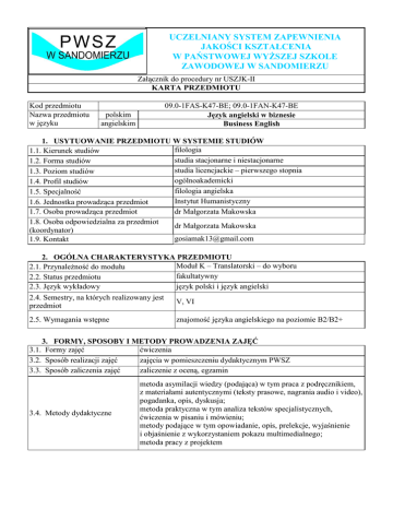 UCZELNIANY SYSTEM ZAPEWNIENIA JAKOŚCI KSZTAŁCENIA W PAŃSTWOWEJ WYŻSZEJ SZKOLE ZAWODOWEJ W SANDOMIERZU Załącznik do procedury nr USZJK-II KARTA PRZEDMIOTU Kod przedmiotu Nazwa przedmiotu w języku 09.0-1FAS-K47-BE; 09.0-1FAN-K47-BE Język angielski w biznesie Business English polskim angielskim 1. USYTUOWANIE PRZEDMIOTU W SYSTEMIE STUDIÓW filologia 1.1. Kierunek studiów studia stacjonarne i niestacjonarne 1.2. Forma studiów studia licencjackie – pierwszego stopnia 1.3. Poziom studiów ogólnoakademicki 1.4. Profil studiów filologia angielska 1.5. Specjalność Instytut Humanistyczny 1.6. Jednostka prowadząca przedmiot 1.7. Osoba prowadząca przedmiot dr Małgorzata Makowska 1.8. Osoba odpowiedzialna za przedmiot dr Małgorzata Makowska (koordynator) [email protected] 1.9. Kontakt 2. OGÓLNA CHARAKTERYSTYKA PRZEDMIOTU Moduł K – Translatorski – do wyboru 2.1. Przynależność do modułu fakultatywny 2.2. Status przedmiotu 2.3. Język wykładowy język polski i język angielski 2.4. Semestry, na których realizowany jest przedmiot V, VI 2.5. Wymagania wstępne znajomość języka angielskiego na poziomie B2/B2+ 3. FORMY, SPOSOBY I METODY PROWADZENIA ZAJĘĆ 3.1. Formy zajęć ćwiczenia 3.2. Sposób realizacji zajęć zajęcia w pomieszczeniu dydaktycznym PWSZ 3.3. Sposób zaliczenia zajęć zaliczenie z oceną, egzamin 3.4. Metody dydaktyczne metoda asymilacji wiedzy (podająca) w tym praca z podręcznikiem, z materiałami autentycznymi (teksty prasowe, nagrania audio i video), pogadanka, opis, dyskusja; metoda praktyczna w tym analiza tekstów specjalistycznych, ćwiczenia w pisaniu i mówieniu; metody podające w tym opowiadanie, opis, prelekcje, wyjaśnienie i objaśnienie z wykorzystaniem pokazu multimedialnego; metoda pracy z projektem podstawowa Brook-Hart , G. 2006. Business Benchmark Upper intermediate, Cambridge: Cambridge University Press. Duckworth M., Turner R. 2008. Business Result Upper intermediate. Oxford: Oxford University Press. uzupełniająca Cotton, D., Falvey, D., Kent S. 2008. Market Leader Upper Intermediate. Harlow: Pearson Education Ltd. Brook-Hart , G. 2006. Business Benchmark Advanced, Cambridge: Cambridge University Press. Wykaz literatury 3.5. 4. CELE, TREŚCI I EFEKTY KSZTAŁCENIA 4.1. Cele przedmiotu Cl – Wyposażenie studenta w rozszerzoną wiedzę z zakresu funkcjonowania środowiska biznesu i turystyki. C2 – Poznanie specjalistycznych pojęć związanych ze środowiskiem biznesowym. C3 – Szczegółowe poznanie wybranych procesów makroekonomicznych. C4 – Zapoznanie studenta z podstawami marketingu i podatkowości. C5 – Kształtowanie postawy otwartości dla innych kultur w obszarze negocjacji. 4.2. Treści programowe 1. Komunikacja w przedsiębiorstwie i logistyka. 2. Słownictwo specjalistyczne języka biznesu i turystyki. 3. Podstawy języka prawa i podatkowości w biznesie i turystyce. 4. Budowanie relacji w obsłudze klienta. 5. Porozumienie międzykulturowe w biznesie. 6. Podstawy języka finansowości firmy. 7. Prowadzenie korespondencji biznesowej. 8. Odpowiedzialność i ryzyko w językowej obsłudze firmy. 9. Etyka zawodowa i etykieta języka biznesu. 10. Język biznesu w mediach. 11. Marketing i działalność promocyjna. 12. Spotkania biznesowe i telekonferencje. 4.3. Efekty kształcenia kod Student, który zaliczył przedmiot w zakresie WIEDZY: W01 W02 U01 U02 ma podstawową wiedzę o miejscu i znaczeniu filologii w relacji do specjalistycznego języka biznesu i turystyki. zna podstawowe tematy, pojęcia i zagadnienia dotyczące języka biznesu i turystyki. w zakresie UMIEJĘTNOŚCI: ma umiejętności językowe właściwe dla prowadzenia dokumentacji, negocjacji, tłumaczeń i obsługi klienta w obrębie biznesu i turystyki w języku angielskim. potrafi rozpoznać, ocenić i wykorzystać zjawiska językowe w obrębie języka biznesu i turystyki na podstawie uzyskanej wiedzy i z wykorzystaniem standardowych metod i narzędzi. Odniesienie do efektów kształcenia dla kierunku dla obszaru FIL1A_W01 H1A_W01 FIL1A_W02 H1A_W02 FIL1A_U01 H1A_U10 FIL1A_U04 H1A_U02 U03 K01 4.4. potrafi samodzielnie, analitycznie i krytycznie intepretować teksty biznesowe, finansowe i podatkowe w powiązaniu FIL1A_U08 ze zjawiskami społecznymi i kulturowymi. w zakresie KOMPETENCJI SPOŁECZNYCH: jest świadomy posiadanej wiedzy i umiejętności oraz konieczności ich stałej aktualizacji w kontekście wykonywanego FIL1A_K01 zawodu. H1A_U05 H1A_K01 H1A_K04 Metody weryfikacji efektów kształcenia Forma oceny Efekt Egzamin Egzamin Kolok Zadania do Referat Projekt Dyskusje Inne kształcenia ustny pisemny wium wykonania Sprawozdanie W01 W02 U01 U02 U03 K01 +++ +++ +++ +++ ++ ++ ++ v++ ++ ++ ++ ++ ++ v 4.5.Kryteria jakościowe uzyskania oceny w danym zakresie efektów kształcenia ocena Efekt dostateczny/dostateczny dobry/dobry plus bardzo dobry kształcenia plus (3/3,5) (4/4,5) (5) Zna wybrane tematy, Zna większość Zna wszystkie wymagane pojęcia i zagadnienia tematów, pojęć tematy, pojęcia i zagadnienia W01-W02 dotyczące i zagadnień dotyczących dotyczące języka biznesu języka biznesu i turystyki języka biznesu i turystyki i turystyki. Opanował w stopniu Opanował w stopniu Opanował w stopniu bardzo elementarnym dobrym umiejętności dobrym umiejętności umiejętności językowe językowe niezbędne językowe niezbędne niezbędne do komunikacji do komunikacji w biznesie. do komunikacji w w biznesie. Bez większych Bezbłędnie stosuje omawiane biznesie. Opanował trudności stosuje na zajęciach słownictwo. U01-U03 w stopniu podstawowym większość omawianego Trafnie interpretuje umiejętność interpretacji na zajęciach słownictwa. dokumenty biznesowe o różnej prostych dokumentów Wykazuje dobrą tematyce i stopniu trudności, biznesowych, nie umiejętność interpretacji wykazując przy tym wykazuje jednak dokumentów biznesowych samodzielność krytyczną samodzielności o różnej tematyce. i analityczną. analitycznej