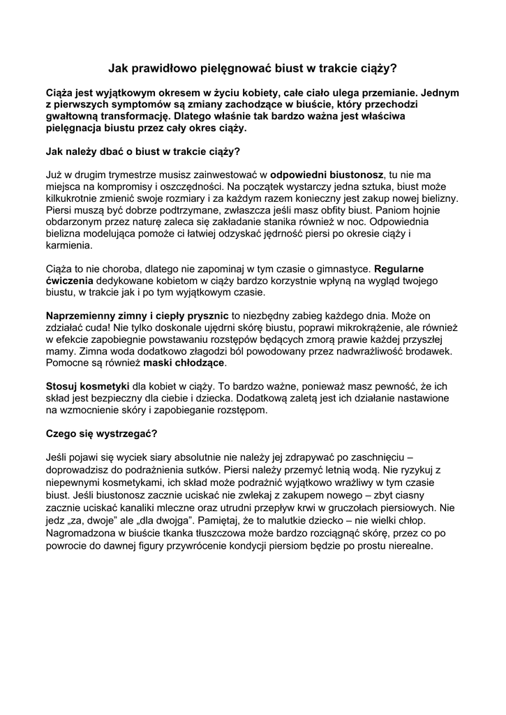 Jak prawidłowo pielęgnować biust w trakcie ciąży? Ciąża jest wyjątkowym okresem w życiu kobiety, całe ciało ulega przemianie. Jednym z pierwszych symptomów są zmiany zachodzące w biuście, który przechodzi gwałtowną transformację. Dlatego właśnie tak bardzo ważna jest właściwa pielęgnacja biustu przez cały okres ciąży. Jak należy dbać o biust w trakcie ciąży? Już w drugim trymestrze musisz zainwestować w odpowiedni biustonosz, tu nie ma miejsca na kompromisy i oszczędności. Na początek wystarczy jedna sztuka, biust może kilkukrotnie zmienić swoje rozmiary i za każdym razem konieczny jest zakup nowej bielizny. Piersi muszą być dobrze podtrzymane, zwłaszcza jeśli masz obfity biust. Paniom hojnie obdarzonym przez naturę zaleca się zakładanie stanika również w noc. Odpowiednia bielizna modelująca pomoże ci łatwiej odzyskać jędrność piersi po okresie ciąży i karmienia. Ciąża to nie choroba, dlatego nie zapominaj w tym czasie o gimnastyce. Regularne ćwiczenia dedykowane kobietom w ciąży bardzo korzystnie wpłyną na wygląd twojego biustu, w trakcie jak i po tym wyjątkowym czasie. Naprzemienny zimny i ciepły prysznic to niezbędny zabieg każdego dnia. Może on zdziałać cuda! Nie tylko doskonale ujędrni skórę biustu, poprawi mikrokrążenie, ale również w efekcie zapobiegnie powstawaniu rozstępów będących zmorą prawie każdej przyszłej mamy. Zimna woda dodatkowo złagodzi ból powodowany przez nadwrażliwość brodawek. Pomocne są również maski chłodzące. Stosuj kosmetyki dla kobiet w ciąży. To bardzo ważne, ponieważ masz pewność, że ich skład jest bezpieczny dla ciebie i dziecka. Dodatkową zaletą jest ich działanie nastawione na wzmocnienie skóry i zapobieganie rozstępom. Czego się wystrzegać? Jeśli pojawi się wyciek siary absolutnie nie należy jej zdrapywać po zaschnięciu – doprowadzisz do podrażnienia sutków. Piersi należy przemyć letnią wodą. Nie ryzykuj z niepewnymi kosmetykami, ich skład może podrażnić wyjątkowo wrażliwy w tym czasie biust. Jeśli biustonosz zacznie uciskać nie zwlekaj z zakupem nowego – zbyt ciasny zacznie uciskać kanaliki mleczne oraz utrudni przepływ krwi w gruczołach piersiowych. Nie jedz „za, dwoje” ale „dla dwojga”. Pamiętaj, że to malutkie dziecko – nie wielki chłop. Nagromadzona w biuście tkanka tłuszczowa może bardzo rozciągnąć skórę, przez co po powrocie do dawnej figury przywrócenie kondycji piersiom będzie po prostu nierealne.
