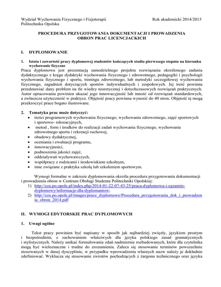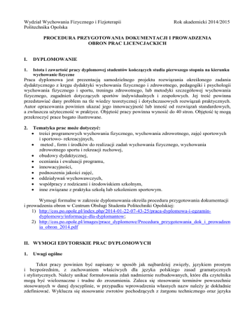 Wydział Wychowania Fizycznego i Fizjoterapii Politechnika Opolska Rok akademicki 2014/2015 PROCEDURA PRZYGOTOWANIA DOKUMENTACJI I PROWADZENIA OBRON PRAC LICENCJACKICH I. DYPLOMOWANIE 1. Istota i zawartość pracy dyplomowej studentów kończących studia pierwszego stopnia na kierunku wychowanie fizyczne Praca dyplomowa jest prezentacją samodzielnego projektu rozwiązania określonego zadania dydaktycznego z kręgu dydaktyki wychowania fizycznego i zdrowotnego, pedagogiki i psychologii wychowania fizycznego i sportu, treningu zdrowotnego, lub metodyki szczegółowej wychowania fizycznego, zagadnień dotyczących sportów indywidualnych i zespołowych. Jej treść powinna przedstawiać dany problem na tle wiedzy teoretycznej i dotychczasowych rozwiązań praktycznych. Autor opracowania powinien ukazać jego innowacyjność lub inność od rozwiązań standardowych, a zwłaszcza użyteczność w praktyce. Objętość pracy powinna wynosić do 40 stron. Objętość tę mogą przekroczyć prace bogato ilustrowane. 2. Tematyka prac może dotyczyć: treści programowych wychowania fizycznego, wychowania zdrowotnego, zajęć sportowych i sportowo- rekreacyjnych, metod , form i środków do realizacji zadań wychowania fizycznego, wychowania zdrowotnego sportu i rekreacji ruchowej, obudowy dydaktycznej, oceniania i ewaluacji programu, innowacyjności, podnoszenia jakości zajęć, oddziaływań wychowawczych, współpracy z rodzicami i środowiskiem szkolnym, inne związane z praktyka szkolą lub szkoleniem sportowym. Wymogi formalne w zakresie dyplomowania określa procedura przygotowania dokumentacji i prowadzenia obron w Centrum Obsługi Studenta Politechniki Opolskiej: 1) http://cos.po.opole.pl/index.php/2014-01-22-07-43-25/praca-dyplomowa-i-egzamindyplomowy/informacje-dla-dyplomantow; 2) http://cos.po.opole.pl/images/prace_dyplomowe/Procedura_przygotowania_dok_i_prowadzen ia_obron_2014.pdf II. WYMOGI EDYTORSKIE PRAC DYPLOMOWYCH 1. Uwagi ogólne Tekst pracy powinien być napisany w sposób jak najbardziej zwięzły, językiem prostym i bezpośrednim, z zachowaniem właściwych dla języka polskiego zasad gramatycznych i stylistycznych. Należy unikać formułowania zdań nadmiernie rozbudowanych, które dla czytelnika mogą być wieloznaczne i trudne do zrozumienia. Zaleca się stosowanie terminów powszechnie stosowanych w danej dyscyplinie, w przypadku wprowadzenia własnych nazw należy je dokładnie zdefiniować. Wyklucza się stosowanie zwrotów pochodzących z żargonu technicznego oraz języka potocznego. Autor powinien dokładnie określić, co w jego pracy stanowi własny wkład, a co jest dorobkiem innych. W razie wątpliwości, co do możliwości zamieszczania we własnej pracy elementów innych prac (np. cytaty, tabele, rysunki itp.) należy zapoznać się z przepisami wynikającymi z „Ustawy o prawie autorskim i prawach pokrewnych” (Dz. U. 1994 nr 24, poz. 83 z dnia 23.02.1994 r., z późniejszymi zmianami). Autor zobowiązany jest do starannego zredagowania pracy, z zachowaniem zamieszczonych w niniejszym opracowaniu wskazówek edycyjnych. 2. Struktura pracy Na całość pracy powinny składać się jednoznacznie wyodrębnione części, co ułatwia jej redagowanie oraz późniejsze przeglądanie. Zasadniczy tekst pracy powinien być podzielony na rozdziały i podrozdziały. Poniżej wyszczególniono niezbędne elementy maszynopisu zgodnie z kolejnością ich występowania w pracy. Praca ma charakter opisowy więc powinna zawierać takie informacje jak: 1) Strona tytułowa (wg załącznika nr1) 2) Spis treści 3) Wstęp 4) Teoretyczne wprowadzenie do tematu pracy 5) Cel i opis zadania, które zostało podjęte do opracowania 6) Sposób prezentacji zadania 7) Uzasadnienie przydatności tego opracowania w praktyce 8) Podsumowanie 9) Wnioski końcowe 10) Literatura 11) Załączniki Ad. 1) Strona tytułowa powinna zawierać: imię i nazwisko autora pracy, kierunek studiów, specjalność (dot. II stopnia), stopień (tytuł) imię i nazwisko promotora, rodzaj pracy (licencjacka), temat pracy w języku polskim. Ad. 2) Spis treści powinien zawierać wszystkie wyodrębnione części pracy, przy czym rozdziały stanowiące tekst zasadniczy powinny być ponumerowane zgodnie z zasadami podanymi w dalszej części wskazówek. Ad. 3) We wstępie autor powinien w skrócie przybliżyć tematykę pracy, ze szczególnym uwzględnieniem istoty poruszanych problemów. Objętość tego rozdziału nie powinna przekraczać kilku stron. W części nazwanej umownie studiami literaturowymi, powinien zostać przedstawiony stan wiedzy dotyczącej problemów sygnalizowanych we wstępie. Wskazane jest aby autor starał się dotrzeć do możliwie najnowszych publikacji związanych z tematyką pracy. Ad 4). Tekst zasadniczy pracy może składać się z dowolnej liczby opatrzonych numerami rozdziałów i podrozdziałów, jednak należy unikać nadmiernego rozbudowywania struktury pracy. Podrozdziały nie powinny być dzielone na mniejsze, chyba że zabieg taki jest konieczny dla zachowania czytelności pracy. Zaleca się zachowanie opisanego poniżej układu pracy. Ad 5). Wnioski z przeprowadzonego przeglądu literatury powinny pozwolić na sformułowanie celu i zakresu pracy. W zależności od charakteru pracy ( projektowa, analityczna itp.), początkowy układ pracy może odbiegać od powyższego schematu, lecz zawsze w sposób jednoznaczny i w odrębnym rozdziale należy wskazać na cel i zakres pracy. W kolejnych rozdziałach pracy powinien zostać opisany sposób realizacji celu pracy. Jeżeli praca ma charakter teoretyczny należy wskazać źródła wykorzystywanych informacji zwłaszcza, jeśli są to wyniki innych autorów. Ad. 6) Opis, analiza porównawcza, opis ilustrowany, film, inne. Ad. 7) Krótki opis uzasadnienia przydatności tego opracowania w praktyce. Ad. 8) Do pracy dołączyć należy streszczenie. W treści streszczenia (jedna/dwie strony) w sposób komunikatywny opisać należy na