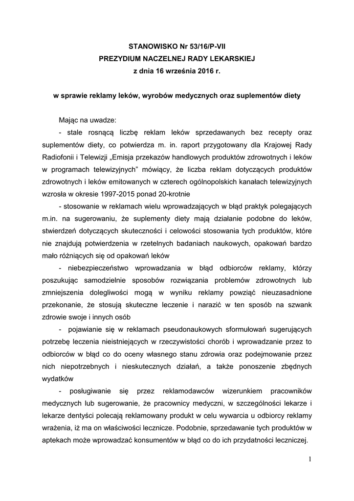 STANOWISKO Nr 53/16/P-VII PREZYDIUM NACZELNEJ RADY LEKARSKIEJ z dnia 16 września 2016 r. w sprawie reklamy leków, wyrobów medycznych oraz suplementów diety Mając na uwadze: - stale rosnącą liczbę reklam leków sprzedawanych bez recepty oraz suplementów diety, co potwierdza m. in. raport przygotowany dla Krajowej Rady Radiofonii i Telewizji „Emisja przekazów handlowych produktów zdrowotnych i leków w programach telewizyjnych” mówiący, że liczba reklam dotyczących produktów zdrowotnych i leków emitowanych w czterech ogólnopolskich kanałach telewizyjnych wzrosła w okresie 1997-2015 ponad 20-krotnie - stosowanie w reklamach wielu wprowadzających w błąd praktyk polegających m.in. na sugerowaniu, że suplementy diety mają działanie podobne do leków, stwierdzeń dotyczących skuteczności i celowości stosowania tych produktów, które nie znajdują potwierdzenia w rzetelnych badaniach naukowych, opakowań bardzo mało różniących się od opakowań leków - niebezpieczeństwo wprowadzania w błąd odbiorców reklamy, którzy poszukując samodzielnie sposobów rozwiązania problemów zdrowotnych lub zmniejszenia dolegliwości mogą w wyniku reklamy powziąć nieuzasadnione przekonanie, że stosują skuteczne leczenie i narazić w ten sposób na szwank zdrowie swoje i innych osób - pojawianie się w reklamach pseudonaukowych sformułowań sugerujących potrzebę leczenia nieistniejących w rzeczywistości chorób i wprowadzanie przez to odbiorców w błąd co do oceny własnego stanu zdrowia oraz podejmowanie przez nich niepotrzebnych i nieskutecznych działań, a także ponoszenie zbędnych wydatków - posługiwanie się przez reklamodawców wizerunkiem pracowników medycznych lub sugerowanie, że pracownicy medyczni, w szczególności lekarze i lekarze dentyści polecają reklamowany produkt w celu wywarcia u odbiorcy reklamy wrażenia, iż ma on właściwości lecznicze. Podobnie, sprzedawanie tych produktów w aptekach może wprowadzać konsumentów w błąd co do ich przydatności leczniczej. 1 oraz przypominając, że: 1. Wprowadzanie w błąd chorych poprzez sugerowanie im, że mogą rozwiązać swoje problemy zdrowotne przy pomocy produktów, które nie mają udowodnionej skuteczności łatwo prowadzi do pogorszenia stanu zdrowia, między innymi poprzez opóźnienie kontaktu z lekarzem. 2. Nieodpowiedzialna reklama leków nabywanych bez recepty prowadzi do ich nadużywania i zwiększenia częstości związanych z tym powikłań. 3. Parlament Europejski i Rada w Dyrektywie 2001/83/WE z dnia 6 listopada 2001 r. w sprawie wspólnotowego kodeksu odnoszącego się do produktów leczniczych stosowanych u ludzi wskazały, że reklama adresowana do ogółu społeczeństwa, nawet dotycząca jedynie produktów leczniczych nabywanych bez recepty, może mieć niekorzystny wpływ na zdrowie publiczne, o ile jest nadużywana lub niewłaściwie przygotowana. 4. Naczelna Rada Lekarska, dostrzegając liczne problemy związane z reklamowaniem suplementów diety, w apelu do Ministra Zdrowia Nr 2/16/VII z dnia 4 marca 2016 r. zwróciła się o podjęcie działań w zakresie ograniczenia reklamy tych produktów. Prezydium Naczelnej rady Lekarskiej przyjmuje następujące stanowisko: 1. Należy rozważyć wprowadzenie w Polsce zakazu reklamy leków dostępnych bez recepty, wyrobów medycznych oraz suplementów diety. Jeżeli wprowadzenie takich zmian musiałoby wymagać zmian przepisów prawa Unii Europejskiej, to z uwagi na wagę problemu należy niezwłocznie podjąć działania zmierzające do zmiany tych przepisów, aby dawały one państwom członkowskim prawo do wprowadzenia ograniczeń reklamy takich produktów, w tym również całkowitego zakazu reklamy kierowanej do społeczeństwa. 2. Jeżeli reklama leków, wyrobów medycznych oraz suplementów diety kierowana do społeczeństwa jest dopuszczona, musi ona podlegać ścisłej kontroli pod kątem rzetelności przekazu i prawdziwości zawartych w niej informacji. Konieczne byłoby więc stworzenie jednolitych zapisów prawnych dotyczących sposobu reklamy produktów leczniczych, wyrobów medycznych i suplementów diety dopuszczających możliwość reklamy po dokonaniu rejestracji danego produktu a nie 2 przedstawienia tylko jego zgłoszenia do obrotu. Należy dopuszczać do obrotu te produkty tylko po zatwierdzeniu oświadczeń zdrowotnych spełniających wymagania określone w rozporządzeniu nr 1924/2006 Parlamentu Europejskiego i Rady z dnia 20 grudnia 2006 r. w sprawie oświadczeń żywieniowych i zdrowotnych dotyczących żywności. Postuluje się także, aby reklama wyrobów medycznych i suplementów diety była poddana takim samym ograniczeniom jak reklama leków, w szczególności w kwestii braku możliwości udziału w tych reklamach lekarzy i lekarzy dentystów. 3. Należy rozważyć, czy suplementy diety, jako produkty niezwiązane z procesem leczenia powinny być sprzedawane w aptekach. Wydaje się bowiem racjonalne, aby w aptece można było nabywać produkty i wyroby służące leczeniu lub wspomagające ten proces. 3