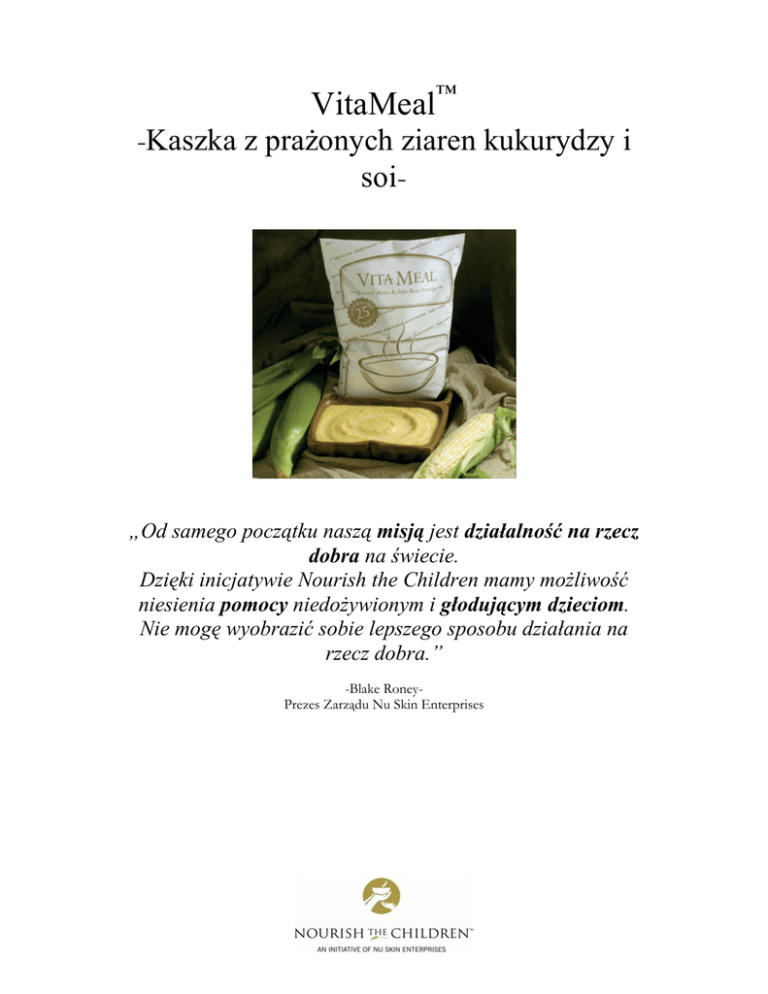 VitaMeal™ -Kaszka z prażonych ziaren kukurydzy i soi- „Od samego początku naszą misją jest działalność na rzecz dobra na świecie. Dzięki inicjatywie Nourish the Children mamy możliwość niesienia pomocy niedożywionym i głodującym dzieciom. Nie mogę wyobrazić sobie lepszego sposobu działania na rzecz dobra.” -Blake RoneyPrezes Zarządu Nu Skin Enterprises Co roku z powodu niedożywienia umiera ponad pięć milionów dzieci. Miliony innych dzieci jest opóźnionych w rozwoju fizycznym i umysłowym wskutek niedoboru niezbędnych składników odżywczych. Te dane statystyczne skłoniły Nu Skin Enterprises do podjęcia inicjatywy Nourish the Children oraz wprowadzenia VitaMeal™. Inicjatywa Nourish the Children jednoczy Nu Skin Enterprises (NSE) z międzynarodową rzeszą dystrybutorów firmy w dziele dożywiania głodnych dzieci na całym świecie. Naszą misję na rzecz ratowania życia dzieci realizować będziemy zarówno poprzez przekazywanie w darze produktów przez firmę, jak i dobrowolne przekazywanie produktów przez naszych dystrybutorów oraz ich klientów z całego świata. Każda darowizna będzie trafiać do potrzebujących dzieci za pośrednictwem renomowanych agencji pomocowych, które regularnie przekazują sprawozdania na temat rozwoju i zdrowia dzieci dożywianych w ramach inicjatywy. Pożywna kaszka VitaMeal dostarcza odpowiednią ilość kalorii, białka, tłuszczów, węglowodanów, witamin i minerałów, które są niezbędne dla niedożywionych dzieci, aby mogły rosnąć i jak najlepiej wykorzystywać swój potencjał. VitaMeal pomaga zapobiegać między innymi niedoborom witaminy A (główna przyczyna ślepoty) oraz niedoborom cynku (bardzo częsty problem w krajach rozwijających się, powoduje opóźnienie w rozwoju i zwiększa podatność dzieci na infekcje oraz biegunkę). VitaMeal Kaszka z prażonych ziaren kukurydzy i soi Od grudnia 2004 roku wszystkie dary przekazywane z Europy w ramach Nourish the Children składają się z VitaMeal, a konkretnie VitaMeal Kaszki z prażonych ziaren kukurydzy i soi, która jest produkowana i dystrybuowana na terenie Malawi w Afryce. Danie z ryżu i soczewicy, które przekazywano do grudnia 2004 roku, zostało bardzo dobrze przyjęte przez dzieci z Malawi, niemniej jednak ryż i soczewica nie stanowią typowej żywności, do jakiej dzieci te są przyzwyczajone. Dlatego przedstawiciele Nu Skin Enterprises (NSE) udali się do Malawi, aby lepiej zrozumieć i poznać miejscowe zwyczaje żywieniowe. Okazało się, że mieszkańcy Malawi najczęściej spożywają kaszkę przyrządzaną tradycyjnie z prażonych ziaren kukurydzy i soi, więc spółka NSE opracowała recepturę, która zawiera te składniki, a jednocześnie ma taki sam profil odżywczy, jak danie VitaMeal z ryżu i soczewicy. VitaMeal Kaszka z prażonych ziaren kukurydzy i soi zawiera 25 niezbędnych witamin i minerałów, tak samo jak VitaMeal Danie z ryżu i soczewicy, i stanowi zrównoważoną kompozycję białka, węglowodanów, kalorii i elektrolitów. Zawiera również cynk, który zwalcza biegunkę, oraz witaminę A zapobiegającą ślepocie, która tak często dotyka mieszkańców Afryki. VitaMeal Kaszka z prażonych ziaren kukurydzy i soi została opracowana pod kątem przyzwyczajeń smakowych dzieci z Malawi, a jednocześnie zawiera optymalny zestaw składników niezbędnych dla niedożywionych dzieci. Główne zalety • VitaMeal to bardzo pożywny posiłek, opracowany specjalnie pod kątem potrzeb niedożywionych dzieci. • Recepturę VitaMeal opracowano we współpracy z dr. n. med. Kenem Brownem (twórcą dania VitaMeal z ryżu i soczewicy) z University of California w Davis. Dr Brown to światowej sławy ekspert w dziedzinie żywienia dzieci z krajów Trzeciego Świata. • Zdrowe składniki VitaMeal dostarczają odpowiednią ilość kalorii, białka, tłuszczów oraz węglowodanów, które są niezbędne dla niedożywionych dzieci, aby mogły rosnąć i jak najlepiej wykorzystywać swój potencjał. • Kaszka VitaMeal jest wzbogacona o 25 niezbędnych witamin i minerałów w odpowiednio wysokich dawkach, które przyczyniają się do uzupełniania wszelkich niedoborów żywieniowych oraz wspomagają zdrowy wzrost i rozwój. • VitaMeal zawiera dużą ilość witaminy A. Niedobór witaminy A jest główną przyczyną ślepoty u dzieci na świecie (suchość spojówek), to kluczowy czynnik śmiertelności dzieci i dotyka 125-250 milionów dzieci w 90 krajach Trzeciego Świata (Furr HC: Retinol; w: Encyclopaedia of Human Nutrition; Sadler MJ et al., eds., Academic Press 1999). Witamina A jest niezbędna również do prawidłowego funkcjonowania układu odpornościowego i umożliwia zwalczanie infekcji, które powszechnie występują w krajach rozwijających się. • VitaMeal zawiera dużą ilość cynku. Niedobór cynku jest bardzo częstym problemem w krajach rozwijających się, powoduje zahamowanie wzrostu i zwiększa podatność dzieci na infekcje oraz biegunkę. Szacuje się, że na całym świecie z powodu biegunki umierają rocznie ponad 3 miliony dzieci, natomiast suplementacja cynku skraca czas trwania i łagodzi przebieg biegunki dziecięcej. • Kaszka VitaMeal jest wyjątkowa, ponieważ pomaga przerwać błędne koło niedożywienia. • Posiłki przekazywane w ramach zwykłych programów pomocowych mogą dostarczać wystarczające ilości kalorii i białka, lecz najczęściej nie zawierają witamin i minerałów, które są niezbędne do przywrócenia prawidłowego funkcjonowania układu odpornościowego. • VitaMeal zawiera duże ilości składników odżywczych niezbędnych do prawidłowego wzrostu i rozwoju układu kostnego (Ca, Mg, P, witaminy D i K). • VitaMeal zawiera duże ilości niezbędnych kwasów tłuszczowych, które są konieczne do prawidłowego rozwoju mózgu, zdrowia skóry oraz obrony odpornościowej. • VitaMeal zawiera elektrolity, m.in. potas, które są potrzebne do zachowania właściwego 