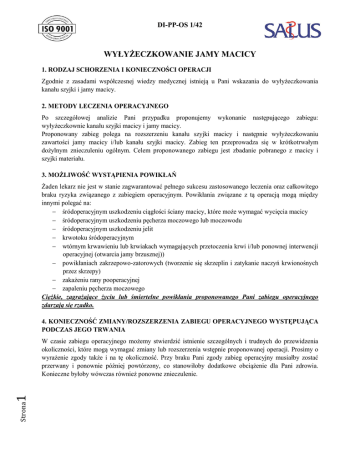 DI-PP-OS 1/42 WYŁYŻECZKOWANIE JAMY MACICY 1. RODZAJ SCHORZENIA I KONIECZNOŚCI OPERACJI Zgodnie z zasadami współczesnej wiedzy medycznej istnieją u Pani wskazania do wyłyżeczkowania kanału szyjki i jamy macicy. 2. METODY LECZENIA OPERACYJNEGO Po szczegółowej analizie Pani przypadku proponujemy wykonanie następującego zabiegu: wyłyżeczkownie kanału szyjki macicy i jamy macicy. Proponowany zabieg polega na rozszerzeniu kanału szyjki macicy i następnie wyłyżeczkowaniu zawartości jamy macicy i/lub kanału szyjki macicy. Zabieg ten przeprowadza się w krótkotrwałym dożylnym znieczuleniu ogólnym. Celem proponowanego zabiegu jest zbadanie pobranego z macicy i szyjki materiału. 3. MOŻLIWOŚĆ WYSTĄPIENIA POWIKŁAŃ Żaden lekarz nie jest w stanie zagwarantować pełnego sukcesu zastosowanego leczenia oraz całkowitego braku ryzyka związanego z zabiegiem operacyjnym. Powikłania związane z tą operacją mogą między innymi polegać na: śródoperacyjnym uszkodzeniu ciągłości ściany macicy, które może wymagać wycięcia macicy śródoperacyjnym uszkodzeniu pęcherza moczowego lub moczowodu śródoperacyjnym uszkodzeniu jelit krwotoku śródoperacyjnym wtórnym krwawieniu lub krwiakach wymagających przetoczenia krwi i/lub ponownej interwencji operacyjnej (otwarcia jamy brzusznej)) powikłaniach zakrzepowo-zatorowych (tworzenie się skrzeplin i zatykanie naczyń krwionośnych przez skrzepy) zakażeniu rany pooperacyjnej zapaleniu pęcherza moczowego Ciężkie, zagrażające życiu lub śmiertelne powikłania proponowanego Pani zabiegu operacyjnego zdarzają się rzadko. 4. KONIECZNOŚĆ ZMIANY/ROZSZERZENIA ZABIEGU OPERACYJNEGO WYSTĘPUJĄCA PODCZAS JEGO TRWANIA Strona 1 W czasie zabiegu operacyjnego możemy stwierdzić istnienie szczególnych i trudnych do przewidzenia okoliczności, które mogą wymagać zmiany lub rozszerzenia wstępnie proponowanej operacji. Prosimy o wyrażenie zgody także i na tę okoliczność. Przy braku Pani zgody zabieg operacyjny musiałby zostać przerwany i ponownie później powtórzony, co stanowiłoby dodatkowe obciążenie dla Pani zdrowia. Konieczne byłoby wówczas również ponowne znieczulenie. DI-PP-OS 1/42 ZGODA NA ZABIEG WYŁYŻECZKOWANIA JAMY MACICY Z pacjentką przeprowadzono rozmowę, podczas której w sposób zrozumiały przedstawiłem celowość przeprowadzenia zabiegu, jego przewidywany przebieg i możliwe do wystąpienia powikłania. Pacjentkę zakwalifikowano do zabiegu. ....................................................... Pieczątka i podpis lekarza Po rozmowie z lekarzem, podczas której mogłam zadawać pytania i otrzymałam wyczerpujące odpowiedzi, po zapoznaniu się z rodzajem zabiegu, licząc się z możliwością wystąpienia powikłań oraz śródoperacyjną zmianą postępowania dyktowaną wskazaniami medycznymi, wyrażam zgodę na operację wyłyżeczkowania jamy macicy. Imię..................................................... Nazwisko......................................................................... ................. data ........................................ podpis pacjentki(a) Strona 2 Na okres pobytu w szpitalu koniecznie należy zabrać z sobą wszelkie przyjmowane leki!