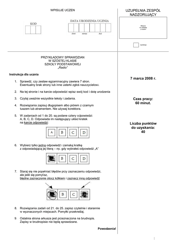 WPISUJE UCZEN UZUPEŁNIA ZESPÓŁ NADZORUJĄCY Miejsce na naklejkę z kodem dysleksja PRZYKŁADOWY SPRAWDZIAN W SZÓSTEJ KLASIE SZKOŁY PODSTAWOWEJ „Radio” Instrukcja dla ucznia 7 marca 2008 r. 1. Sprawdź, czy zestaw egzaminacyjny zawiera 7 stron. Ewentualny brak strony lub inne usterki zgłoś nauczycielowi. 2. Na tej stronie i na karcie odpowiedzi wpisz swój kod i datę urodzenia 3. Czytaj uważnie wszystkie teksty i zadania. Czas pracy: 60 minut. 4. Rozwiązania zapisuj długopisem albo piórem z czarnym tuszem lub atramentem. Nie używaj korektora. 5. W zadaniach od 1 do 20. są podane cztery odpowiedzi: A, B, C, D. Odpowiada im następujący układ kratek na karcie odpowiedzi: Liczba punktów do uzyskania: 40 6. Wybierz tylko jedną odpowiedź i zamaluj kratkę z odpowiadającą jej literą – np. gdy wybrałeś odpowiedź „A” 7. Staraj się nie popełniać błędów przy zaznaczeniu odpowiedzi, ale jeśli się pomylisz, błędne zaznaczenie otocz kółkiem i zaznacz inną odpowiedź 8. Rozwiązania zadań od 21. do 25. zapisz czytelnie i starannie w wyznaczonych miejscach. Pomyłki przekreślaj. 9. Ostatnia strona arkusza jest przeznaczona na brudnopis. Zapisy w brudnopisie nie będą sprawdzane. Powodzenia! 1 Radio Łączność radiową po raz pierwszy uzyskał Włoch Guglielmo Marconi w 1894 roku. W 1896 roku Marconi uzyskał na swój wynalazek patent brytyjski. W marcu 1899 roku nawiązał łączność radiową poprzez kanał La Manche, następnie na odległość 150 km na morzu, a w grudniu 1901 roku poprzez Atlantyk. Do celów wojskowych radio zastosowało po raz pierwszy na morzu podczas wojny rosyjsko-japońskiej (w latach 1904-1905). Opinię publiczną w Wielkiej Brytanii przekonał do radia jego udział w ujęciu groźnego przestępcy Crippena w 1911 roku. 24 grudnia 1906 roku wyemitowany pierwszy program radiowy, na który składały się: piosenka, wierszy, solo na skrzypcach i krótkie przemówienie. Pierwsza publiczna rozgłośnia radiowa rozpoczęła w Pittsburghu (USA) w 1920 roku, w tym samym czasie pojawiły się w sprzedaży pierwsze wytwarzane fabrycznie odbiorniki radiowe. Stały program zaczęto emitować w USA i Francji w 1921 roku. W Polsce stałe audycje radiowe (z Warszawy) rozpoczęto nadawać od marca 1926 roku. W roku 1990 zaczęło nadawać Radio Zet, pierwsze prywatno radio w Polsce. www.wynalazki.mt.com.pl 1. Wynalazek radia został opatentowany: A. B. C. D. w końcu XVIII wieku w USA. w końcu XVIII wieku w Wielkiej Brytanii. na początku XIX wieku w USA. w końcu XIX wieku w Wielkiej Brytanii. 2. Łączność radiową między kontynentami uzyskano po raz pierwszy: A. B. C. D. w końcu XVIII wieku. w końcu XIX wieku. na początku XX wieku. W 1920 roku w Stanach Zjednoczonych. 3. Od nadania pierwszego programu radiowego do powstania radia w Polsce minęło: A. 5 lat. B. 6 lat. C. 20 lat. D. 30 lat. 4. Wynalazek radia najwcześniej wykorzystano praktycznie dla: A. B. C. D. celów wojskowych. ścigania przestępców. łączności między kontynentami. nadawania programów okolicznościowych. 5. Guglielmo Marconi otrzymał Nagrodę Nobla. Chcąc się dowiedzieć, w którym roku, musisz zajrzeć do : A. B. C. D. słownika wyrazów obcych. słownika ortograficznego. słownika języka polskiego. encyklopedii. Mówiliśmy przez radio Dziś rano w klasie pani powiedziała: - Dzieci chciałabym wam coś oznajmić. W ramach ankiety prowadzonej wśród młodzieży szkolnej gościć będziemy reporterów z radia, którzy przeprowadzą z wami wywiad. 2 Nie odpowiedzieliśmy nic, bośmy nie zrozumieli. Zrozumiał tylko Ananiasz, ale to nic dziwnego: jest przecież pupilkiem naszej pani i najlepszym uczniem w klasie. Więc pani wytłumaczyła nam, że tacy panowie z radia przyjdą zadawać nam pytania, że robią tak we wszystkich szkołach w mieście, a dziś wypada nasza kolej. - Liczę na to, że będziecie się zachowywali grzecznie i mówili inteligentnie - powiedziała pani. Zdenerwowaliśmy się jak nie wiem co, słysząc, że mamy mówić przez radio, i pani musiała kilka razy uderzyć linijką w stół, żeby móc dalej prowadzić lekcję gramatyki. A potem otworzyły się drzwi i do klasy wszedł dyrektor z dwoma paniami, z których jeden niósł walizkę. - Wstać! – powiedziała pani. - Siadać! – powiedział dyrektor. – Drogie dzieci, wielki to honor dla naszej szkoły, że gościć będziemy radio, które czarodziejską mocą swoich fal, dzięki geniuszowi Marconiego, sprawi, iż słowa wasze rozbrzmiewać będą w tysiącach domów. Pewien jestem, że docenicie ten zaszczyt i postawą swą udowodnicie, że nie brak wam poczucia odpowiedzialności. W przeciwnym razie, uprzedzam, wobec błaznów zastosuję surowe kary! Ten pan wyjaśni wam, czego od was oczekuje. Wtedy jeden z panów wyjaśnił, że będzie nas pytał o to, co lubimy robić, o to, co czytamy, i o to czego uczymy się w szkole. A potem wziął do ręki jakiś przyrząd i powiedział: „To jest mikrofon. Będziecie do niego mówić, wyraźnie i bez obawy. A dziś wieczór, dokładnie o ósmej, będziecie mogli siebie usłyszeć, bo wszystko to zostało nagrane. (…) No to który chce mówić pierwszy?”. Ja! Ja! Ja! – zawołaliśmy wszyscy. Pan zaczął się śmiać. – Widząc, że mamy wielu chętnych. Będę więc musiał prosić panią, żeby wyznaczyła jednego z was. Na to pani oczywiście powiedziała, że trzeba zapytać Ananiasza, bo to najlepszy uczeń w klasie. Zawsze to samo z tym pupilkiem, kurcze blade! J.J. Sempé i R. Gościnny, Mikołajek i inne chłopaki, Warszawa 1986, s. 36 - 40 6. Pani uspokajała klasę: A. B. C. D. krzycząc na dzieci. grożąc surowymi karami dla błaznów. odwołując się do poczucia odpowiedzialności uczniów. uderzając linijką w stół. 7. Treścią wywiadu miło być: A. B. C. D. co uczniowie sądzą o czarodziejskiej mocy fal radiowych. co uczniowie chcieliby zmienić i ulepszyć w swojej szkole. co uczniowie czyta