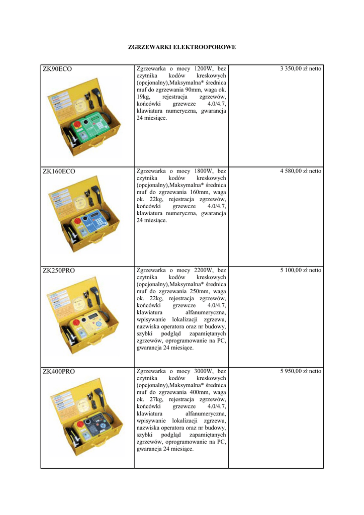 ZGRZEWARKI ELEKTROOPOROWE ZK90ECO Zgrzewarka o mocy 1200W, bez czytnika kodów kreskowych (opcjonalny),Maksymalna* średnica muf do zgrzewania 90mm, waga ok. 19kg, rejestracja zgrzewów, końcówki grzewcze 4.0/4.7, klawiatura numeryczna, gwarancja 24 miesiące. 3 350,00 zł netto ZK160ECO Zgrzewarka o mocy 1800W, bez czytnika kodów kreskowych (opcjonalny),Maksymalna* średnica muf do zgrzewania 160mm, waga ok. 22kg, rejestracja zgrzewów, końcówki grzewcze 4.0/4.7, klawiatura numeryczna, gwarancja 24 miesiące. 4 580,00 zł netto ZK250PRO Zgrzewarka o mocy 2200W, bez czytnika kodów kreskowych (opcjonalny),Maksymalna* średnica muf do zgrzewania 250mm, waga ok. 22kg, rejestracja zgrzewów, końcówki grzewcze 4.0/4.7, klawiatura alfanumeryczna, wpisywanie lokalizacji zgrzewu, nazwiska operatora oraz nr budowy, szybki podgląd zapamiętanych zgrzewów, oprogramowanie na PC, gwarancja 24 miesiące. 5 100,00 zł netto ZK400PRO Zgrzewarka o mocy 3000W, bez czytnika kodów kreskowych (opcjonalny),Maksymalna* średnica muf do zgrzewania 400mm, waga ok. 27kg, rejestracja zgrzewów, końcówki grzewcze 4.0/4.7, klawiatura alfanumeryczna, wpisywanie lokalizacji zgrzewu, nazwiska operatora oraz nr budowy, szybki podgląd zapamiętanych zgrzewów, oprogramowanie na PC, gwarancja 24 miesiące. 5 950,00 zł netto ZK-6000 Zgrzewarka ZK-6000 została zaprojektowana w formie kompaktowej służącej łatwemu przenoszeniu i użytkowaniu. Dzięki zwartej konstrukcji zgrzewarka waży tylko 19kg a jej aluminiowa, szczelna obudowa zapewnia wieloletnie, bezawaryjne użytkowanie. Główne cechy i wyposażenie: Piórko świetlne (standardowo), USB (pamięć przenośna typu PENDRIVE), Pamięć zgrzewów (2048 wpisów), TRACEABILITY, Napięcie zgrzewania: 8-48V, Zasilanie: 200V-250V (230V), Przybliżona maksymalna średnica zgrzewania 630 mm. 8 100,00 zł netto ZT-6000 Zgrzewarka ZT-6000 została zaprojektowana z myślą o zastosowaniu w trudnych warunkach polowych, maksymalna* średnica muf do zgrzewania 630mm, piórko świetlne (standardowo), USB (pamięć przenośna typu PENDRIVE), Pamięć zgrzewów (2048 wpisów), TRACEABILITY. 9 200,00 zł netto EUROTECH LIGHT Zgrzewarka o mocy 2000W, z urządzeniem czytającym: pióro świetlne. Maksymalna średnica muf do zgrzewania 160 mm, z pamięcią zgrzewów (350 zgrzewów). Posiada wyświetlacz LCD- 8 znaków, waga 7 kg, wymiary 200x250x210 mm, posiada gniazda USB i RS232. Wyposażenie dodatkowe: skrobak ręczny. Gwarancja 12 miesięcy. Zgrzewarka o mocy 2700W, ze skanerem. Maksymalna średnica muf do zgrzewania 400 mm, z pamięcią zgrzewów (4000 zgrzewów). Waga 19,5 kg, wymiary 358x285x302 mm, posiada gniazda USB i RS232. Wyposażenie dodatkowe: skrobak ręczny. Gwarancja 12 miesięcy. Zgrzewarka o mocy 3500W, ze skanerem. Maksymalna średnica muf do zgrzewania 800 mm, z pamięcią zgrzewów (4000 zgrzewów). Waga 22,5 kg, wymiary 358x285x302 mm, posiada gniazda USB i RS232. Wyposażenie dodatkowe: skrobak ręczny. Gwarancja 12 miesięcy. 4 000,00 zł netto EUROTECH 400 EUROTECH 800 7 000,00 zł netto 8 500,00 zł netto