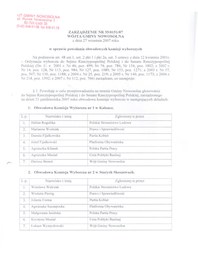 IJT GMINY NOWOSOLNA ul. Rynek NowosoJna 1 92-703 Lódz 35 (0-42)648-41-08,fax 648-41-1g ZARZADZENIE NR 35/0151/07 WÓJTA GMINY NOWOSOLNA z dnia 27 wrzesnia 2007 roku w sprawie powolania obwodowych komisji wyborczych Na podstawie art. 48 ust. 1, ust. 2 pkt 1 i pkt 2a, ust. 3 ustawy z dnia 12 k\vietnia 2001r. - Ordynacja wyborcza do Sejmu Rzeczypospolitej Polskiej i do Senatu Rzeczypospolitej Polskiej (Dz. U. z 2001 r. Nr 46, poz. 499, Nr 74, poz. 786, Nr 154, poz. 1802; z 2002 r. Nr 14. poz. 128,Nr 113,poz. 984, Nr 127,poz. 1089,Nr 153,poz. 1271; z 2003 r. Nr 57. poz. 507, Nr 130, poz. 1188; z 2004 r. Nr 25, poz. 219; z 2005 r. Nr 140, poz. 1173; z 2006 r. Nr 218, poz. 1592; z 2007 r. Nr 112, poz. 766) zarzadzam, co nastepuje: "- § 1. Powoluje w celu przeprowadzenia na terenie Gminy Nowosolna glosowania do Sejmu Rzeczypospolitej Polskiej i do Senatu Rzeczypospolitej Polskiej, zarzadzonego na dzien 21 pazdziernika 2007 roku obwodowe komisje wyborcze w nastepujacych skladach: 1. Obwodowa Komisja Wyborcza nr 1 w Kalonce. Nazwisko i imie i L.p. l. Halina Roguiska 2. ! Marianna Wozniak I , J. ! Danuta Fijalkowska 4. r-- i Józef Fijalkowski i 5. Agnieszka Klimek 6. I Agnieszka Musial 7. Dariusz Berent Zgloszony/a przez Polskie Stronnictwo Ludowe Prawo i Sprawiedliwosc ! I Partia Kobiet Platfonna Obywatelska Polska Partia Pracy I Unia Polityki Realnej Wójt Gminy Nowosolna 2. Obwodowa Komisja Wyborcza nr 2 w Starych Skoszewach. Nazwisko i linie i! L.p. , Zgloszony/a przez l. Wieslawa Walczak Polskie Stronnictwo Ludowe 2. Wioletta Pieróg Prawo i Sprawiedliwosc 3. Jolanta Forma Partia Kobiet 4. Agnieszka Szczepocka Platfomla Obywatelska 5. Malgorzata Jasiliska Polska Partia Pracy 6. IKl)'styna Musial 7. ILukasz Wymyslowski I Unia Polityki Realnej Wójt Gminy Nowosolna I 3. Obwodowa Komisja Wyborcza nr 3 w Lipinach. L.p. Nazwisko i imie Zgloszony/a przez l. Piotr Domagala Polskie Stronnictwo Ludowe 2. , . Aleksandra Zerominska Prawo i Sprawiedliwosc Bozena Pudlarz Partia Kobiet 4. SYlwester Sala Platfonna Obywatelska 5. Monika Adamczewska' Polska Partia Pracy 6. Magdalena Soldon Unia Polityki Realnej 7. I Renata Lewandowska i l Wójt Gminy Nowosolna 4. Obwodowa Komisja Wyborcza nr 4 w Wiaczyniu Dolnym. L.p. Nazwisko i imie Zgloszony/a przez Wioleta Salewicz Polskie StrOlmictwo Ludowe Katarzyna Zalewska Pastusiak Prawo i Sprawiedliwosc 3. Aneta Mecina Partia Kobiet 4. Jolanta Pawlak Platforma Obywatelska 5. Jan Musial Polska Partia Pracy 6. Aleksandra Piatkowska Unia Polityki Realnej 7. Kazimiera Malkiewicz Wójt Gminy Nowosolna l. ! ; , 2. i l § 2. Zarzadzenie wchodzi w zycie z dniem podjecia i podlega publikacji na tablicy informacyjnej Urzedu Gminy Nowosolna. r- ~ 'JTt mqr Tó d. z Bystronski