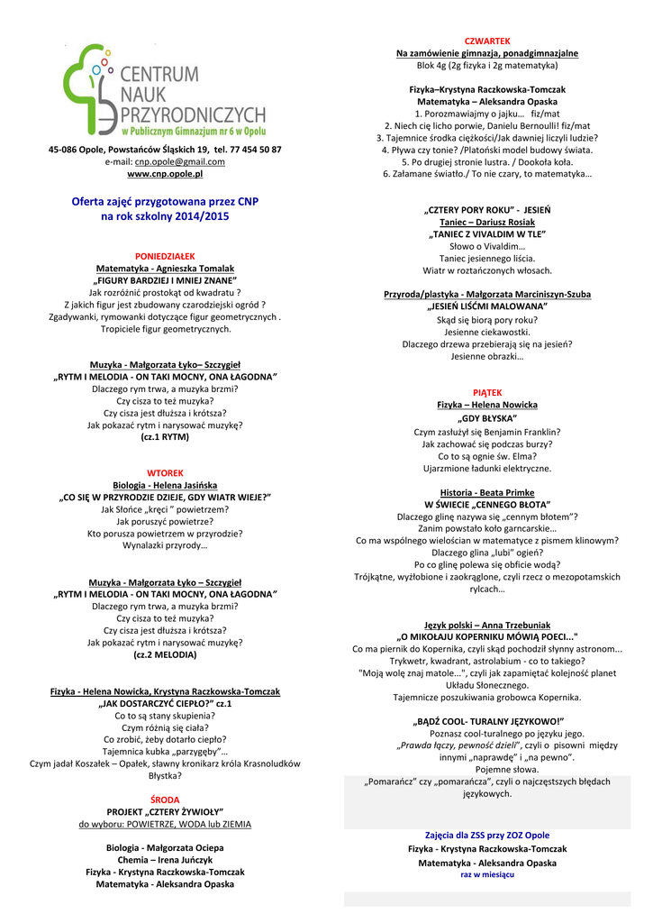 CZWARTEK Na zamówienie gimnazja, ponadgimnazjalne Blok 4g (2g fizyka i 2g matematyka) 45-086 Opole, Powstańców Śląskich 19, tel. 77 454 50 87 e-mail: [email protected] www.cnp.opole.pl Oferta zajęć przygotowana przez CNP na rok szkolny 2014/2015 PONIEDZIAŁEK Matematyka - Agnieszka Tomalak „FIGURY BARDZIEJ I MNIEJ ZNANE” Jak rozróżnić prostokąt od kwadratu ? Z jakich figur jest zbudowany czarodziejski ogród ? Zgadywanki, rymowanki dotyczące figur geometrycznych . Tropiciele figur geometrycznych. Muzyka - Małgorzata Łyko– Szczygieł „RYTM I MELODIA - ON TAKI MOCNY, ONA ŁAGODNA” Dlaczego rym trwa, a muzyka brzmi? Czy cisza to też muzyka? Czy cisza jest dłuższa i krótsza? Jak pokazać rytm i narysować muzykę? (cz.1 RYTM) WTOREK Biologia - Helena Jasińska „CO SIĘ W PRZYRODZIE DZIEJE, GDY WIATR WIEJE?” Jak Słońce „kręci ” powietrzem? Jak poruszyć powietrze? Kto porusza powietrzem w przyrodzie? Wynalazki przyrody… Muzyka - Małgorzata Łyko – Szczygieł „RYTM I MELODIA - ON TAKI MOCNY, ONA ŁAGODNA” Dlaczego rym trwa, a muzyka brzmi? Czy cisza to też muzyka? Czy cisza jest dłuższa i krótsza? Jak pokazać rytm i narysować muzykę? (cz.2 MELODIA) Fizyka - Helena Nowicka, Krystyna Raczkowska-Tomczak „JAK DOSTARCZYĆ CIEPŁO?” cz.1 Co to są stany skupienia? Czym różnią się ciała? Co zrobić, żeby dotarło ciepło? Tajemnica kubka „parzygęby”… Czym jadał Koszałek – Opałek, sławny kronikarz króla Krasnoludków Błystka? ŚRODA PROJEKT „CZTERY ŻYWIOŁY” do wyboru: POWIETRZE, WODA lub ZIEMIA Biologia - Małgorzata Ociepa Chemia – Irena Juńczyk Fizyka - Krystyna Raczkowska-Tomczak Matematyka - Aleksandra Opaska Fizyka–Krystyna Raczkowska-Tomczak Matematyka – Aleksandra Opaska 1. Porozmawiajmy o jajku… fiz/mat 2. Niech cię licho porwie, Danielu Bernoulli! fiz/mat 3. Tajemnice środka ciężkości/Jak dawniej liczyli ludzie? 4. Pływa czy tonie? /Platoński model budowy świata. 5. Po drugiej stronie lustra. / Dookoła koła. 6. Załamane światło./ To nie czary, to matematyka… „CZTERY PORY ROKU” - JESIEŃ Taniec – Dariusz Rosiak „TANIEC Z VIVALDIM W TLE” Słowo o Vivaldim… Taniec jesiennego liścia. Wiatr w roztańczonych włosach. Przyroda/plastyka - Małgorzata Marciniszyn-Szuba „JESIEŃ LIŚĆMI MALOWANA” Skąd się biorą pory roku? Jesienne ciekawostki. Dlaczego drzewa przebierają się na jesień? Jesienne obrazki… PIĄTEK Fizyka – Helena Nowicka „GDY BŁYSKA” Czym zasłużył się Benjamin Franklin? Jak zachować się podczas burzy? Co to są ognie św. Elma? Ujarzmione ładunki elektryczne. Historia - Beata Primke W ŚWIECIE „CENNEGO BŁOTA” Dlaczego glinę nazywa się „cennym błotem”? Zanim powstało koło garncarskie… Co ma wspólnego wielościan w matematyce z pismem klinowym? Dlaczego glina „lubi” ogień? Po co glinę polewa się obficie wodą? Trójkątne, wyżłobione i zaokrąglone, czyli rzecz o mezopotamskich rylcach… Język polski – Anna Trzebuniak „O MIKOŁAJU KOPERNIKU MÓWIĄ POECI..." Co ma piernik do Kopernika, czyli skąd pochodził słynny astronom... Trykwetr, kwadrant, astrolabium - co to takiego? "Moją wolę znaj matole...", czyli jak zapamiętać kolejność planet Układu Słonecznego. Tajemnicze poszukiwania grobowca Kopernika. „BĄDŹ COOL- TURALNY JĘZYKOWO!” Poznasz cool-turalnego po języku jego. „Prawda łączy, pewność dzieli”, czyli o pisowni między innymi „naprawdę” i „na pewno”. Pojemne słowa. „Pomarańcz” czy „pomarańcza”, czyli o najczęstszych błędach językowych. Zajęcia dla ZSS przy ZOZ Opole Fizyka - Krystyna Raczkowska-Tomczak Matematyka - Aleksandra Opaska raz w miesiącu Tematyka sobotnich zajęć otwartych Biologia - Helena Jasińska „PIERNIKOWE SZALEŃSTWO” Jak wytresować drożdże? Nie z każdej mąki będzie chleb, a z której będzie? Czy tylko drożdże rosną? Co tak pachnie, gdy smakuje? Biologia - Małgorzata Ociepa „W ŚWIECIE ZMYSŁÓW” Sztuka czytania. Skaczące kolana. Plamy nie tylko na słońcu. Choroba morska bez morza. Chemia - Irena Juńczyk „CO NAS CZEKA NA BEZLUDNEJ WYSPIE?" Fizyka – Helena Nowicka „PLYWA CZY TONIE?” Jak wybuchają wulkany? Co to są ruchome piaski? Czy piasek lubi wodę? Jak uciec z bezludnej wyspy? Fizyka – Krystyna Raczkowska-Tomczak „NIECH CIĘ LICHO PORWIE, DANIELU BERNOULLI!” Czy oszustwo może przyczynić się do sformułowania prawa? Czy przemytnicy muszą znać fizykę? Puszysty i chudzielec w basenie. Pływające zabawki... Taniec – Dariusz Rosiak „ZABAWY Z TAŃCEM” Kilka słów o rodzie sławnego Daniela... Jak zachowuje się powietrze w ruchu? Zaczęło się od latawców, czyli dwa łyki aerodynamiki. Co wspólnego z Bernoullim ma rozpylacz? Zabawki Bernoulliego. Matematyka – Aleksandra Opaska „DOOKOŁA KOŁA” Krążymy wokół koła i okręgu. O promieniach, cięciwach i średnicach. Co robią dwa okręgi na płaszczyźnie? Jak wygląda rytm w tańcu? Czy koło w tańcu się toczy? Linia w tańcu. Ciekawe zabawy taneczne... Przyroda/plastyka - Małgorzata Marciniszyn-Szuba „W STYLU EKO” Muzyka - Małgorzata Łyko- Szczygieł „W KRAINIE DŹWIĘKÓW" Co to jest muzyka? Co kompozytor miał na myśli? "Rozmowa" instrumentów muzycznych. Nastroje i emocje w muzyce. Historia pewnej gazety. Czy ekologia to to samo, co ochrona środowiska? Na zakupy w stylu EKO…