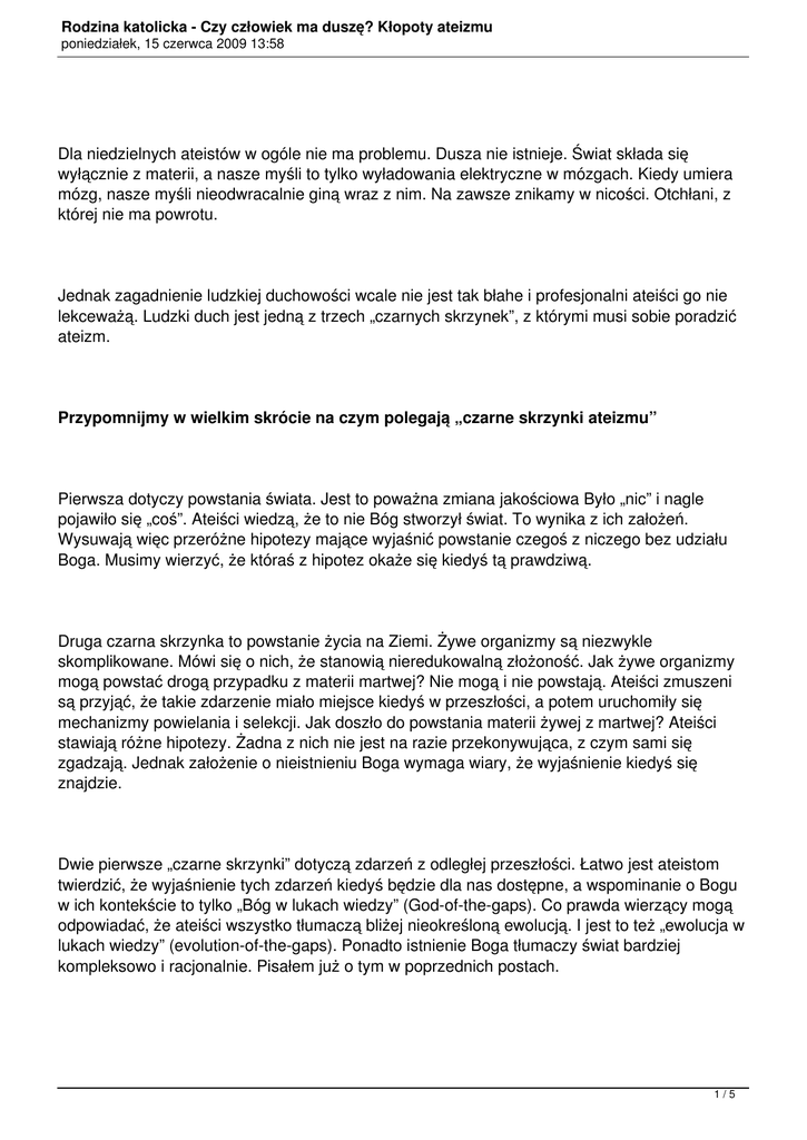 Rodzina katolicka - Czy człowiek ma duszę? Kłopoty ateizmu poniedziałek, 15 czerwca 2009 13:58 Dla niedzielnych ateistów w ogóle nie ma problemu. Dusza nie istnieje. Świat składa się wyłącznie z materii, a nasze myśli to tylko wyładowania elektryczne w mózgach. Kiedy umiera mózg, nasze myśli nieodwracalnie giną wraz z nim. Na zawsze znikamy w nicości. Otchłani, z której nie ma powrotu. Jednak zagadnienie ludzkiej duchowości wcale nie jest tak błahe i profesjonalni ateiści go nie lekceważą. Ludzki duch jest jedną z trzech „czarnych skrzynek”, z którymi musi sobie poradzić ateizm. Przypomnijmy w wielkim skrócie na czym polegają „czarne skrzynki ateizmu” Pierwsza dotyczy powstania świata. Jest to poważna zmiana jakościowa Było „nic” i nagle pojawiło się „coś”. Ateiści wiedzą, że to nie Bóg stworzył świat. To wynika z ich założeń. Wysuwają więc przeróżne hipotezy mające wyjaśnić powstanie czegoś z niczego bez udziału Boga. Musimy wierzyć, że któraś z hipotez okaże się kiedyś tą prawdziwą. Druga czarna skrzynka to powstanie życia na Ziemi. Żywe organizmy są niezwykle skomplikowane. Mówi się o nich, że stanowią nieredukowalną złożoność. Jak żywe organizmy mogą powstać drogą przypadku z materii martwej? Nie mogą i nie powstają. Ateiści zmuszeni są przyjąć, że takie zdarzenie miało miejsce kiedyś w przeszłości, a potem uruchomiły się mechanizmy powielania i selekcji. Jak doszło do powstania materii żywej z martwej? Ateiści stawiają różne hipotezy. Żadna z nich nie jest na razie przekonywująca, z czym sami się zgadzają. Jednak założenie o nieistnieniu Boga wymaga wiary, że wyjaśnienie kiedyś się znajdzie. Dwie pierwsze „czarne skrzynki” dotyczą zdarzeń z odległej przeszłości. Łatwo jest ateistom twierdzić, że wyjaśnienie tych zdarzeń kiedyś będzie dla nas dostępne, a wspominanie o Bogu w ich kontekście to tylko „Bóg w lukach wiedzy” (God-of-the-gaps). Co prawda wierzący mogą odpowiadać, że ateiści wszystko tłumaczą bliżej nieokreśloną ewolucją. I jest to też „ewolucja w lukach wiedzy” (evolution-of-the-gaps). Ponadto istnienie Boga tłumaczy świat bardziej kompleksowo i racjonalnie. Pisałem już o tym w poprzednich postach. 1/5 Rodzina katolicka - Czy człowiek ma duszę? Kłopoty ateizmu poniedziałek, 15 czerwca 2009 13:58 Największe problemy mają ateiści z trzecią „czarną skrzynką” – ludzkim „ja”. Jak ono wyewoluowało i czym jest? Znów mamy przeskok od „niczego” do „czegoś”. Ludzkiego ducha nie było, a potem nagle powstał. Duch powstał z czegoś, co duchowe nie jest. Możliwy jest jakiś tropizm, instynkt, ale nie duch. Tym razem „czarna skrzynka” dotyczy zjawiska, z którym każdy z nas obcuje na co dzień, a nie zdarzenia z odległej przeszłości. Każdy z nas jest stale „samym sobą”. Ateizm, żeby zachować wiarygodność, musi się do tego problemu odnieść. Kim jesteśmy według Richarda Dawkinsa? Ateiści postrzegają świat jako bezcelowy i pozbawiony sensu. Jednak ludzie działają w poczuciu sensu i działają celowo. Sami ateiści widzą sens w przekonaniu innych o nieistnieniu Boga i robią wszystko, żeby ten cel osiągnąć. Błędne koło? Żeby się z tego błędnego koła wyrwać, ateiści muszą wykazać, że nasze „ja” w pełni należy do świata materii. Jak to robią? Rozwiązanie pierwsze to temat ignorować. W ludzkim mózgu nie daje się odkryć żadnego ośrodka decyzyjnego. Nic, co można by zbadać. Zero empirycznie uchwytnego „ja”. Pytania o „ja” traktujemy więc jako bezsensowne i badamy zachowania człowieka. Jeśli kogoś ukłujemy szpilką, to krzyknie „au!”. I tak dalej. Co z pojęciami sensu i celowości? Są to tylko kategorie językowe. W realnym świecie ich nie ma. Bytują w sferze systemów formalnych. Takie podejście może przynieść wiele odkryć użytecznych w reklamie i psychomanipulacji. Jest jednak filozoficznie jałowe. Rozwiązanie drugie. Wewnętrzne oko. Koncepcję tę stworzył Nicholas Humphrey. W toku ewolucji zaistniała potrzeba przewidzenia, co zrobi przeciwnik w walce o byt. Wiedzę tę było najłatwiej zdobyć obserwując własne reakcje i rozumując o przeciwniku przez analogię. Tak powstało „wewnętrzne oko”. Koncepcja jest spójna, ma jednak dwie wady. Nie da się jej w żaden sposób udowodnić, a poza tym rodzi pytanie, kto patrzy wewnętrznym okiem? Czyżby jakiś pozamaterialny byt, któremu umożliwiono śledzenie naszych reakcji? 2/5 Rodzina katolicka - Czy człowiek ma duszę? Kłopoty ateizmu poniedziałek, 15 czerwca 2009 13:58 Najbardziej spójny filozoficznie i konsekwentnie ateistyczny jest pogląd Richarda Dawkinsa wyrażony w książce „Samolubny gen” i rozwinięty w pracy jego uczennicy Susan Blackmore „Maszyna Memowa”. Według tego poglądu człowiek w jakiś (bliżej jeszcze oczywiście nieznany) sposób wyewoluował w jedyny gatunek zdolny uczyć się przez naśladownictwo. Umożliwiają nam to nasze wyjątkowo wielkie mózgi. Dzięki naszym ogromnym mózgom powstała jednostka informacji powielająca się drogą naśladownictwa – mem. Odkąd memy powstały, powielają się i selekcjonują w sposób zbliżony do genów. Te, które sprawniej się powielają, zasiedlają nasze mózgi, a te mniej sprawne giną. Zarówno nasze myśli, jak cywilizacja i kultura są efektem ewolucji memów. Czy memy współpracują z genami? Zdaniem Dawkinsa takiego związku nie ma. Każdy replikator powiela się bezdusznie i bezcelowo. Dawkins używa nawet zwrotu „tyrania bezdusznych genów i memów”. W ten sposób osiąga absolutnie spójny logicznie ateizm. Żadna duchowość nigdy nie powstała. Dzięki powielaniu i selekcji genów mamy ciała, zaś dzięki powielaniu i selekcji memów – myśli i kultury. Poezja, Bóg, przywiązanie do płatków śniadaniowych i piosenek – wszystko to są ty