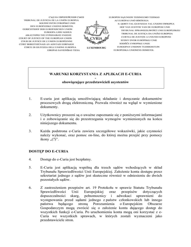WARUNKI KORZYSTANIA Z APLIKACJI E-CURIA obowiązujące przedstawicieli asystentów 1. E-curia jest aplikacją umożliwiającą składanie i doręczanie dokumentów procesowych drogą elektroniczną. Pozwala również na wgląd w wymienione dokumenty. 2. Użytkownicy proszeni są o uważne zapoznanie się z poniższymi informacjami i o zobowiązanie się do przestrzegania wymogów wymienionych na końcu niniejszego dokumentu. 3. Każda podstrona e-Curia zawiera szczegółowe wskazówki, jakie czynności należy wykonać, oraz pomoc on-line, do której można przejść przy pomocy ikony „(?)”. DOSTĘP DO E-CURIA 4. Dostęp do e-Curia jest bezpłatny. 5. E-Curia jest aplikacją wspólną dla trzech sądów wchodzących w skład Trybunału Sprawiedliwości Unii Europejskiej. Założenie konta dostępu przez sekretariat jednego z sądów jest skuteczne również w odniesieniu do dwóch pozostałych sądów. 6. Z zastrzeżeniem przepisów art. 19 Protokołu w sprawie Statutu Trybunału Sprawiedliwości Unii Europejskiej oraz przepisów dotyczących dopuszczalności skarg, pełnomocnicy i adwokaci uprawnieni do występowania przed sądami jednego z państw członkowskich lub innego państwa będącego stroną Porozumienia o Europejskim Obszarze Gospodarczym mogą zwrócić się o założenie konta dającego dostęp do wszystkich funkcji e-Curia. Po uruchomieniu konta mogą oni korzystać z eCuria we wszystkich sprawach, w których zostali wyznaczeni jako przedstawiciele stron. 7. Formularz z wnioskiem o założenie konta, do którego dostęp znajduje się na stronie internetowej Trybunału przez stronę logowania do e-Curia, należy wypełnić, wydrukować, opatrzyć datą i podpisem, a następnie odesłać pocztą do sekretariatu jednego z trzech sądów wraz z niezbędnymi dokumentami potwierdzającymi. Dostarczenie powyższych dokumentów nie zwalnia przedstawicieli stron z obowiązku każdorazowego przedkładania w poszczególnych sprawach zaświadczeń wymaganych zgodnie z właściwymi dla danego postępowania normami proceduralnymi. 8. Po zatwierdzeniu wniosku przez sekretariat danego sądu do użytkownika zostają wysłane dwa oddzielne e-maile. W pierwszym podaje się jego identyfikator, a w drugim – osobiste hasło. Użytkownik musi zmienić hasło przy pierwszym logowaniu, a następnie zmieniać je przynajmniej co sześć miesięcy. 9. Dodatkowo przedstawiciel strony może również zwrócić się o założenie konta dla każdego z imiennie wyznaczonych przez siebie asystentów. Takie konto umożliwia asystentowi odbiór doręczanych dokumentów, wgląd w złożone oraz odebrane przez e-Curia dokumenty procesowe oraz przygotowanie złożenia pisma, przy czym samo złożenie wymaga zatwierdzenia przez przedstawiciela strony. Z konta asystenta korzysta się na odpowiedzialność przedstawiciela strony, który jest zobowiązany do regularnego aktualizowania listy swoich asystentów, a w szczególności do usunięcia konta, które założył asystentowi, w razie gdy ten zmieni stanowisko pracy lub zakończy pracę. 10. Konto dostępu nieużywane przez trzy lata zostaje automatycznie dezaktywowane. W takim wypadku niezbędne jest złożenie nowego wniosku o założenie konta. FUNKCJE E-CURIA Składanie pism procesowych 11. E-Curia pozwala przedstawicielom stron na składanie pism procesowych (wraz z ewentualnymi załącznikami) drogą elektroniczną, bez konieczności listownego potwierdzenia złożenia pisma. Co do zasady złożenie jednego pisma procesowego przez e-Curia oznacza, że przedstawiciel strony będzie składał kolejne pisma w tej samej sprawie w ten sam sposób. Jednak złożenie pisma procesowego przez e-Curia w danej sprawie nie odbiera możliwości złożenia w późniejszym czasie pisma w tej samej sprawie w inny przewidziany we właściwych normach proceduralnych sposób, jeżeli wymaga tego charakter pisma. 12. Asystent posiadający konto dostępu może również przygotować dla przedstawiciela strony złożenie pisma. W takim wypadku przedstawiciel strony musi osobiście wprowadzić swoje hasło, aby zatwierdzić złożenie pisma. 13. Pisma procesowe składane przez e-Curia należy przesyłać w formacie PDF (format graficzny i tekstowy). 2 14. Dokumenty przesyłane do sądów podlegają kontroli w celu zapewnienia, że transfer nie powoduje zagrożenia z informatycznego punktu widzenia. Jeżeli kontrola wykaże anomalie, składany dokument zostanie odrzucony. 15. W razie stwierdzenia zakłóceń lub nieprawidłowego działania przy przekazywaniu pisma procesowego, użytkownik powinien niezwłocznie zawiadomić o tym sekretariat danego sądu. Aby uniknąć przekroczenia terminu do złożenia pisma, pismo to należy w razie potrzeby złożyć w inny przewidziany sposób, zgodnie z właściwymi przepisami proceduralnymi. 16. Do użytkownika wysyłane jest potwierdzenie złożenia pisma, wskazujące między innymi dzień i godzinę złożenia. Za chwilę złożenia pisma procesowego uznaje się chwilę zatwierdzenia złożenia tego pisma przez przedstawiciela strony. Godzinę liczy się według czasu obowiązującego w Wielkim Księstwie Luksemburga. Godzina ta wyświetlona jest na wszystkich podstronach e-Curia. 17. Ze względu na różny czas trwania przygotowania złożenia pisma oraz ściągnięcia plików, zaleca się użytkownikom, by nie czekali z rozpoczęciem przygotowania złożenia pisma do ostatniej chwili przed upływem terminu. 18. Potwierdzenie złożenia pisma nie przesądza o dopuszczalności przekazanych dokumentów w świetle norm proceduralnych. 19. Transmisja pism procesowych jest automatycznie szyfrowana. Dla każdego składanego pisma procesowego obliczana jest suma kontrolna zgodnie ze standardową procedurą (SHA-512). Suma kontrolna podana jest na potwierdzeniu złożenia, którego zachowanie w wersji elektronicznej jest zalecane przez cały czas trwania sprawy. W każdej chwili istnieje możliwość sprawdzenia, czy dany dokument nie zos