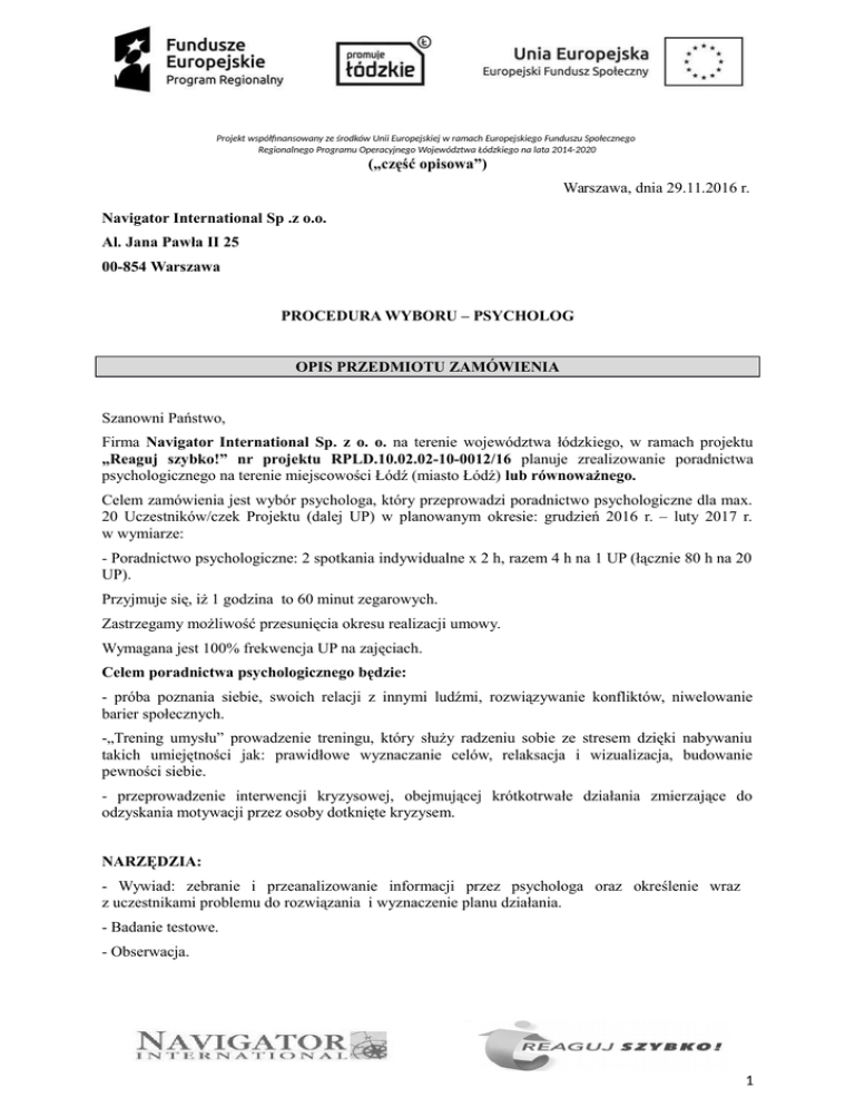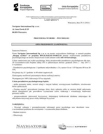 Projekt współfinansowany ze środków Unii Europejskiej w ramach Europejskiego Funduszu Społecznego Regionalnego Programu Operacyjnego Województwa Łódzkiego na lata 2014-2020 („część opisowa”) Warszawa, dnia 29.11.2016 r. Navigator International Sp .z o.o. Al. Jana Pawła II 25 00-854 Warszawa PROCEDURA WYBORU – PSYCHOLOG OPIS PRZEDMIOTU ZAMÓWIENIA Szanowni Państwo, Firma Navigator International Sp. z o. o. na terenie województwa łódzkiego, w ramach projektu „Reaguj szybko!” nr projektu RPLD.10.02.02-10-0012/16 planuje zrealizowanie poradnictwa psychologicznego na terenie miejscowości Łódź (miasto Łódź) lub równoważnego. Celem zamówienia jest wybór psychologa, który przeprowadzi poradnictwo psychologiczne dla max. 20 Uczestników/czek Projektu (dalej UP) w planowanym okresie: grudzień 2016 r. – luty 2017 r. w wymiarze: - Poradnictwo psychologiczne: 2 spotkania indywidualne x 2 h, razem 4 h na 1 UP (łącznie 80 h na 20 UP). Przyjmuje się, iż 1 godzina to 60 minut zegarowych. Zastrzegamy możliwość przesunięcia okresu realizacji umowy. Wymagana jest 100% frekwencja UP na zajęciach. Celem poradnictwa psychologicznego będzie: - próba poznania siebie, swoich relacji z innymi ludźmi, rozwiązywanie konfliktów, niwelowanie barier społecznych. -„Trening umysłu” prowadzenie treningu, który służy radzeniu sobie ze stresem dzięki nabywaniu takich umiejętności jak: prawidłowe wyznaczanie celów, relaksacja i wizualizacja, budowanie pewności siebie. - przeprowadzenie interwencji kryzysowej, obejmującej krótkotrwałe działania zmierzające do odzyskania motywacji przez osoby dotknięte kryzysem. NARZĘDZIA: - Wywiad: zebranie i przeanalizowanie informacji przez psychologa oraz określenie wraz z uczestnikami problemu do rozwiązania i wyznaczenie planu działania. - Badanie testowe. - Obserwacja. 1 Projekt współfinansowany ze środków Unii Europejskiej w ramach Europejskiego Funduszu Społecznego Regionalnego Programu Operacyjnego Województwa Łódzkiego na lata 2014-2020 - Realizacja zasady równości szans kobiet i mężczyzn i niedyskryminacji: zapoznanie Uczestników z zagadnieniami równych szans i niedyskryminacji na rynku pracy, rozmowa o podejmowaniu niestereotypowych wyborów zawodowych. W związku z powyższym zamówieniem poszukujemy PSYCHOLOGA gotowego do zrealizowania całości ww. zadań oraz informujemy o możliwości złożenia wyceny (kod CPV 80500000-9 – Usługi szkoleniowe). Od PSYCHOLGA wymagamy w szczególności: 1. Przeprowadzenia zajęć o wskazanym zakresie. 2. Posiadania wykształcenia wyższego kierunkowego oraz minimum 2- letniego doświadczenia w danej dziedzinie (poradnictwo psychologiczne). 3. Przygotowania szczegółowego programu zajęć w oparciu o powyższy zakres merytoryczny, podlegający zatwierdzeniu przez Kierowniczkę Projektu. 4. Przeprowadzenia indywidualnych spotkań z Uczestnikami Projektu. 5. Współpracy z Zespołem Zarządzającym Projektem w zakresie wykonywanych zadań, w szczególności w zakresie wymiany informacji, konsultacji. 6. Prowadzenia niezbędnej dokumentacji na potrzeby realizowanego projektu oraz ewaluacji (listy obecności, sprawozdania z prowadzonych spotkań, ankiety początkowej i końcowej). 7. Prowadzenie dokumentacji dydaktycznej na wzorach Zamawiającego tj. m.in. dziennika zajęć wypełnianego na każdych zajęciach, list obecności podpisywanych na każdych zajęciach, sprawozdania z prowadzonych spotkań. 8. Oznaczenie sal oraz budynków, w których prowadzone będą zajęcia zgodnie z zasadami projektu. 9. Przekazywanie w formie telefonicznej lub e-mail, niezwłocznie informacji o każdym uczestniku, który opuszcza spotkania lub posiada innego rodzaju zaległości. 10. Każdorazowe przesyłanie w terminie 7 dni kalendarzowych od zakończenia, zajęć dokumentów potwierdzających ich odbycie. 11. Wykonanie innych, dodatkowych czynności związanych z bezpośrednią realizacją projektu Zamawiający deklaruje nawiązanie współpracy na podstawie umowy zlecenie. Wykonawca zobowiązuje się w toku realizacji umowy do bezwzględnego stosowania wytycznych horyzontalnych, wytycznych programowych oraz Wytycznych w zakresie kwalifikowalności wydatków w ramach Europejskiego Funduszu Rozwoju Regionalnego, Europejskiego Funduszu Społecznego oraz Funduszu Spójności na lata 2014–2020. W związku z tym informujemy o możliwości złożenia wyceny. 2 Projekt współfinansowany ze środków Unii Europejskiej w ramach Europejskiego Funduszu Społecznego Regionalnego Programu Operacyjnego Województwa Łódzkiego na lata 2014-2020 SPOSÓB PRZYGOTOWANIA I SKŁADANIA WYCENY 1. Ze strony Zamawiającego do kontaktów z Wykonawcami został upoważniony p. Krzysztof Dumała, [email protected], tel. 517-452-941. 2. Siedziba Zamawiającego: Navigator International Sp. z o.o., Al. Jana Pawła II 25, 00-854 Warszawa. 3. Złożenie wyceny polega na wypełnieniu „części ofertowej” oraz przesłaniu całego dokumentu (tj. „części opisowej” oraz „części ofertowej”) wraz z wszelkimi wymaganymi załącznikami w formie elektronicznej na adres e-mail: [email protected] lub pisemnie do siedziby Zamawiającego. W przypadku wyceny pisemnej, wycenę wraz z pozostałymi dokumentami należy złożyć w nieprzezroczystej, zabezpieczonej przed otwarciem kopercie. Kopertę należy opisać następująco: „Wycena usługi Poradnictwa psychologicznego w ramach realizacji projektu „Reaguj szybko!” nr projektu RPLD.10.02.02-10.0012/16”. Na kopercie oprócz opisu jw. zaleca się umieścić nazwę i adres Wykonawcy. 4. W przypadku wycen składanych w wersji elektronicznej: a) Zamawiający akceptuje wyłącznie pliki z rozszerzeniem .pdf, .doc, .docx, odt. b) Zaleca się, aby każdy załącznik wielostronicowy był zapisany w jednym pliku, c) Zaleca się, aby każdy załączony plik miał nadaną inną nazwę własną. 5. 6. 7. 8. 9. 10. 11. 12. 13. W przypadku problemów tec
