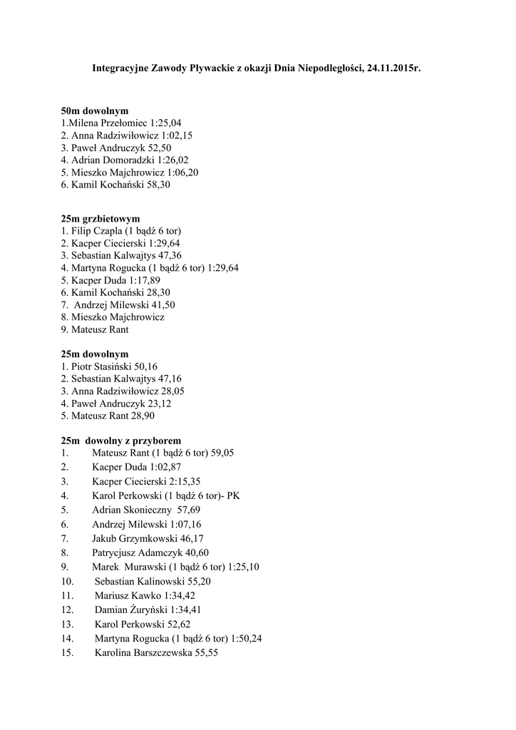 Integracyjne Zawody Pływackie z okazji Dnia Niepodległości, 24.11.2015r. 50m dowolnym 1.Milena Przełomiec 1:25,04 2. Anna Radziwiłowicz 1:02,15 3. Paweł Andruczyk 52,50 4. Adrian Domoradzki 1:26,02 5. Mieszko Majchrowicz 1:06,20 6. Kamil Kochański 58,30 25m grzbietowym 1. Filip Czapla (1 bądź 6 tor) 2. Kacper Ciecierski 1:29,64 3. Sebastian Kalwajtys 47,36 4. Martyna Rogucka (1 bądź 6 tor) 1:29,64 5. Kacper Duda 1:17,89 6. Kamil Kochański 28,30 7. Andrzej Milewski 41,50 8. Mieszko Majchrowicz 9. Mateusz Rant 25m dowolnym 1. Piotr Stasiński 50,16 2. Sebastian Kalwajtys 47,16 3. Anna Radziwiłowicz 28,05 4. Paweł Andruczyk 23,12 5. Mateusz Rant 28,90 25m dowolny z przyborem 1. Mateusz Rant (1 bądź 6 tor) 59,05 2. Kacper Duda 1:02,87 3. Kacper Ciecierski 2:15,35 4. Karol Perkowski (1 bądź 6 tor) PK 5. Adrian Skonieczny 57,69 6. Andrzej Milewski 1:07,16 7. Jakub Grzymkowski 46,17 8. Patrycjusz Adamczyk 40,60 9. Marek Murawski (1 bądź 6 tor) 1:25,10 10. Sebastian Kalinowski 55,20 11. Mariusz Kawko 1:34,42 12. Damian Żuryński 1:34,41 13. Karol Perkowski 52,62 14. Martyna Rogucka (1 bądź 6 tor) 1:50,24 15. Karolina Barszczewska 55,55 16. Ewelina Kordowska 50,26 17. Justyna Wójcik (1 bądź 6 tor) 1:01,96 18. Aleksandra Domel (1) 1:15,90 19. Zosia Łapińskia 52,60 20. Natalia Ostrowska 1:12,21 21. Milena Łapińskia 47,36 22. Karol Sznurkowski (6) 49,79 25m grzbietowy z przyborem 1. Justyna Wójcik (1 bądź 6 tor)1:22,63 2. Natalia Janowicz 36,70 3. Sebastian Kalinowski 58,50 4. Adrian Skonieczny 55,72 5. Patrycjusz Adamczyk 1:46,70 6. Mariusz Kawko 1:41,50 15m dowolny 1. Karolina Barszczewska II 2. Michał Zieliński I 3. Piotr Stasiński III 4. Jakub Kempisty IV 15m dowolny z przyborem 1. Marek Murawski I 2. Daniel Milewski II 3. Karol Perkowski III 4. Zuzia Kisielewska III 5. Weronika Zielińska II 6. Kacper Butkiewicz I 7. Karolina Zielińska V 8. Dorota Sapiega I 9. Dawid Jurewicz II 10. Joanna Chmielewska III 11. Julia Brodowska IV Przepływanie przez obręcz 1. Jakub Grzymkowski 1pkt. 2. Arkadiusz Brzozowski 1pkt 3. Michał Zieliński 1pkt 4. Tomasz Dowtort 1.pkt 5. Adrian Domoradzki 1 pkt. Wyławianie przedmiotów z dna 1. Jakub Kempisty 4pkt 2. Dawid Jurewicz 4pkt 3.Damian Żuryński 4pkt 4.Arkadiusz Brzozowski 4 pkt 5. Milena Łapińskia 4 pkt 6.Karol Sznurkowski 4pkt 7. Zosia Łapińska 4 pkt 8. Natalia Ostrowska 4 pkt Poślizg na brzuchu 1.Ewelina Kordowska 1 pkt 2. Natalia Janowicz 1 pkt 3. Aleksandra Domel 1 pkt 4. Weronika Zielińska 1 pkt 5. Karolina Zielińska 1 pkt 6. Dorota Sapiega 1 pkt 7. Kacper Butkiewicz 1 pkt 8. Zuzia Kisielewska 1 pkt 9. Julia Brodowska 1 pkt