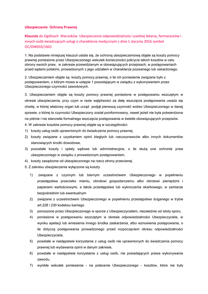 Ubezpieczenie Ochrony Prawnej Klauzula do Ogólnych Warunków Ubezpieczenia odpowiedzialności cywilnej lekarzy, farmaceutów i innych osób świadczących usługi o charakterze medycznym z dnia 1 stycznia 2016 symbol OC/OW033/1601 1. Na podstawie niniejszej klauzuli ustala się, że ochroną ubezpieczeniową objęte są koszty pomocy prawnej poniesione przez Ubezpieczonego wskutek konieczności pokrycia takich kosztów w celu obrony swoich praw, w zakresie przewidzianym w obowiązujących przepisach, w postępowaniach przed sądami polskimi, prowadzonych z jego udziałem w charakterze pozwanego lub oskarżonego. 2. Ubezpieczeniem objęte są koszty pomocy prawnej, o ile ich poniesienie związane było z postępowaniem, o którym mowa w ustępie 1 pozostającym w związku z wykonywaniem przez Ubezpieczonego czynności zawodowych. 3. Ubezpieczeniem objęte są koszty pomocy prawnej poniesione w postępowaniu wszczętym w okresie ubezpieczenia, przy czym w razie wątpliwości za datę wszczęcia postępowania uważa się chwilę, w której właściwy organ lub urząd podjął pierwszą czynność wobec Ubezpieczonego w danej sprawie, o której to czynności Ubezpieczony został poinformowany, nawet jeżeli nie była potwierdzona na piśmie i nie stanowiła formalnego wszczęcia postępowania w świetle obowiązujących przepisów. 4. W zakresie kosztów pomocy prawnej objęte są w szczególności: 1) koszty usług osób uprawnionych do świadczenia pomocy prawnej, 2) koszty związane z uzyskaniem opinii biegłych lub rzeczoznawców albo innych dokumentów stanowiących środki dowodowe, 3) pozostałe koszty i opłaty sądowe lub administracyjne, o ile służą one ochronie praw ubezpieczonego w związku z prowadzonym postępowaniem, 4) koszty zasądzone od ubezpieczonego na rzecz strony przeciwnej. 5. Z zakresu ubezpieczenia wyłączone są koszty 1) związane z czynnym lub biernym uczestnictwem Ubezpieczonego w popełnieniu przestępstwa przeciwko mieniu, obrotowi gospodarczemu albo obrotowi pieniędzmi i papierami wartościowymi, a także przestępstwa lub wykroczenia skarbowego, w zamiarze bezpośrednim lub ewentualnym 2) związane z uczestnictwem Ubezpieczonego w popełnieniu przestępstwa ściganego w trybie art.228 i 230 kodeksu karnego 3) ponoszone przez Ubezpieczonego w sporze z Ubezpieczycielem, niezależnie od istoty sporu. 4) poniesione w postępowaniu wszczętym w okresie odpowiedzialności Ubezpieczyciela, w wyniku apelacji lub wniesienia innego środka zaskarżenia, albo wznowienia postępowania, o ile dotyczą postępowania prowadzonego przed rozpoczęciem okresu odpowiedzialności Ubezpieczyciela, 5) powstałe w następstwie korzystania z usług osób nie uprawnionych do świadczenia pomocy prawnej lub wydawania opinii w danym zakresie, 6) powstałe w następstwie korzystania z usług osób, nie posiadających prawa wykonywania zawodu, 7) wynikłe wskutek poniesienia - na polecenie Ubezpieczonego - kosztów, które nie były konieczne w celu obrony praw Ubezpieczonego, albo dotyczących środków dowodowych nieistotnych z punktu widzenia przebiegu postępowania, 8) związane ze świadomym udzieleniem przez Ubezpieczonego nieprawdziwych lub wprowadzających w błąd informacji, albo dostarczeniem sfałszowanych dokumentów, 9) związane ze świadomym zatajeniem przez Ubezpieczonego informacji lub dokumentów mogących mieć wpływ na sposób świadczenia pomocy prawnej albo przebieg postępowania, 10) poniesione w postępowaniu wszczętym na wniosek krewnych lub powinowatych Ubezpieczonego, albo osób prowadzących z nim wspólne gospodarstwo domowe, a także pozostających z nim w stosunku zależności wynikającym z zatrudnienia ich przez Ubezpieczonego lub z innej podstawy, 11) poniesione w związku z korzystaniem przez Ubezpieczonego z pomocy prawnej osób przez niego zatrudnionych, o ile dana czynność mieściła się w zakresie ich obowiązków, 12) poniesione na pokrycie kar sądowych lub administracyjnych nałożonych na Ubezpieczonego albo osoby świadczące na jego rzecz pomoc prawną. 6.Wynagrodzenie adwokata lub radcy prawnego ustala się zgodnie z odpowiednimi przepisami regulującymi wysokość wynagrodzenia za czynności adwokata lub radcy prawnego w wysokości stawki minimalnej. W przypadku braku takich przepisów stosuje się przepisy stanowiące podstawę do zasądzania przez sądy kosztów zastępstwa prawnego lub obrony dla adwokata lub radcy prawnego; w przypadku braku takich unormowań stosuje się odpowiednio przepisy regulujące zasady ponoszenia przez państwo (Skarb Państwa) kosztów nieopłaconej pomocy prawnej udzielonej z urzędu. Jeżeli wysokość kosztów i wydatków prawnych nie wynika z przepisów prawnych, koszty pokrywane są w wysokości cen średnich albo uzgodnionej w pisemnym porozumieniu z Ubezpieczycielem lub zagwarantowanej na piśmie przez Ubezpieczyciela. 7. Ubezpieczony, który zamierza skorzystać z ochrony ubezpieczeniowej, zobowiązany jest: 1) niezwłocznie poinformować w drodze pisemnej Ubezpieczyciela o zaistnieniu wypadku ubezpieczeniowego i jego okolicznościach, przekazując wszelkie informacje, dokumenty, dowody i korespondencję; 2) podjąć aktywną współpracę z Ubezpieczycielem w celu wyjaśnienia wszelkich okoliczności i przyczyn postania szkody oraz ustalenia jej rozmiaru, w tym udzielać wszelkich wyjaśnień o stanie sprawy na żądanie Ubezpieczyciela. 8. Ubezpieczony zobowiązany jest dodatkowo: 1) na uzasadnione żądanie Ubezpieczyciela przed wystąpieniem na drogę postępowania sądowego przeprowadzić przedsądowe postępowanie, zmierzające do korzystnego dla Ubezpieczonego zakończenie sprawy. 2) na uzasadnione żądanie Ubezpieczyciela złożyć tylko zawezwanie do próby ugodowej albo powództwo częściowe i wstrzymać się z dochodzeniem pozostałych roszczeń do momentu uprawomocnienia się orzeczenia co do części roszczenia; 3) wstrzymać się od dochodzenia swoich roszczeń na drodze są