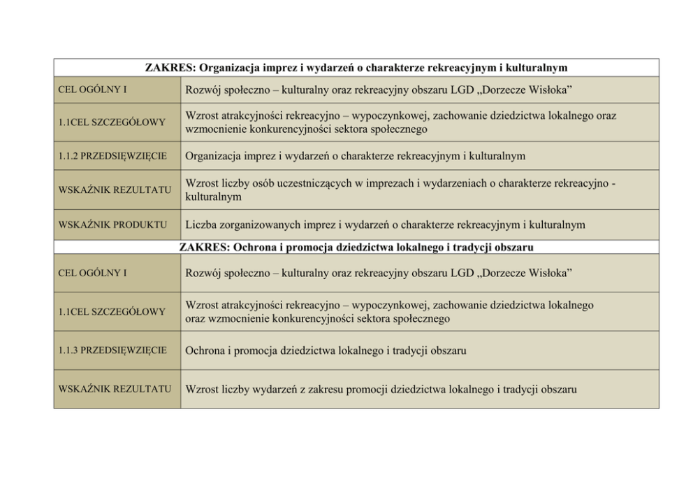 ZAKRES: Organizacja imprez i wydarzeń o charakterze rekreacyjnym i kulturalnym CEL OGÓLNY I Rozwój społeczno – kulturalny oraz rekreacyjny obszaru LGD „Dorzecze Wisłoka” 1.1CEL SZCZEGÓŁOWY Wzrost atrakcyjności rekreacyjno – wypoczynkowej, zachowanie dziedzictwa lokalnego oraz wzmocnienie konkurencyjności sektora społecznego 1.1.2 PRZEDSIĘWZIĘCIE Organizacja imprez i wydarzeń o charakterze rekreacyjnym i kulturalnym WSKAŹNIK REZULTATU Wzrost liczby osób uczestniczących w imprezach i wydarzeniach o charakterze rekreacyjno kulturalnym WSKAŹNIK PRODUKTU Liczba zorganizowanych imprez i wydarzeń o charakterze rekreacyjnym i kulturalnym ZAKRES: Ochrona i promocja dziedzictwa lokalnego i tradycji obszaru CEL OGÓLNY I Rozwój społeczno – kulturalny oraz rekreacyjny obszaru LGD „Dorzecze Wisłoka” 1.1CEL SZCZEGÓŁOWY Wzrost atrakcyjności rekreacyjno – wypoczynkowej, zachowanie dziedzictwa lokalnego oraz wzmocnienie konkurencyjności sektora społecznego 1.1.3 PRZEDSIĘWZIĘCIE Ochrona i promocja dziedzictwa lokalnego i tradycji obszaru WSKAŹNIK REZULTATU Wzrost liczby wydarzeń z zakresu promocji dziedzictwa lokalnego i tradycji obszaru WSKAŹNIK PRODUKTU Liczba podmiotów działających w sferze kultury, które otrzymały wsparcie w ramach realizacji LSR ZAKRES: Wsparcie rozwoju kapitału społecznego oraz wzrost potencjału organizacyjnego sektora pozarządowego CEL OGÓLNY I Rozwój społeczno – kulturalny oraz rekreacyjny obszaru LGD „Dorzecze Wisłoka” 1.1CEL SZCZEGÓŁOWY Wzrost atrakcyjności rekreacyjno -wypoczynkowej, zachowanie dziedzictwa lokalnego oraz wzmocnienie konkurencyjności sektora społecznego 1.1.5 PRZEDSIĘWZIĘCIE Wsparcie rozwoju kapitału społecznego oraz wzrost potencjału organizacyjnego sektora pozarządowego WSKAŹNIK REZULTATU Liczba osób przeszkolonych, w tym liczba osób z grup defaworyzowanych objętych ww. wsparciem WSKAŹNIK PRODUKTU Liczba szkoleń ZAKRES: Promocja produktów i usług turystycznych obszaru LGD CEL OGÓLNY III Rozwój turystyczny obszaru LGD „Dorzecze Wisłoka” 3.1 CEL SZCZEGÓŁOWY Wzrost atrakcyjności turystycznej obszaru LGD oraz ochrona środowiska naturalnego i zapobieganie zmianom klimatycznym 3.1.1 PRZEDSIĘWZIĘCIE Promocja produktów i usług turystycznych obszaru LGD WSKAŹNIK REZULTATU Liczba osób uzyskujących wiedzę nt. obszaru LGD WSKAŹNIK PRODUKTU Liczba działań promocyjnych ZAKRES: Budowa, przebudowa ogólnodostępnej infrastruktury turystycznej CEL OGÓLNY III Rozwój turystyczny obszaru LGD „Dorzecze Wisłoka” 3.1 CEL SZCZEGÓŁOWY Wzrost atrakcyjności turystycznej obszaru LGD oraz ochrona środowiska naturalnego i zapobieganie zmianom klimatycznym 3.1.2 PRZEDSIĘWZIĘCIE Budowa, przebudowa ogólnodostępnej infrastruktury turystycznej WSKAŹNIK REZULTATU WSKAŹNIK PRODUKTU Wzrost liczby osób korzystających z nowych/zmodernizowanych obiektów infrastruktury turystycznej Liczba nowych, zmodernizowanych obiektów infrastruktury turystycznej ZAKRES: Wsparcie podmiotów zajmujących się działalnością turystyczną i okołoturystyczną CEL OGÓLNY III Rozwój turystyczny obszaru LGD „Dorzecze Wisłoka” 3.1 CEL SZCZEGÓŁOWY Wzrost atrakcyjności turystycznej obszaru LGD oraz ochrona środowiska naturalnego i zapobieganie zmianom klimatycznym 3.1.3 PRZEDSIĘWZIĘCIE Wsparcie podmiotów zajmujących się działalnością turystyczną i okołoturystyczną WSKAŹNIK REZULTATU Wzrost liczby osób korzystających z nowych/zmodernizowanych obiektów infrastruktury turystycznej WSKAŹNIK PRODUKTU Liczba nowych, zmodernizowanych obiektów turystycznych i okołoturystycznych ZAKRES: Organizacja działań służących ochronie środowiska i zapobieganiu zmianom klimatu CEL OGÓLNY III Rozwój turystyczny obszaru LGD „Dorzecze Wisłoka” 3.1 CEL SZCZEGÓŁOWY Wzrost atrakcyjności turystycznej obszaru LGD oraz ochrona środowiska naturalnego i zapobieganie zmianom klimatycznym 3.1.4 PRZEDSIĘWZIĘCIE Organizacja działań służących ochronie środowiska i zapobieganiu zmianom klimatu WSKAŹNIK REZULTATU Liczba osób, które wzięły udział w działaniach z zakresu ochrony środowiska i zmian klimatu WSKAŹNIK PRODUKTU Liczba działań z zakresu ochrony środowiska i zmian klimatu