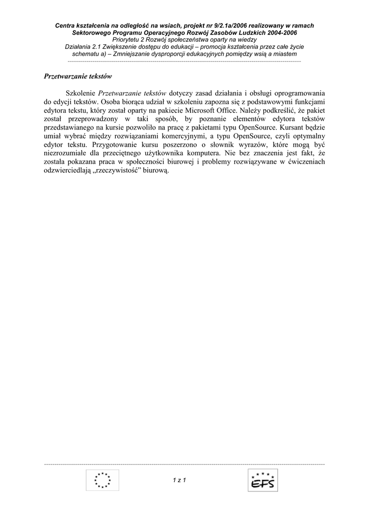 Centra kształcenia na odległość na wsiach, projekt nr 9/2.1a/2006 realizowany w ramach Sektorowego Programu Operacyjnego Rozwój Zasobów Ludzkich 2004-2006 Priorytetu 2 Rozwój społeczeństwa oparty na wiedzy Działania 2.1 Zwiększenie dostępu do edukacji – promocja kształcenia przez całe Ŝycie schematu a) – Zmniejszanie dysproporcji edukacyjnych pomiędzy wsią a miastem ----------------------------------------------------------------------------------------------------------------- Przetwarzanie tekstów Szkolenie Przetwarzanie tekstów dotyczy zasad działania i obsługi oprogramowania do edycji tekstów. Osoba biorąca udział w szkoleniu zapozna się z podstawowymi funkcjami edytora tekstu, który został oparty na pakiecie Microsoft Office. NaleŜy podkreślić, Ŝe pakiet został przeprowadzony w taki sposób, by poznanie elementów edytora tekstów przedstawianego na kursie pozwoliło na pracę z pakietami typu OpenSource. Kursant będzie umiał wybrać między rozwiązaniami komercyjnymi, a typu OpenSource, czyli optymalny edytor tekstu. Przygotowanie kursu poszerzono o słownik wyrazów, które mogą być niezrozumiałe dla przeciętnego uŜytkownika komputera. Nie bez znaczenia jest fakt, Ŝe została pokazana praca w społeczności biurowej i problemy rozwiązywane w ćwiczeniach odzwierciedlają „rzeczywistość” biurową. ---------------------------------------------------------------------------------------------------------------------------------------1z1