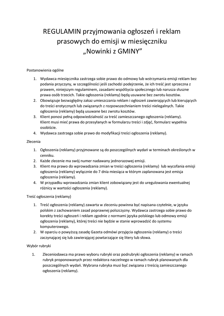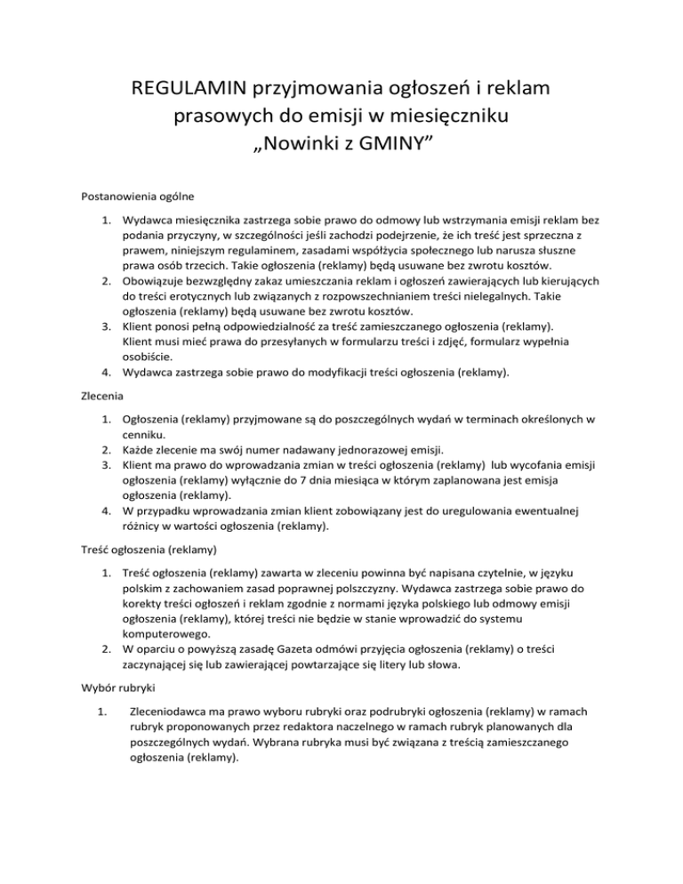 REGULAMIN przyjmowania ogłoszeń i reklam prasowych do emisji w miesięczniku „Nowinki z GMINY” Postanowienia ogólne 1. Wydawca miesięcznika zastrzega sobie prawo do odmowy lub wstrzymania emisji reklam bez podania przyczyny, w szczególności jeśli zachodzi podejrzenie, że ich treść jest sprzeczna z prawem, niniejszym regulaminem, zasadami współżycia społecznego lub narusza słuszne prawa osób trzecich. Takie ogłoszenia (reklamy) będą usuwane bez zwrotu kosztów. 2. Obowiązuje bezwzględny zakaz umieszczania reklam i ogłoszeń zawierających lub kierujących do treści erotycznych lub związanych z rozpowszechnianiem treści nielegalnych. Takie ogłoszenia (reklamy) będą usuwane bez zwrotu kosztów. 3. Klient ponosi pełną odpowiedzialność za treść zamieszczanego ogłoszenia (reklamy). Klient musi mieć prawa do przesyłanych w formularzu treści i zdjęć, formularz wypełnia osobiście. 4. Wydawca zastrzega sobie prawo do modyfikacji treści ogłoszenia (reklamy). Zlecenia 1. Ogłoszenia (reklamy) przyjmowane są do poszczególnych wydań w terminach określonych w cenniku. 2. Każde zlecenie ma swój numer nadawany jednorazowej emisji. 3. Klient ma prawo do wprowadzania zmian w treści ogłoszenia (reklamy) lub wycofania emisji ogłoszenia (reklamy) wyłącznie do 7 dnia miesiąca w którym zaplanowana jest emisja ogłoszenia (reklamy). 4. W przypadku wprowadzania zmian klient zobowiązany jest do uregulowania ewentualnej różnicy w wartości ogłoszenia (reklamy). Treść ogłoszenia (reklamy) 1. Treść ogłoszenia (reklamy) zawarta w zleceniu powinna być napisana czytelnie, w języku polskim z zachowaniem zasad poprawnej polszczyzny. Wydawca zastrzega sobie prawo do korekty treści ogłoszeń i reklam zgodnie z normami języka polskiego lub odmowy emisji ogłoszenia (reklamy), której treści nie będzie w stanie wprowadzić do systemu komputerowego. 2. W oparciu o powyższą zasadę Gazeta odmówi przyjęcia ogłoszenia (reklamy) o treści zaczynającej się lub zawierającej powtarzające się litery lub słowa. Wybór rubryki 1. Zleceniodawca ma prawo wyboru rubryki oraz podrubryki ogłoszenia (reklamy) w ramach rubryk proponowanych przez redaktora naczelnego w ramach rubryk planowanych dla poszczególnych wydań. Wybrana rubryka musi być związana z treścią zamieszczanego ogłoszenia (reklamy). 2. Jeśli treść ogłoszenia nie jest adekwatna do wybranej przez Zleceniodawcę rubryki, redaktor naczelny ma prawo do jej zmiany. W przypadku braku porozumienia Wydawca ma prawo do odmowy emisji ogłoszenia (reklamy). Kolejność emisji ogłoszeń (reklam) 1. Ogłoszenia (reklamy) ukazują się w miesięczniku w rubrykach i podrubrykach w kolejności ustalonej przez redaktora naczelnego. Sortowanie ogłoszeń następuje do poszczególnych wydań według daty przyjęcia ogłoszenia (reklamy) lub w kolejności alfabetycznej. Wydawca zastrzega sobie prawo do przyjęcia innego niż powyższy systemu sortowania ogłoszeń (reklam). 2. Zleceniodawca nie może ingerować w kolejność publikacji ogłoszeń (reklam). Płatności 1. Należność za ogłoszenia naliczana jest w oparciu o cennik obowiązujący w dniu składania zamówienia. 2. Zleceniodawca za zamówione ogłoszenie płaci przelewem na konto Wydawcy. 3. Zlecenie jest realizowane po wpłynięciu zapłaty na konto Wydawcy lub po uznaniu przez redaktora naczelnego przedstawionego przez Zleceniodawcę potwierdzenie dokonania przelewu. 4. W przypadku firm Wydawca może stosować inny sposób naliczenia ceny i terminu płatności. Reklamacje 1. Reklamacje rozpatrywane są zgodnie z zasadami ogólnymi. 2. Reklamacji nie podlega kolejność, w jakiej zostały umieszczone ogłoszenia (reklamy) w rubrykach lub podrubrykach. Wyjątkiem jest sytuacja gdy klient wykupił konkretne miejsce umieszczenia reklamy. 3. Reklamacji nie podlega treść ogłoszenia (reklamy), wybór rubryki ani terminy emisji jeśli były one zgodne ze złożonym zleceniem lub klient zaakceptował je swoim podpisem na fakturze. Inne postanowienia 1. Regulamin wchodzi w życie z dniem 12 marca 2015 roku. 2. Regulamin dostępny jest w siedzibie Wydawcy, a także na stronie www.gminanowinka.pl 3. Wydawca ma prawo do wprowadzenia zmian w regulaminie. Zmiany wchodzą w życie od dnia opublikowania ich na stronie www.gminanowinka.pl i dotyczą ogłoszeń (reklam) zlecanych od dnia publikacji.