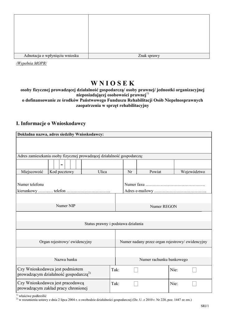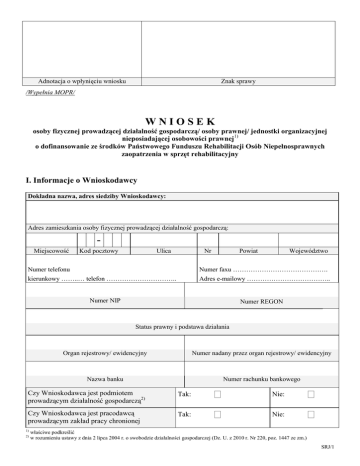 Adnotacja o wpłynięciu wniosku Znak sprawy /Wypełnia MOPR/ WNIOSEK osoby fizycznej prowadzącej działalność gospodarczą/ osoby prawnej/ jednostki organizacyjnej nieposiadającej osobowości prawnej1) o dofinansowanie ze środków Państwowego Funduszu Rehabilitacji Osób Niepełnosprawnych zaopatrzenia w sprzęt rehabilitacyjny I. Informacje o Wnioskodawcy Dokładna nazwa, adres siedziby Wnioskodawcy: Adres zamieszkania osoby fizycznej prowadzącej działalność gospodarczą: Miejscowość Kod pocztowy Ulica Nr Powiat Województwo Numer telefonu Numer faxu ……………………………………. kierunkowy ……..… telefon ………………………….. Adres e-mailowy ……………………………….. Numer NIP Numer REGON Status prawny i podstawa działania Organ rejestrowy/ ewidencyjny Numer nadany przez organ rejestrowy/ ewidencyjny Nazwa banku Numer rachunku bankowego Czy Wnioskodawca jest podmiotem prowadzącym działalność gospodarczą2) Tak: Nie: Czy Wnioskodawca jest pracodawcą prowadzącym zakład pracy chronionej Tak: Nie: 1) 2) właściwe podkreślić w rozumieniu ustawy z dnia 2 lipca 2004 r. o swobodzie działalności gospodarczej (Dz. U. z 2010 r. Nr 220, poz. 1447 ze zm.) SRJ/1 Dane osoby/osób upoważnionej/ych do reprezentowania Wnioskodawcy w sprawie: Imię i nazwisko Adres zamieszkania Nr ewid. PESEL Informacja o zaległościach wobec PFRON: Czy Wnioskodawca ma zaległości wobec Państwowego Funduszu Rehabilitacji Osób Niepełnosprawnych Tak: Nie: Tak: Nie: Informacje o korzystaniu ze środków PFRON: Czy Wnioskodawca korzystał ze środków Państwowego Funduszu Rehabilitacji Osób Niepełnosprawnych Podmiot udzielający Numer umowy dofinansowania SRJ/2 Kwota przyznanych środków Cel przyznania dofinansowania Stan rozliczenia Data przyznania dofinansowania Czy Wnioskodawca był, w ciągu trzech lat przed złożeniem wniosku, stroną umowy o dofinansowanie ze środków Państwowego Funduszu Rehabilitacji Osób Niepełnosprawnych, rozwiązanej z przyczyn leżących po stronie Wnioskodawcy Tak: Nie: Jeśli tak to należy podać numer i datę zawarcia umowy: ……………………………………………………………………………………………………………. II. Informacje o przedmiocie wniosku Przedmiot dofinansowania (nazwa sprzętu rehabilitacyjnego): Termin rozpoczęcia i przewidywany czas realizacji zadania: ……………………………………………………………………………………………………………………... Miejsce realizacji zadania (użytkowania sprzętu rehabilitacyjnego): ……………………………………………………………………………………………………………………… ……………………………………………………………………………………………………………………… Cel dofinansowania: SRJ/3 Przewidywany koszt realizacji zadania (całkowity koszt sprzętu rehabilitacyjnego): ……………………………. zł 1. Deklarowane środki własne ogółem: 2. Inne źródła finansowania ogółem: ……………….. zł ……………….. zł z tego: a) b) c) 3. Wysokość kwoty wnioskowanego dofinansowania ze środków PFRON: ……………………………. zł 4. Ogólna wartość nakładów dotychczas poniesionych przez Wnioskodawcę na realizację zadania do końca miesiąca poprzedzającego miesiąc, w którym składany jest wniosek: …………………………………. zł (słownie złotych: .....................................................................................................................................................) Dotychczasowe źródła finansowania nakładów poniesionych przez Wnioskodawcę na przedsięwzięcie i ich wysokość: a) ………………………………………………………………………………………………………………….. b) ………………………………………………………………………………………………………………….. c) ………………………………………………………………………………………………………………….. Przewidywane efekty realizacji zadania dla osób niepełnosprawnych: Informacje uzupełniające o przedmiocie dofinansowania: 1. Wnioskodawca, świadomy odpowiedzialności karnej za składanie fałszywych zeznań, wynikającej z art. 233 § 1 ustawy z dnia 6 czerwca 1997 r. Kodeks karny (Dz. U. Nr 88, poz. 553 ze zm.) oświadcza, że dane zawarte we wniosku podane zostały zgodnie z prawdą. 2. O wszelkich zmianach zaistniałych po złożeniu wniosku Wnioskodawca zobowiązuje się poinformować Miejski Ośrodek Pomocy Rodzinie w Białymstoku niezwłocznie, nie później niż w terminie 7 dni od ich wystąpienia. SRJ/4 Pouczenie: 1. We wniosku należy wypełnić wszystkie rubryki, ewentualnie wpisać „Nie dotyczy”. W przypadku, gdy w formularzu wniosku przewidziano zbyt mało miejsca należy w odpowiedniej rubryce wpisać „W załączeniu - załącznik nr ..........” czytelnie i jednoznacznie przypisując numer załącznika do rubryki formularza, której dotyczy. Załączniki powinny zostać sporządzone w układzie przewidzianym dla odpowiednich rubryk formularza. 2. Wysokość dofinansowania zaopatrzenia w sprzęt rehabilitacyjny wynosi do 60% kosztów tego sprzętu, nie więcej jednak niż do wysokości pięciokrotnego przeciętnego wynagrodzenia. 3. Wniosek osoby fizycznej prowadzącej działalność gospodarczą/ osoby prawnej/ jednostki organizacyjnej nieposiadającej osobowości prawnej o dofinansowanie ze środków PFRON zaopatrzenia w sprzęt rehabilitacyjny składa się w terminie do dnia 30 listopada roku poprzedzającego realizację zadań do powiatowego centrum pomocy rodzinie właściwego dla siedziby albo miejsca prowadzenia działalności. 4. Dofinansowanie ze środków PFRON nie przysługuje, jeżeli podmiot ubiegając