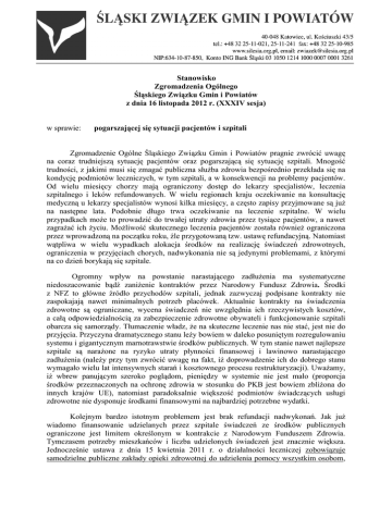 Stanowisko Zgromadzenia Ogólnego Śląskiego Związku Gmin i Powiatów z dnia 16 listopada 2012 r. (XXXIV sesja) w sprawie: pogarszającej się sytuacji pacjentów i szpitali Zgromadzenie Ogólne Śląskiego Związku Gmin i Powiatów pragnie zwrócić uwagę na coraz trudniejszą sytuację pacjentów oraz pogarszającą się sytuację szpitali. Mnogość trudności, z jakimi musi się zmagać publiczna słuŜba zdrowia bezpośrednio przekłada się na kondycję podmiotów leczniczych, w tym szpitali, a w konsekwencji na problemy pacjentów. Od wielu miesięcy chorzy mają ograniczony dostęp do lekarzy specjalistów, leczenia szpitalnego i leków refundowanych. W wielu regionach kraju oczekiwanie na konsultację medyczną u lekarzy specjalistów wynosi kilka miesięcy, a często zapisy przyjmowane są juŜ na następne lata. Podobnie długo trwa oczekiwanie na leczenie szpitalne. W wielu przypadkach moŜe to prowadzić do trwałej utraty zdrowia przez tysiące pacjentów, a nawet zagraŜać ich Ŝyciu. MoŜliwość skutecznego leczenia pacjentów została równieŜ ograniczona przez wprowadzoną na początku roku, źle przygotowaną tzw. ustawę refundacyjną. Natomiast wątpliwa w wielu wypadkach alokacja środków na realizację świadczeń zdrowotnych, ograniczenia w przyjęciach chorych, nadwykonania nie są jedynymi problemami, z którymi na co dzień borykają się szpitale. Ogromny wpływ na powstanie narastającego zadłuŜenia ma systematyczne niedoszacowanie bądź zaniŜenie kontraktów przez Narodowy Fundusz Zdrowia. Środki z NFZ to główne źródło przychodów szpitali, jednak zazwyczaj podpisane kontrakty nie zaspokajają nawet minimalnych potrzeb placówek. Aktualnie kontrakty na świadczenia zdrowotne są ograniczane, wycena świadczeń nie uwzględnia ich rzeczywistych kosztów, a całą odpowiedzialnością za zabezpieczenie zdrowotne obywateli i funkcjonowanie szpitali obarcza się samorządy. Tłumaczenie władz, Ŝe na skuteczne leczenie nas nie stać, jest nie do przyjęcia. Przyczyna dramatycznego stanu leŜy bowiem w daleko posuniętym rozregulowaniu systemu i gigantycznym marnotrawstwie środków publicznych. W tym stanie nawet najlepsze szpitale są naraŜone na ryzyko utraty płynności finansowej i lawinowo narastającego zadłuŜenia (naleŜy przy tym zwrócić uwagę na fakt, iŜ doprowadzenie ich do dobrego stanu wymagało wielu lat intensywnych starań i kosztownego procesu restrukturyzacji). UwaŜamy, iŜ wbrew panującym szeroko poglądom, pieniędzy w systemie nie jest mało (proporcja środków przeznaczonych na ochronę zdrowia w stosunku do PKB jest bowiem zbliŜona do innych krajów UE), natomiast paradoksalnie większość podmiotów świadczących usługi zdrowotne nie dysponuje środkami finansowymi na najbardziej potrzebne wydatki. Kolejnym bardzo istotnym problemem jest brak refundacji nadwykonań. Jak juŜ wiadomo finansowanie udzielanych przez szpitale świadczeń ze środków publicznych ograniczone jest limitem określonym w kontrakcie z Narodowym Funduszem Zdrowia. Tymczasem potrzeby mieszkańców i liczba udzielonych świadczeń jest znacznie większa. Jednocześnie ustawa z dnia 15 kwietnia 2011 r. o działalności leczniczej zobowiązuje samodzielne publiczne zakłady opieki zdrowotnej do udzielenia pomocy wszystkim osobom, których Ŝycie i zdrowie jest zagroŜone. Fundusz nie chce pokrywać tych kosztów w całości, bo kwestionuje zasadność ich duŜej części. Szpital moŜe domagać się zwrotu pieniędzy za nadwykonania tylko wtedy, gdy dotyczyły one przyjęć w tzw. stanach nagłych, ratujących Ŝycie lub zdrowie pacjenta. Tymczasem NFZ twierdzi, Ŝe większość nadwykonań nie dotyczy tego typu sytuacji, tylko tzw. przyjęć planowych, czyli takich, które moŜna przesunąć w czasie. Ponadto zasady udzielania kontraktów doprowadziły do zadziwiających dysproporcji w wysokościach finansowania poszczególnych zakresów świadczeń w rodzaju leczenie szpitalne w poszczególnych regionach województwa śląskiego, jak równieŜ pomiędzy województwami. Szczególnie dotyczy to świadczeń limitowanych (w zakresie hospitalizacji chorób wewnętrznych, chirurgii ogólnej, neurologii, czy ortopedii). Problem niezapłaconych nadwykonań dotyczy większości limitowanych świadczeń, a sam fakt występowania nadlimitów przy ograniczanym dostępie do świadczeń, obrazuje rzeczywiste potrzeby zabezpieczenia zdrowotnego lokalnej społeczności, co niestety nie jest uwzględniane przez NFZ przy udzielaniu kontraktów. śadne przedsiębiorstwo nie jest w stanie funkcjonować przy coraz mniejszych dochodach i rosnących kosztach, a szpital nie moŜe odmówić udzielenia świadczenia zdrowotnego w sytuacji zagroŜenia zdrowia i Ŝycia. Niedostatecznie wycenione procedury w szpitalach wielospecjalistycznych powodują, Ŝe straty szpitali są coraz większe, a placówki tracą płynność finansową i w bardzo szybkim tempie zadłuŜają się. Sytuacja finansowa szpitali pogarsza się znacząco poprzez narastające zobowiązania. Wzrosły najdotkliwiej odczuwane przez szpitale zobowiązania wymagalne, czyli takie, dla których termin płatności juŜ minął. Publiczne zakłady opieki zdrowotnej nie mają środków finansowych na uregulowanie zobowiązań (co progresywnie, chociaŜby ze względu na ustawowe odsetki karne, pogarsza i tak ich złą sytuację finansową). Istotnym czynnikiem narastania zobowiązań wymagalnych jest często wyczerpanie moŜliwości negocjacji ze stałymi kontrahentami szpitali. NaleŜy tutaj zwrócić uwagę, Ŝe zmniejszenie elastyczności kontrahentów spowodowane jest najprawdopodobniej pogorszeniem się koniunktury we wszystkich obszarach gospodarki, a więc takŜe w sektorach funkcjonowania wierzycieli szpitali. Nowa ustawa o działalności leczniczej, która weszła w Ŝycie z dniem 1 lipca 2011 r. w znaczący sposób ograniczyła moŜliwość szpitali m.in. w zakresie zarządzania długiem. Szpit
