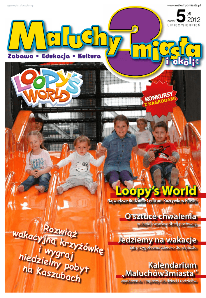 egzemplarz bezpłatny www.maluchy3miasta.pl 5 (9) 2012 numer LIPIEC/SIERPIEŃ Zabawa • Edukacja • Kultura Loopy’s World Największe Rodzinne Centrum Rozrywki w Polsce Rozwi ą yjną k ż rzyżó wkę i wygr aj niedzi elny p obyt na Ka szuba ch wakac O sztuce chwalenia pułapki i szanse dobrej pochwały Jedziemy na wakacje jak przygotować dziecko do wyjazdu Kalendarium „Maluchów3miasta” wydarzenia i imprezy dla dzieci i rodziców Witamy! BamBam Cafe – tu miło spędzisz czas Zaczęło się, zawitały utęsknione wakacje. Te najpiękniejsze miesiące w roku, wolne od obowiązków szkolnych i przepełnione upalnymi dniami pełnymi pomysłów na zabawy, szaleństwa i wycieczki. Zajmujemy się organizacją urodzin, imprez, wymyślamy dla Was konkursy fotograficzne, spotkania z ciekawymi ludźmi i projekcje filmowe. Na wszystkich czeka darmowy plac zabaw. W swoją prace wkładamy serce, dlatego możecie oczekiwać, że u nas zawsze spotkacie się z uśmiechem i życzliwością. BamBam Cafe ul. Szeroka 97, Gdańsk tel. 798 720 280, 515 696 842 e-mail: [email protected] Masz ochotę na kawę, a nie masz z kim zostawić dziecka? Przyjdź do nas! To nie jest zwykła kawiarnia. To miejsce dla rodziców i dzieci, specjalnie przystosowane do wspólnego spędzania czasu. Oprócz podstawowego menu mamy propozycje dla alergików i bezglutenowców, u nas dostaniesz dania bezmleczne, a także mleko sojowe. Uwaga! Każda osoba, która przyjdzie do BamBam Cafe z gazetką „Maluchy3miasta” dostanie 20% zniżki na kawę i ciasto. Pieniądze uzyskane w ten sposób zostaną przekazane na odremontowanie domu Kacpra – o tym informacja poniżej. Tak naprawdę lato to czas spełniania marzeń, oczekiwany okres wyjazdów na kolonie, półkolonie, biwaki. To także doskonała chwila na oderwanie się od zgiełku dnia codziennego i przeżycie niezapomnianych chwil z rodziną. Wkradając się do Waszego życia lekturą „Maluchy 3miasta i okolice”, chcemy Wam pomóc w odnalezieniu miejsc wartych uwagi. Chcemy przybliżyć temat sportu, uzasadnić, dlaczego warto go uprawiać, jaki ma wpływ na nasze zdrowie i dlaczego według wielokrotnego mistrza Polski w kulturystyce obok szczęścia i miłości jest najważniejszą wartością w życiu człowieka. Mamy też kilka propozycji wakacyjnych książek. Pomogą Wam one przenieść się w wybrane miejsce na ziemi, rozbudzą wyobraźnię; dzięki nim lato będzie jeszcze bardziej fascynujące. Pamiętajmy jednak o bezpieczeństwie podczas zabaw w wakacyjne dni, o rozsądku w podejmowaniu decyzji, o ubezpieczeniu się od nieszczęścia. Cieszymy się, że możemy uszczęśliwić dzieci nagrodami z konkursów znajdujących się w numerze wakacyjnym „Maluchów”. Rodziny zapraszamy na wycieczki po trójmiejskich miejscach poleconych przez przewodniczkę Ewę Kowalską. Życzymy Wam niezapomnianych wrażeń i mamy nadzieję, że po wakacyjnej przerwie podzielicie się z nami najpiękniejszymi wrażeniami z przechadzek po lecie. Loopy’s World – najlepsza zabawa w wakacje ................................... 4 O sztuce chwalenia – pułapki i szanse dobrej pochwały ........................ 6 Dziecko miesiąca – konkurs ................................................................... 8 Kalendarium – najciekawsze wydarzenia.......................................... 10 Kiedy pada deszcz .................................................................................. 12 Nie ryzykuj – ubezpiecz się ......................................................................... 13 Sport rekreacyjny a Twoje dziecko ........................................................... 14 Wakacyjne menu na talerzu ............................................................. 16 Polecane książki na wakacje ............................................................ 18 Kolabusy ............................................................................................................ 19 KONKURSY na stronach: 7, 8, 18, 19 WYDAWCA i REDAKCJA: DASKO MEDIA e-mail: [email protected] tel. kom. 506 104 536, www.maluchy3miasta.pl SKŁAD: GRAFIKO, ul. Jaśkowa Dolina 31, 80-286 Gdańsk, tel. 58 341 88 45 PROMOCJA: Grupa KOMBINAT, ul. Jaśkowa Dolina 6/3, 80-252 Gdańsk, e-mail: [email protected], www.grupakombinat.pl FOTOGRAF: Justyna Chrzanowska, e-mail: [email protected], www.fotografia-chrzanowska.pl, tel. 668 30 30 25 Redakcja nie zwraca nie zamówionych tekstów i materiałów redakcyjnych oraz nie ponosi odpowiedzialności za treść nadesłanych materiałów reklamowych. Artykuł sponsorowany Pozdrawiam Małgorzata Tysarczyk-Darska Maluchy3miasta i okolic Co w numerze I Ty możesz pomóc odnowić dom Kacper Słomiński od września pójdzie do trzeciej klasy. Jednak w tym roku dla jego rodziców problemem nie będzie zakup szkolnej wyprawki. Tej rodzinie spalił się dom. Jak to zwykle bywa nieszczęścia chodzą parami, a czasem i trójkami. Babcia Kacpra jest osobą unieruchomioną w łóżku, na rencie inwalidzkiej; mama chłopca czeka na kolejny przeszczep nerki (pierwszy się nie udał). Jedynym żywicielem rodziny jest tata Kacpra. Rodzina nie ma pieniędzy na samodzielną odbudowę domu i powrót do normalnego życia. Rodzina Słomińskich sąsiaduje z domem Małgorzaty Górskiej z BamBam Cafe i to ona wyszła z inicjatywą pomocy sąsiadom. Razem z naszą gazetą organizuje zbiórkę rzeczy niezbędnych do odbudowania nowego życia pogorzelców. Potrzebne jest wszystko: materiały budowlane, farby, meble, pościel, ręczniki. Liczy się każdy grosz. Jeśli możesz i chcesz pomóc odbudować Słomińskim dom, skontaktuj się w tej sprawie z: – Małgorzatą Górską, znajdziesz ją w BamBam Cafe; – naszą redakcją pod adresem [email protected] – bezpośrednio pod numerem telefonu Słomińskich: 601 436 105. Pieniądze dla Słomińskich zbiera także parafia pw. św. Stanisława Kostki w Gdańsku, pieniądze można również wpłacać bezpośrednio na