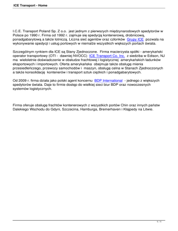 ICE Transport - Home I.C.E. Transport Poland Sp. Z o.o. jest jednym z pierwszych międzynarodowych spedytorów w Polsce po 1990 r. Firma od 1992 r. zajmuje się spedycją kontenerową, drobnicową, ponadgabarytową a także lotniczą. Liczna sieć agentów oraz członków Grupy ICE pozwala na wykonywanie spedycji i usług portowych w niemalże wszystkich większych portach świata. Szczególnym rynkiem dla ICE są Stany Zjednoczone. Firma macierzysta spółki - amerykański operator transportowy (OTI - dawniej NVOCC) ICE Transport Co. Inc. z siedziba w Edison, NJ ma wieloletnie doświadczenie w obsłudze frachtowej i logistycznej amerykańskich ładunków eksportowych i importowych. Oferta amerykańska obejmuje także obsługę mienia przesiedleńczego, przewozy samochodów i maszyn, obsługę celna w Stanach Zjednoczonych a także konsolidację kontenerów i transport sztuk ciężkich i ponadgabarytowych. Od 2009 r. firma działa jako polski agent koncernu BDP International - jednego z większych spedytorów świata. Daje to firmie dostęp do wielkiej sieci biur BDP oraz nowoczesnych systemów logistycznych. Firma oferuje obsługę frachtów kontenerowych z wszystkich portów Chin oraz innych państw Dalekiego Wschodu do Gdyni, Szczecina, Hamburga, Bremerhaven i Kłajpedy na Litwie. 1/1