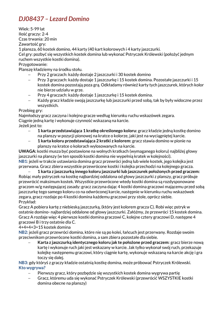 DJ08437 – Lezard Domino Wiek: 5-99 lat Ilość graczy: 2-4 Czas trwania: 20 min Zawartość gry: 1 plansza, 60 kostek domino, 44 karty (40 kart kolorowych i 4 karty jaszczurki. Cel gry: pozbyć się wszystkich kostek domina lub wykonać Pstryczek Królewski (położyć jednym ruchem wszystkie kostki domina). Przygotowanie: Planszę kładziemy na środku stołu. Przy 2 graczach: każdy dostaje 2 jaszczurki i 30 kostek domino Przy 3 graczach: każdy dostaje 1 jaszczurkę i 15 kostek domina. Pozostałe jaszczurki i 15 kostek domina pozostają poza grą. Odkładamy również karty tych jaszczurek, których kolor nie bierze udziału w grze. Przy 4 graczach: każdy dostaje 1 jaszczurkę i 15 kostek domina. Każdy gracz kładzie swoją jaszczurkę lub jaszczurki przed sobą, tak by były widoczne przez wszystkich. Przebieg gry: Najmłodszy gracz zaczyna i kolejno gracze według kierunku ruchu wskazówek zegara. Ciągnie jedną kartę i wykonuje czynność wskazaną na karcie. Jeżeli jest to: 1 karta przedstawiająca 1 kratkę określonego koloru: gracz kładzie jedną kostkę domino na planszy w pozycji pionowej na kratce o kolorze, jaki jest na wyciągniętej karcie. 1 karta koloru przedstawiająca 2 kratki z kolorem: gracz stawia domino w pionie na planszy na kratce o kolorach wylosowanych na karcie. UWAGA: kostki musza być postawione na wolnych kratkach (wymaganego koloru) najbliżej głowy jaszczurki na planszy (w ten sposób kostki domina nie wypełnią kratek w kolejności). NB1: jeżeli w trakcie ustawiania domina gracz przewróci jedną lub wiele kostek, jego kolejka jest przerwana. Gracz zbiera wszystkie przewrócone kostki i kolejka przechodzi na kolejnego gracza. 1 karta z jaszczurką innego koloru jaszczurki lub jaszczurek położonych przed graczem: Robiąc mały pstryczek na kostkę najbardziej oddalona od głowy jaszczurki z planszy, gracz próbuje przewrócić maksimum kostek. Wszystkie przewrócone wtedy kostki domina są rozdysponowane graczom w/g następującej zasady: gracz zaczyna dając 4 kostki domina graczowi mającemu przed sobą jaszczurkę tego samego koloru co na odwróconej karcie, następnie w kierunku ruchu wskazówek zegara, gracz rozdaje po 4 kostki domina każdemu graczowi przy stole, oprócz siebie. Przykład: Gracz A pobiera kartę z niebieską jaszczurką, (który jest kolorem gracza C). Robi więc pstryk w ostatnie domino- najbardziej oddalone od głowy jaszczurki. Załóżmy, że przewróci 15 kostek domina. Gracz A rozdaje więc 4 pierwsze kostki domina graczowi C, kolejne cztery graczowi D, następne 4 graczowi B i trzy ostatnie dla C. 4+4+4+3=15 kostek domina NB2: jeżeli gracz przewróci domina, które nie są po kolei, łańcuch jest przerwany. Rozdaje swoim przeciwnikom przewrócone kostki domina, a sam zbiera pozostałe dla siebie. Karta z jaszczurką identycznego koloru jak te położone przed graczem: gracz bierze nową kartę i wykonuje ruch jaki jest wskazany w karcie. Jak tylko wykonał swój ruch, przekazuje kolejkę następnemu graczowi, który ciągnie kartę, wykonuje wskazaną na karcie akcję i gra toczy się dalej. NB3: gdy któryś z graczy kładzie ostatnią kostkę domina, może próbować Pstryczek Królewski. Kto wygrywa? Pierwszy gracz, który pozbędzie się wszystkich kostek domina wygrywa partię Gracz, któremu uda się wykonać Pstryczek Królewski (przewrócić WSZYSTKIE kostki domina obecne na planszy)