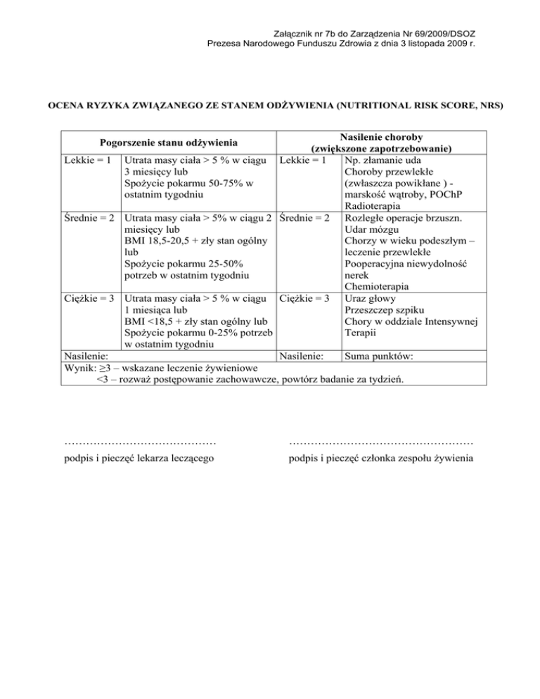 Załącznik nr 7b do Zarządzenia Nr 69/2009/DSOZ Prezesa Narodowego Funduszu Zdrowia z dnia 3 listopada 2009 r. OCENA RYZYKA ZWIĄZANEGO ZE STANEM ODŻYWIENIA (NUTRITIONAL RISK SCORE, NRS) Nasilenie choroby (zwiększone zapotrzebowanie) Lekkie = 1 Utrata masy ciała > 5 % w ciągu Lekkie = 1 Np. złamanie uda 3 miesięcy lub Choroby przewlekłe Spożycie pokarmu 50-75% w (zwłaszcza powikłane ) ostatnim tygodniu marskość wątroby, POChP Radioterapia Średnie = 2 Utrata masy ciała > 5% w ciągu 2 Średnie = 2 Rozległe operacje brzuszn. miesięcy lub Udar mózgu BMI 18,5-20,5 + zły stan ogólny Chorzy w wieku podeszłym – lub leczenie przewlekłe Spożycie pokarmu 25-50% Pooperacyjna niewydolność potrzeb w ostatnim tygodniu nerek Chemioterapia Ciężkie = 3 Utrata masy ciała > 5 % w ciągu Ciężkie = 3 Uraz głowy 1 miesiąca lub Przeszczep szpiku BMI <18,5 + zły stan ogólny lub Chory w oddziale Intensywnej Spożycie pokarmu 0-25% potrzeb Terapii w ostatnim tygodniu Nasilenie: Nasilenie: Suma punktów: Wynik: ≥3 – wskazane leczenie żywieniowe <3 – rozważ postępowanie zachowawcze, powtórz badanie za tydzień. Pogorszenie stanu odżywienia …………………………………… …………………………………………… podpis i pieczęć lekarza leczącego podpis i pieczęć członka zespołu żywienia
