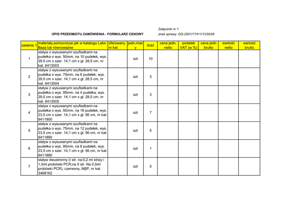 Załącznik nr 1 OPIS PRZEDMIOTU ZAMÓWIENIA - FORMULARZ CENOWY zadanie 1 1 2 3 4 5 6 7 materiały pomocnicze jak w katalogu Labo oferowany jedn.miar Baza lub równowaŜne nr kat y statyw z wysuwanymi szufladkami na pudełka o wys. 50mm, na 10 pudełek, wys. szt 29,5 cm x szer. 14,1 cm x gł. 28,5 cm, nr kat. 6413003 statyw z wysuwanymi szufladkami na pudełka o wys. 75mm, na 6 pudełek, wys. szt 29,5 cm x szer. 14,1 cm x gł. 28,5 cm, nr kat. 6413004 statyw z wysuwanymi szufladkami na pudełka o wys. 95mm, na 4 pudełka, wys. szt 29,5 cm x szer. 14,1 cm x gł. 28,5 cm, nr kat. 6413005 statyw z wysuwanymi szufladkami na pudełka o wys. 50mm, na 16 pudełek, wys. szt 23,5 cm x szer. 14,1 cm x gł. 56 cm, nr kat. 6411900 statyw z wysuwanymi szufladkami na pudełka o wys. 75mm, na 12 pudełek, wys. szt 23,5 cm x szer. 14,1 cm x gł. 56 cm, nr kat. 6411890 statyw z wysuwanymi szufladkami na pudełka o wys. 95mm, na 8 pudełek, wys. szt 23,5 cm x szer. 14,1 cm x gł. 56 cm, nr kat. 6411880 statyw dwustronny (I str. na:0,2 ml stripy i 1,5ml probówki PCR;na II str. Na 0,5ml szt probówki PCR), czerwony, MβP, nr kat. 3468162 znak sprawy: DG-2501/17411/1235/08 ilość 10 3 3 7 5 1 5 cena jedn. podatek cena jedn netto VAT (w %) brutto wartość netto wartość brutto 8 statyw dwustronny (I str. na:0,2 ml stripy i 1,5ml probówki PCR;na II str. Na 0,5ml probówki PCR), fioletowy, MβP, nr kat. 3468157 materiały pomocnicze jak w katalogu zadanie 2 Duran lub równowaŜne butelki laboratoryjne z gwintem, nr kat. 1 215L1577 szt oferowany jedn.miar nr kat y szt materiały pomocnicze jak w katalogu Fluke oferowany jedn.miar zadanie 3 lub równowaŜne nr kat y 1 pirometr FoodPro, zakres temperatury -30 do 200ºC, dokładność (Przy zakładanej zewnętrznej temperaturze eksploatacji 23ºC ±2º) pomiędzy 0 i 65ºC: ±1ºC poniŜej 0ºC: ±1º ±0,1 stopień/stopnia powyŜej 65ºC): ±1,5% odczytu, minimalny rozmiar obiektu docelowego ø 12 mm szt materiały pomocnicze jak w katalogu MPW oferowany jedn.miar zadanie 4 lub równowaŜne nr kat y miniwirówka MPW-15, posiadająca wirnik kątowy 6 x 1,5/2,2 ml wraz z wkładkami 1 redukcyjnymi 0,4/0,5 ml oraz wirnik kątowy szt na 2 zestawy probówek szeregowych 8 x 0,2 ml materiały pomocnicze jak w katalogu zadanie 5 Medlab lub równowaŜne Pipetki Pasteura z polietylenu, 1 sterylizowane, nr kat. 76.1101.21S oferowany jedn.miar nr kat y op 3 ilość Ogółem cena jedn. podatek cena jedn netto VAT (w %) brutto wartość netto wartość brutto Ogółem cena jedn. podatek cena jedn netto VAT (w %) brutto wartość netto wartość brutto Ogółem cena jedn. podatek cena jedn netto VAT (w %) brutto wartość netto wartość brutto Ogółem cena jedn. podatek cena jedn netto VAT (w %) brutto wartość netto wartość brutto 3 ilość 2 ilość 2 ilość 4 2 3 4 5 6 7 8 9 10 Probówki o poj. 11ml z PP, zgranulatem do separacji surowicy i przyspieszaczem wykrzepiania krwi, op./200szt., nr kat. 32.1100.11E pipeta tłokowa zmienno-pojemnościowa Microlit-V o zakresie 100-1000ul, nr kat. 87.1001.0 statyw do probówek typu Eppendorf, nr kat. 25.9020.1 pojemnik z przezroczystego tworzywa plexi (PMMA) z pokrywą do przechowywania wyrobów jenorazowego uŜytku, wym.: 310x260x300 mm, z mozliwością napełniania od góry i wyjmowania od dołu, nr kat. 07.2631.3 statyw do probówek ze styropianu, śr. Prob. 16mm, rzędy 10x10, 100 miejsc, nr kat. 28.1699.0 statyw do probówek ze styropianu, śr. Prob. 12mm, rzędy 10x10, 100 miejsc, 2szt/op, nr kat. 28.1699.0 statyw do probówek autoklawowalny z polipropylenu, śr. Prob. 11-13mm, 90 miejsc, 6 rzędów, nr kat. 28.1390.1 statyw do probówek autoklawowalny z polipropylenu, śr. Prob. 16-20mm, 40 miejsc, 4 rzędy, nr kat. 28.2040.1 probówki do transportu i przechowywania próbek z polistyrenu (PS), poj. 15ml, wym. 35x33mm, z zakrętka, przezroczyste, 500szt/op, nr kat. 24.4015.0 op 15 szt 1 szt 3 szt 2 szt 5 op 5 szt 5 szt 5 op 5 11 probówki do transportu i przechowywania próbek z polistyrenu (PS), poj. 30ml, wym. 35x50mm, z zakrętka, przezroczyste, 500szt/op, nr kat. 24.4030.0 op 5 12 probówki do transportu i przechowywania próbek z polistyrenu (PS), poj. 100ml, wym. 65x55mm, z zakrętka, przezroczyste, 250szt/op, nr kat. 24.4100.0 op 5 13 probówki do transportu i przechowywania próbek z polistyrenu (PS), poj. 25ml, z wieczkiem i łopatką, 100szt/op, nr kat. 24.0201.1 op 4 materiały pomocnicze jak w katalogu zadanie 6 Labart lub równowaŜne 1 2 3 4 5 6 7 8 paski wskaźnikowe pH-Fix, zakres pH 0.06.0, op. a'100 pasków, nr kat. 0404-00071 paski wskaźnikowe pH-Fix, zakres pH 4.510.0, op. a'100 pasków, nr kat. 040400073 paski wskaźnikowe pH-Fix, zakres pH 7.014.0, op. a'100 pasków, nr kat. 040400074 tacka na 100 szkiełek podstawowych z tworzywa ABS wym. 76 x 26 mm, nr kat. 0118-00030 pokrywa do tacki na szkiełka, nr kat. 011800031 łyzeczka stalowa na chemikalia dł. 300 mm, nr kat. 0129-00166 kroplomierz z tworzywa LDPE z zatyczką o poj. 50ml, nr kat. 0103-00506 noŜyczki stalowe, nr kat. 0130-00029 oferowany jedn.miar nr kat y ilość op 1 op 1 op 1 szt 2 szt 2 szt 4 szt 5 szt 15 Ogółem cena jedn. podatek cena jedn netto VAT (w %) brutto wartość netto wartość brutto 9 10 11 noŜyczki stalowe, nr kat. 0130-00023 szpatułki z metalu, nr kat. 0129-00031 szpatułki z metalu, nr kat. 0129-00028 szt szt szt 15 10 10 12 pojemnik transportowy, nr kat. 0135-00092 szt 5 13 laboratoryjny wózek transportowy, nr kat. 0138-00003 szt 1 Ogółem zadanie 7 materiały pomocnicze jak w katalogu Roth oferowany jedn.miar lub równowaŜne nr kat y ilość 1 statyw na probówki Rotilabo, nr kat. 5453.1 szt 2 2 statyw kombi 4w1 Rotilabo, nr kat. K082.1 szt 5 3 statyw Rotilabo na probówki, nr kat. E272.1 szt 4 4 statyw Rotilabo na kriofiolki, nr kat. K551.1 szt 3 5 statyw na kuwety Rotilabo, nr kat. 9664.1 szt 1 6 pudełko na preparaty Rotilabo, nr kat. K532.1 szt 2 7 pojemniki do barwienia Rotilabo, nr kat. HA44.1 szt 2 szt